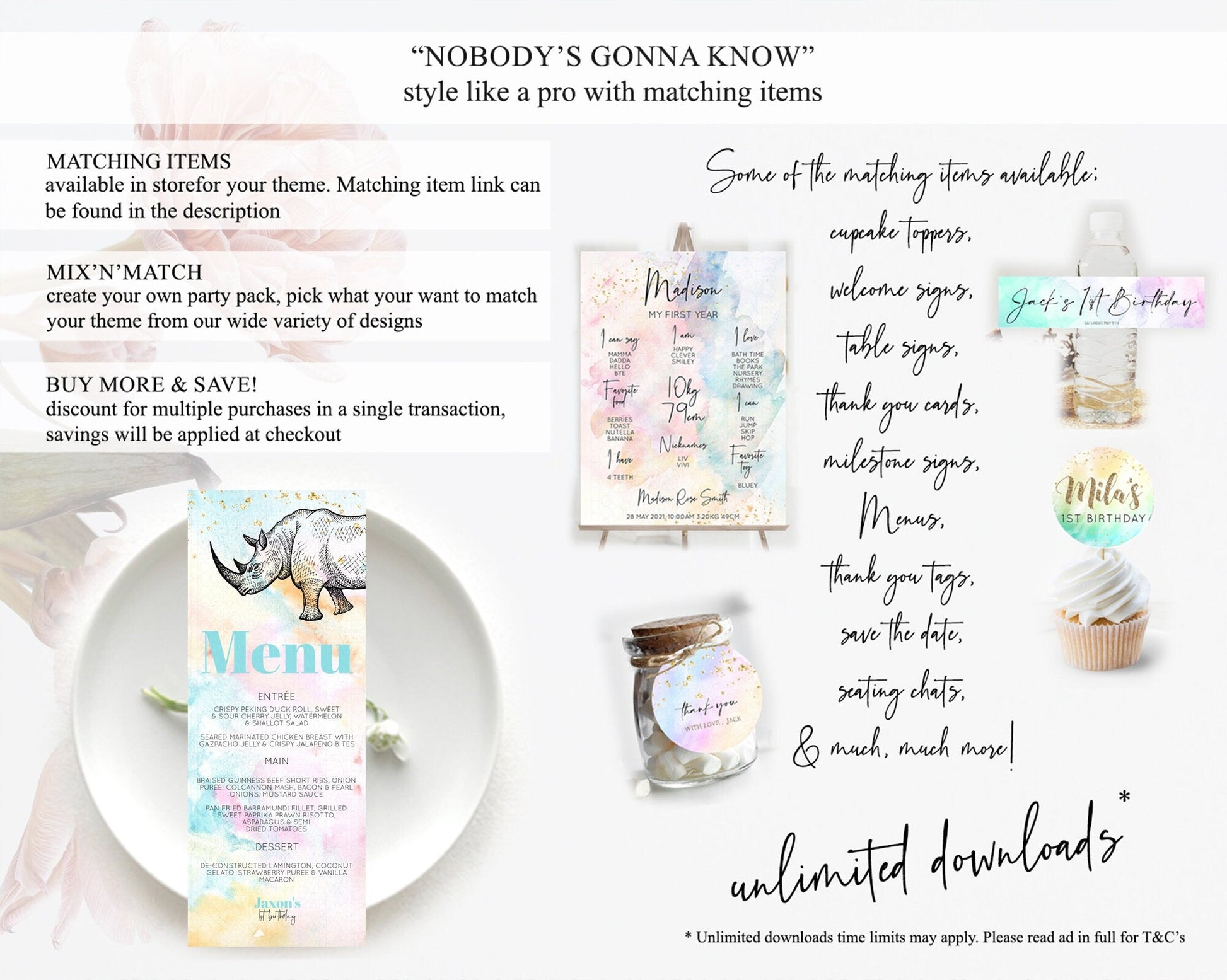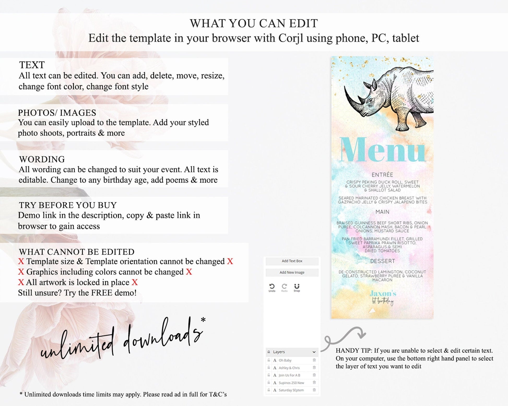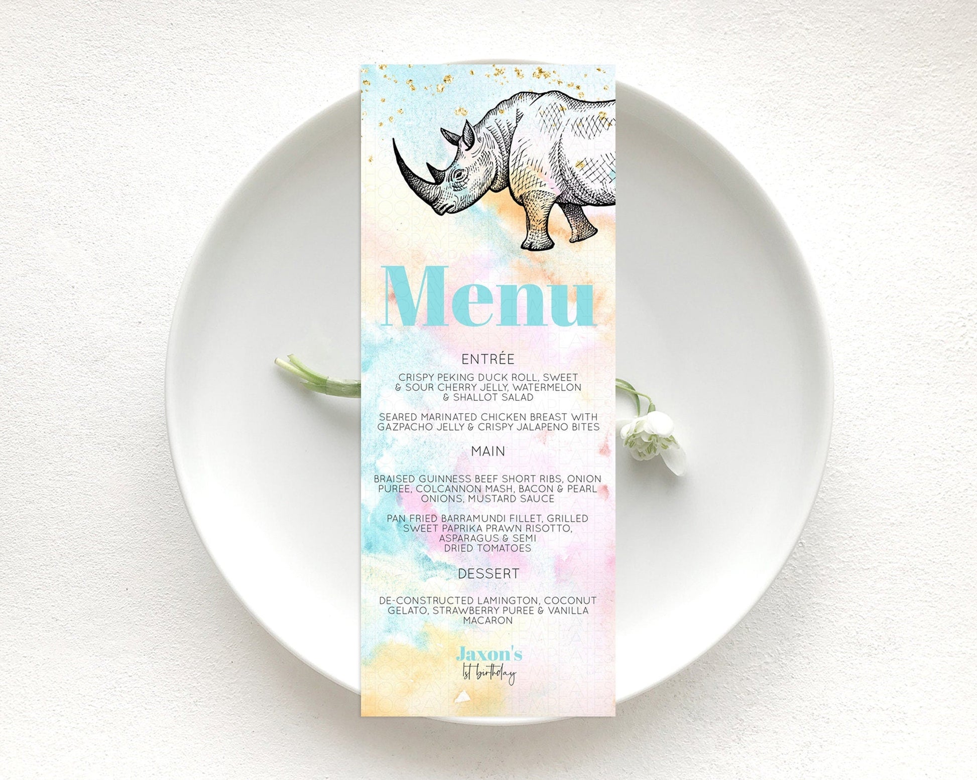 Pastel Rhino Menu Rainbow Rhino Menu Template Colorful Rainbow Safari Table Decor Pastel Dinner Dessert Menu Rhino Food Menu D10287