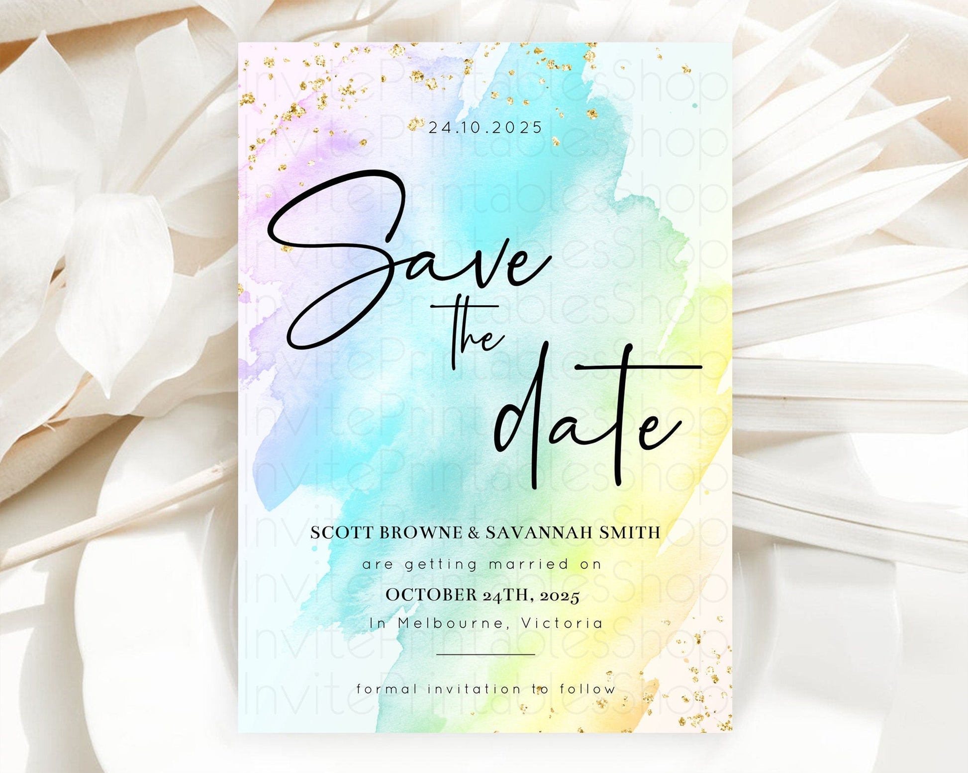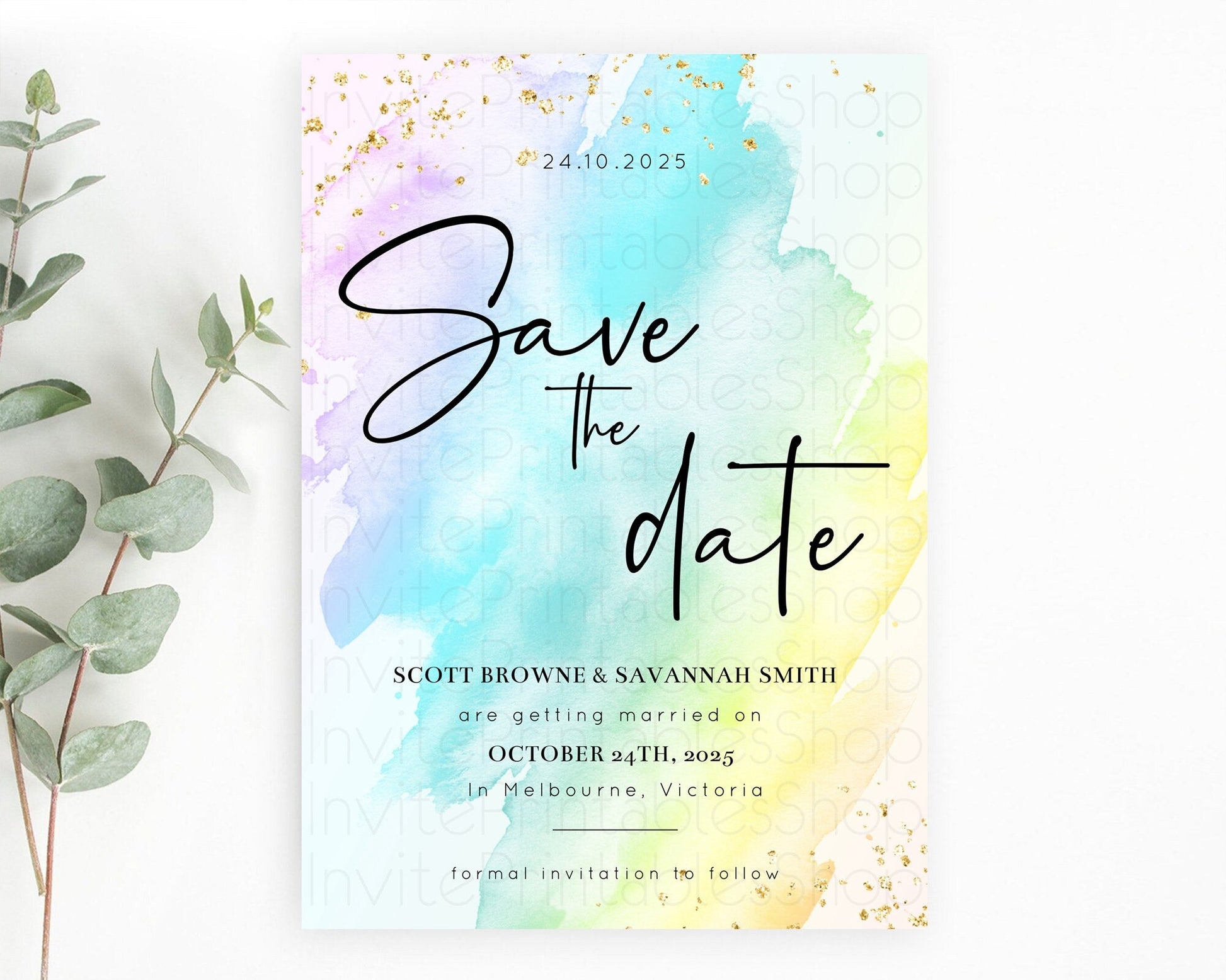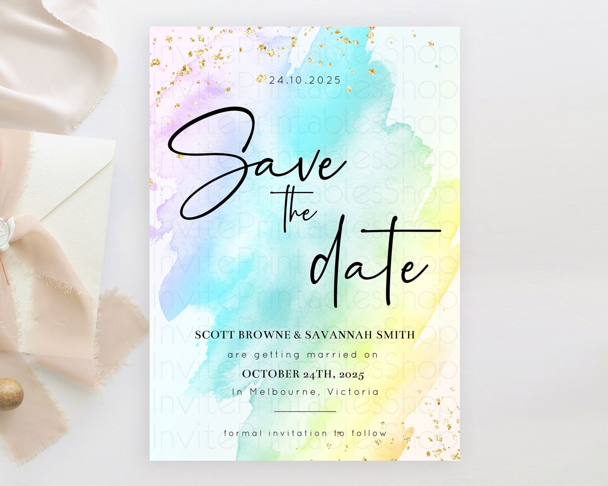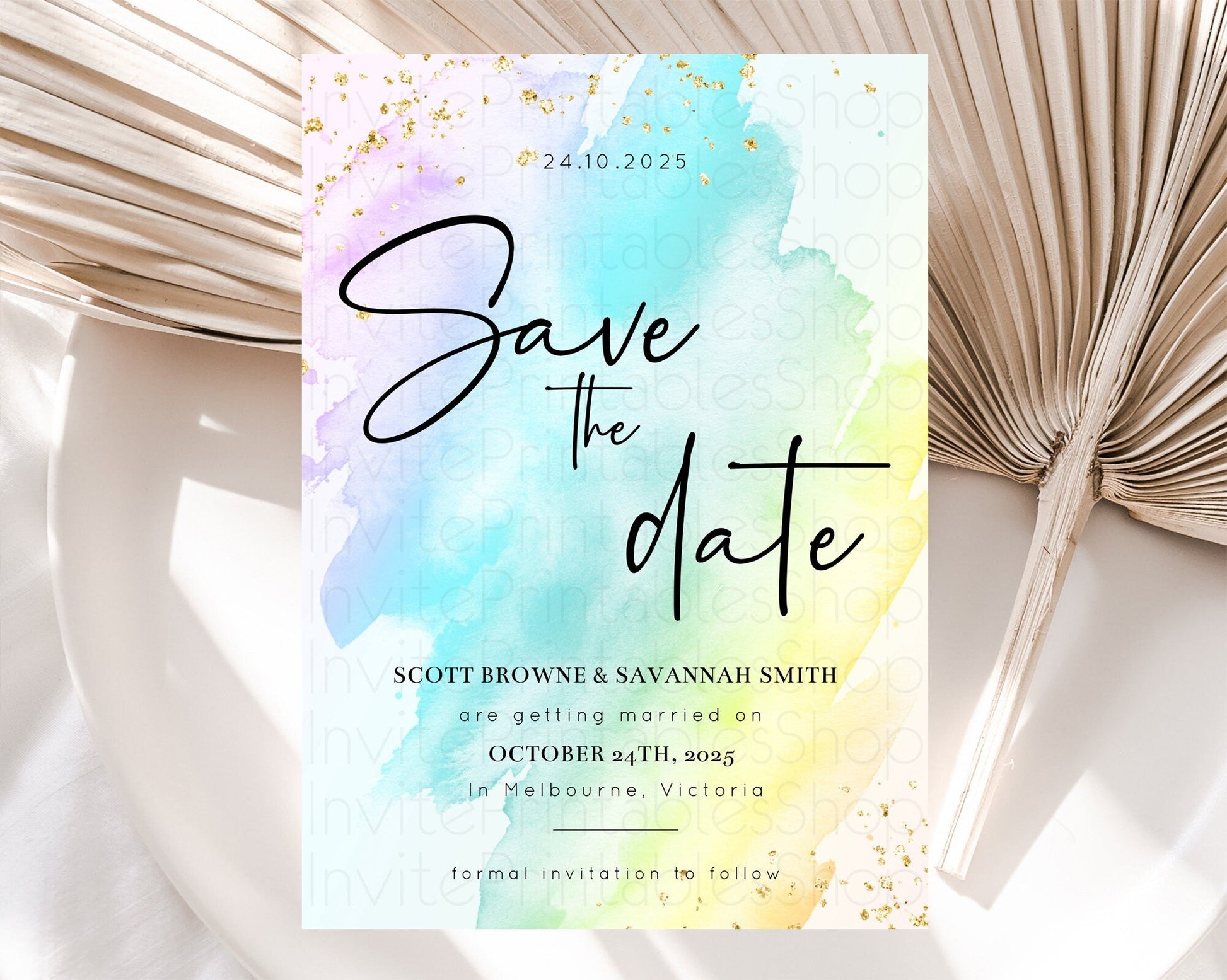 Pastel Save The Date Template Pastel Ombre Rainbow Watercolor Colorful Party For Birthday Baptism Baby Shower Wedding Bridal Shower D10171