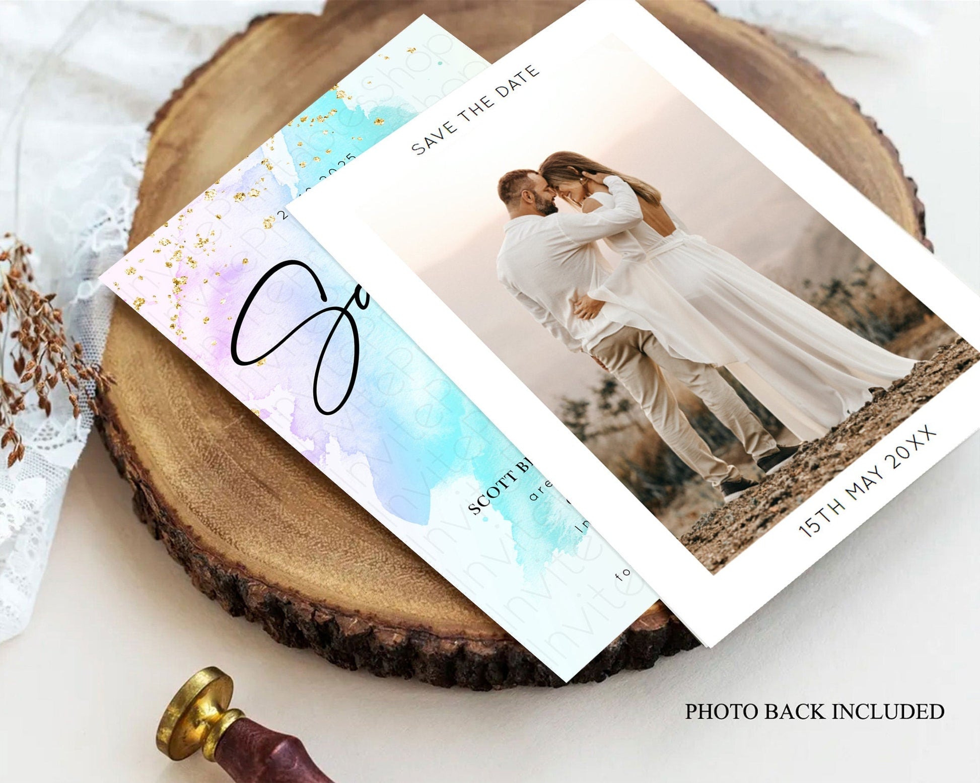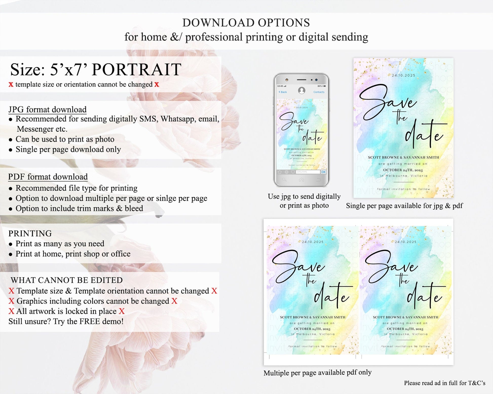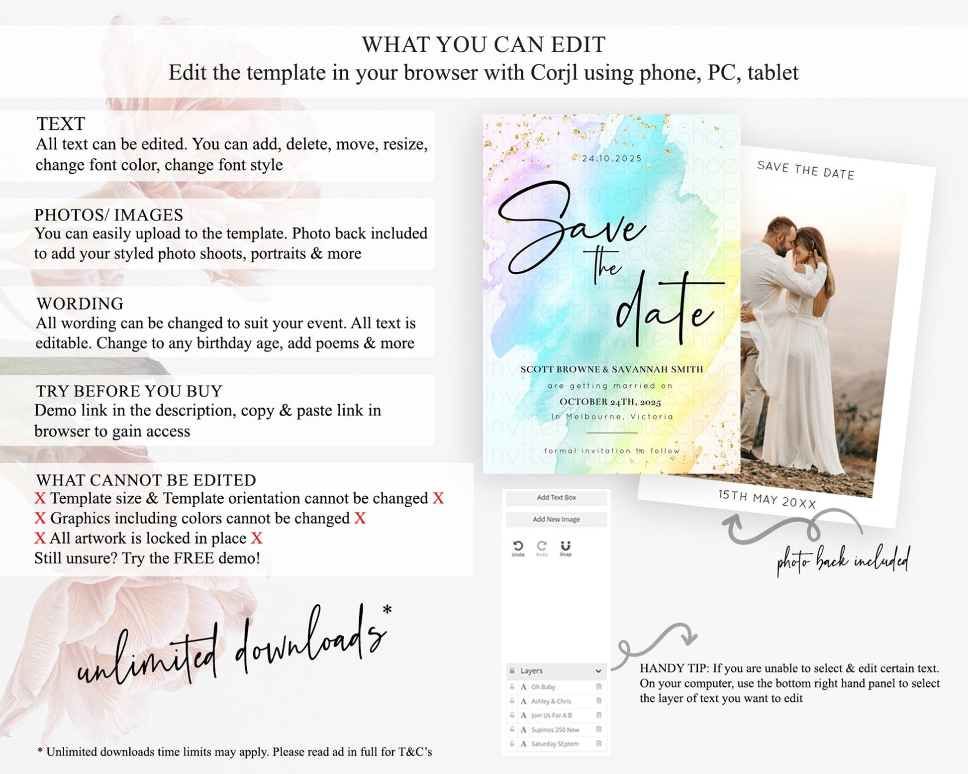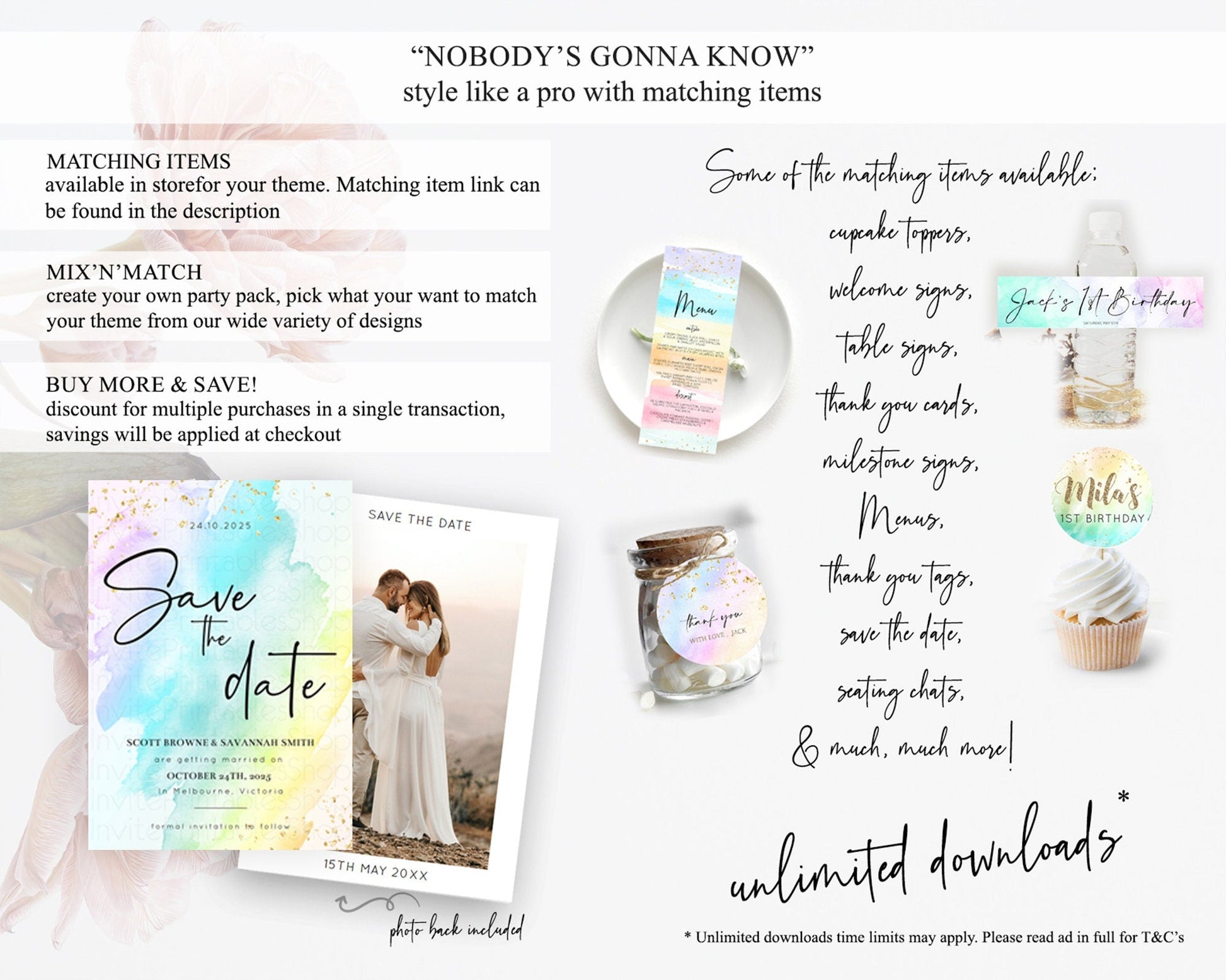 Pastel Save The Date Template Pastel Ombre Rainbow Watercolor Colorful Party For Birthday Baptism Baby Shower Wedding Bridal Shower D10171