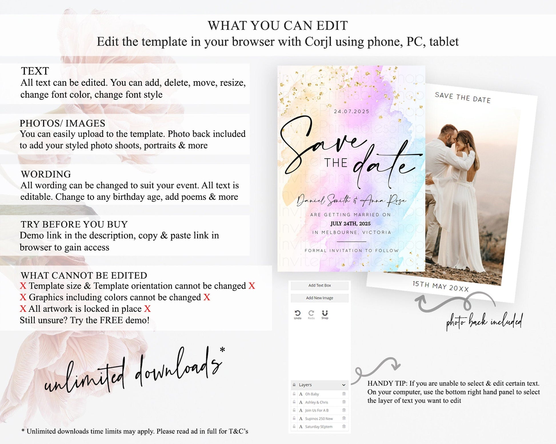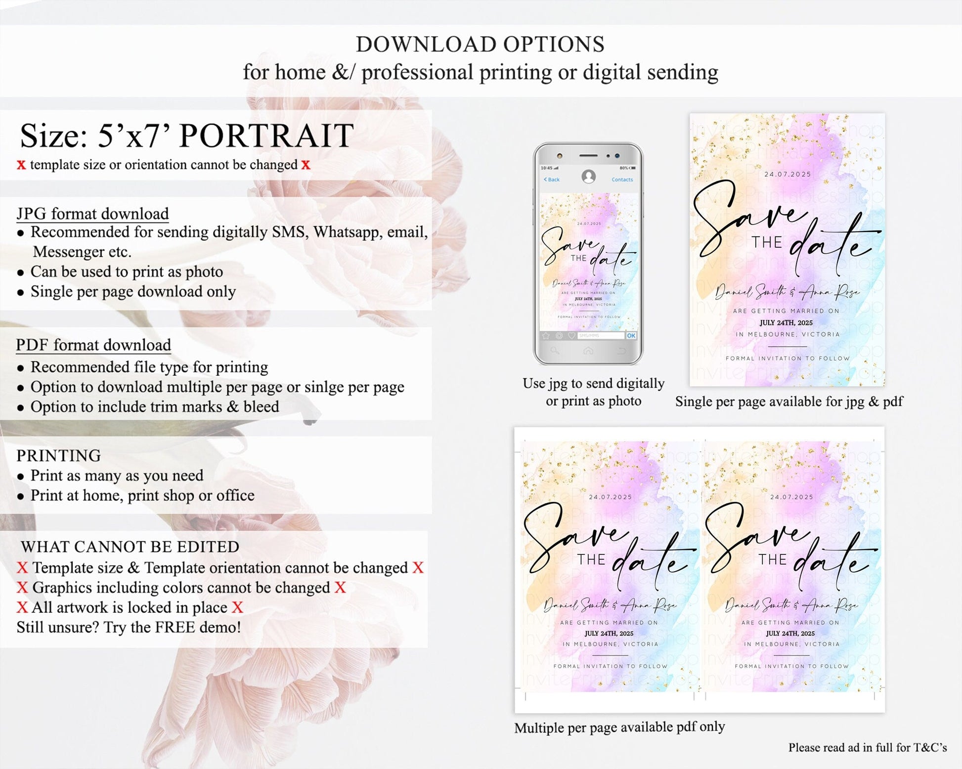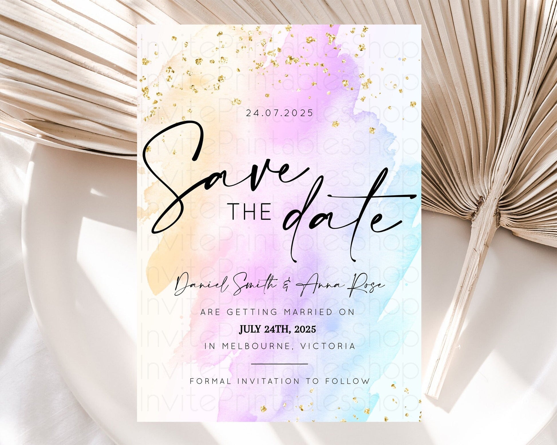 Pastel Save The Date Template Pastel Ombre Rainbow Watercolor Colorful Party For Birthday Baptism Baby Shower Wedding Bridal Shower D10175