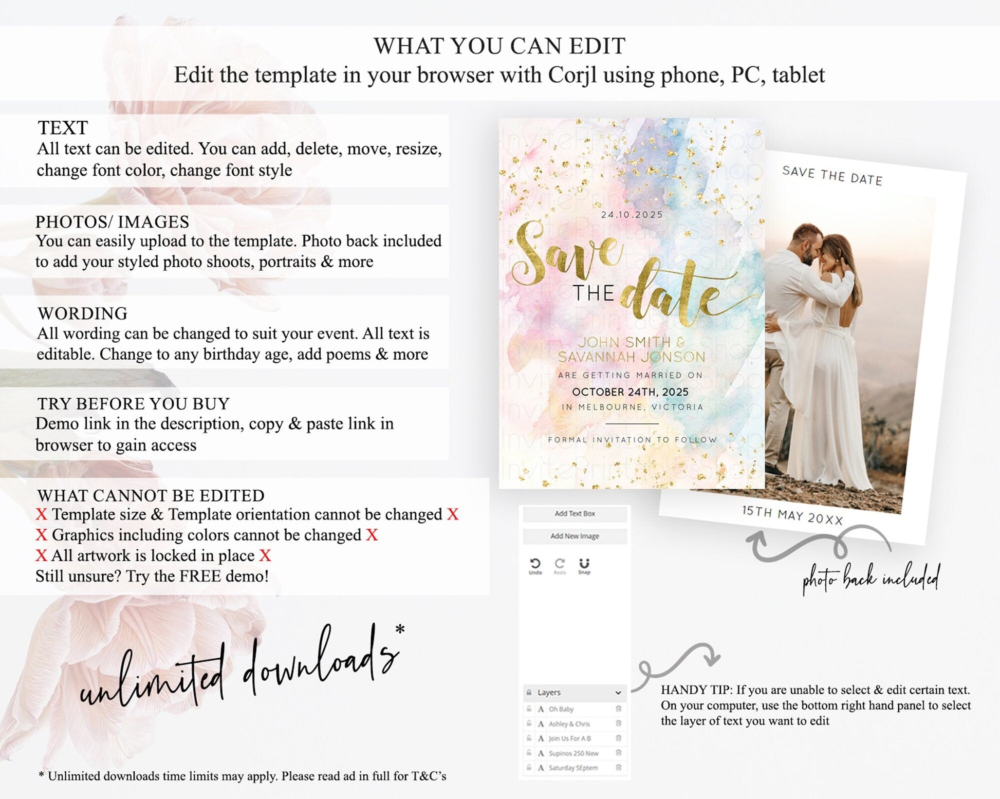 • Template size & orientation cannot be changed. Please use the demo link to confirm this product suits your needs.