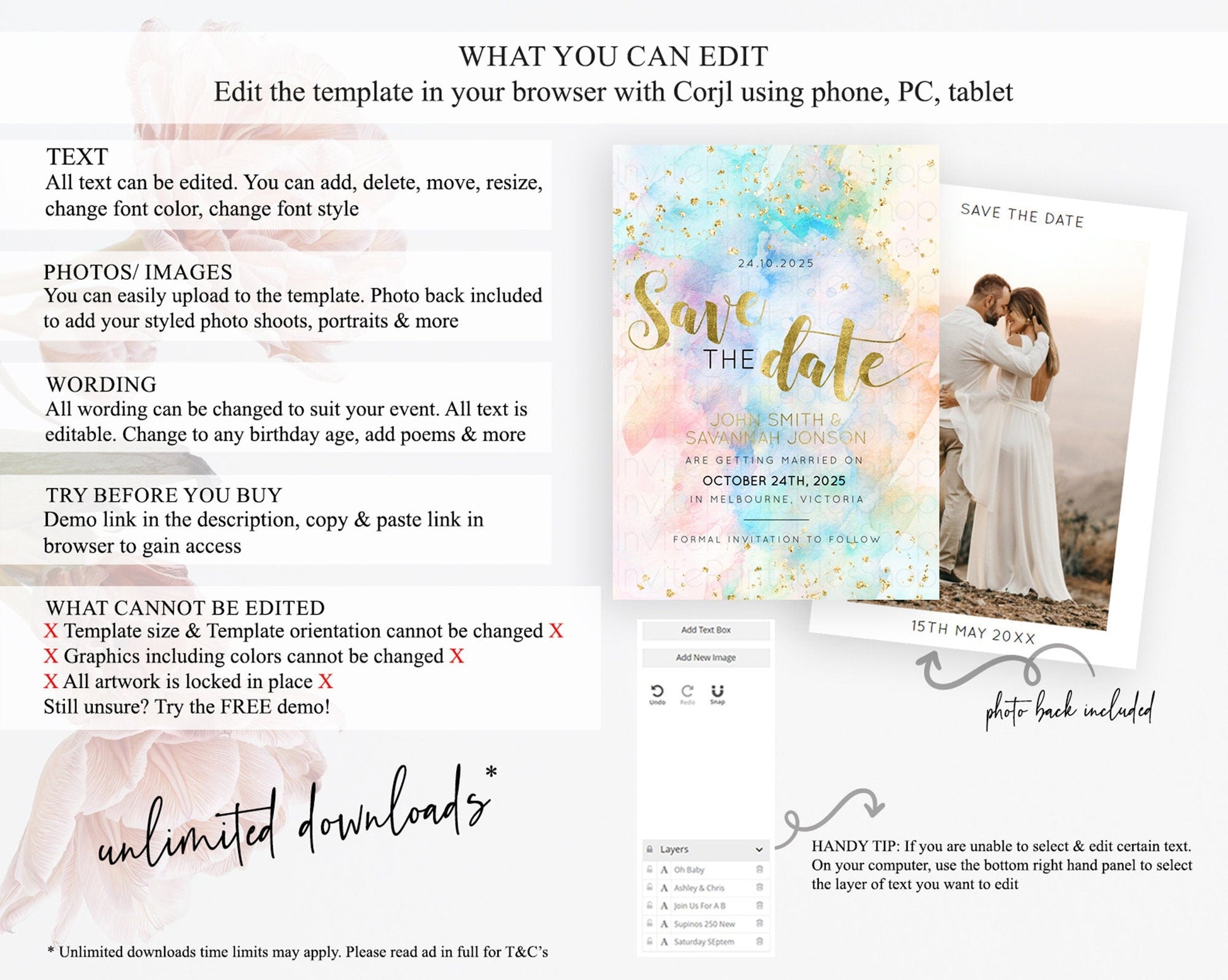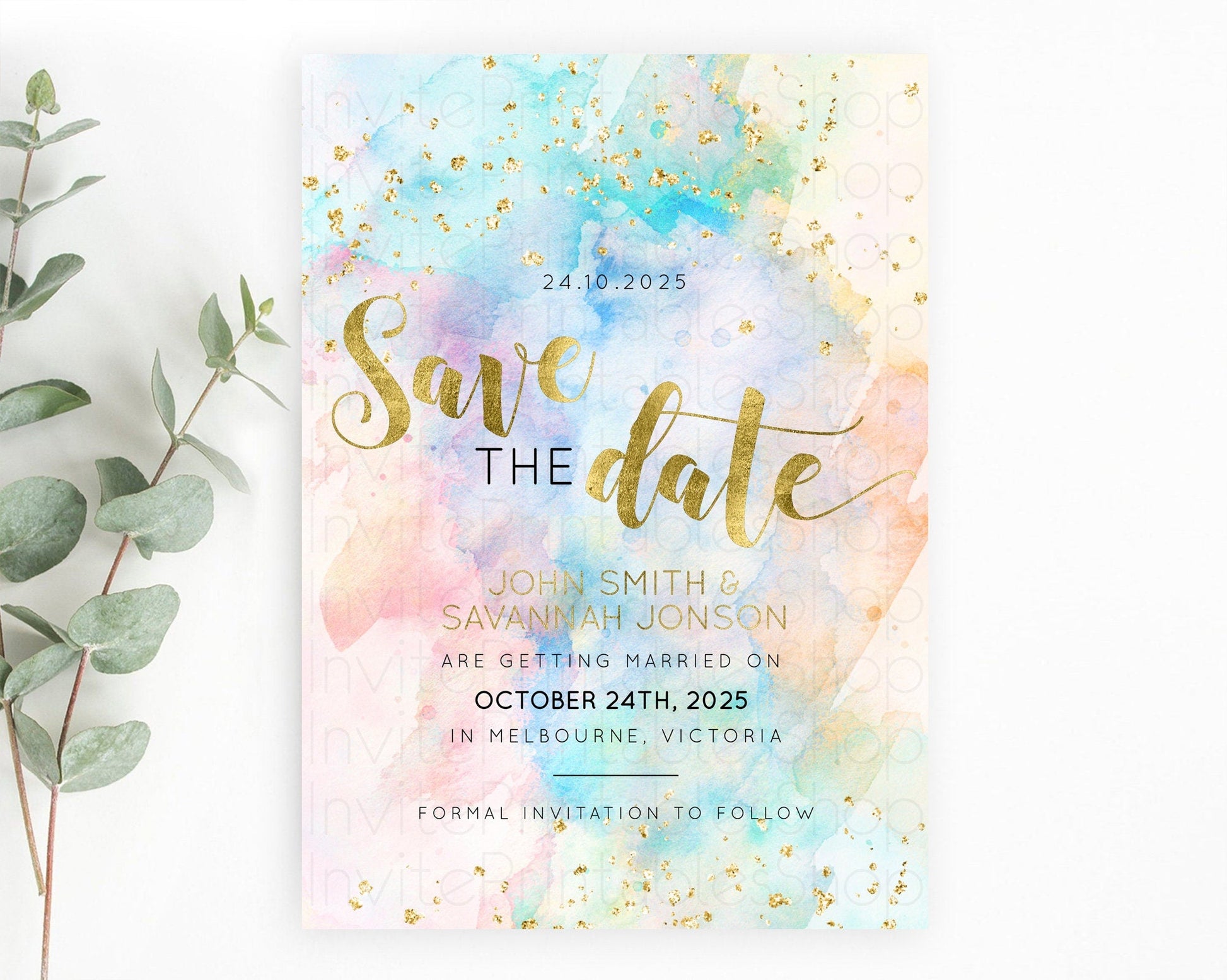 Pastel Save The Date Template Pastel Ombre Rainbow Watercolor Colorful Party For Birthday Baptism Baby Shower Wedding Bridal Shower D10272