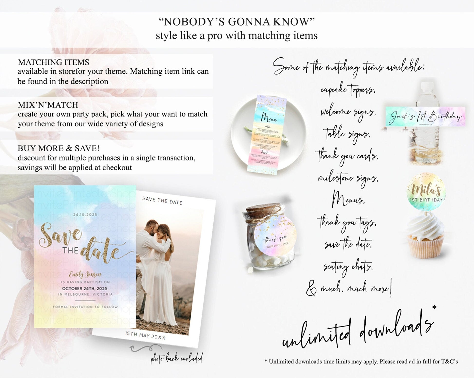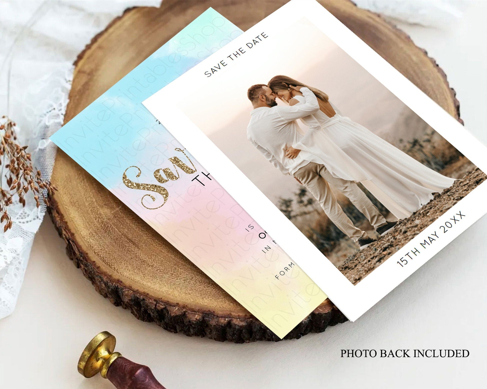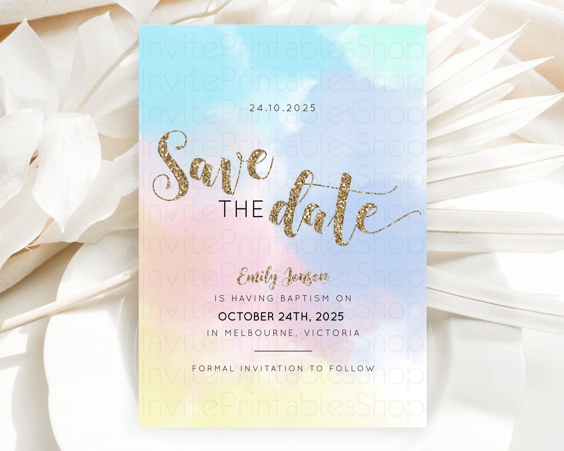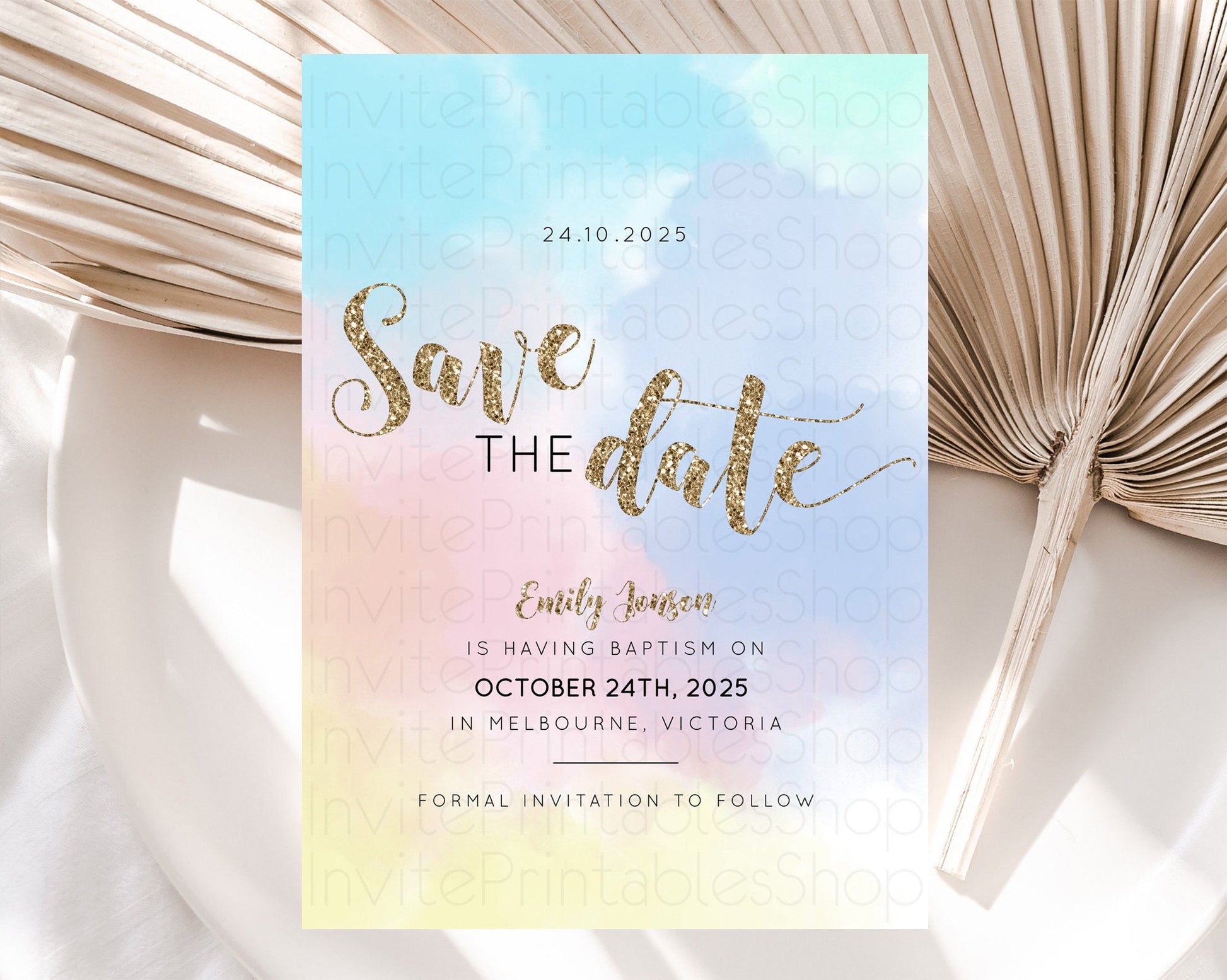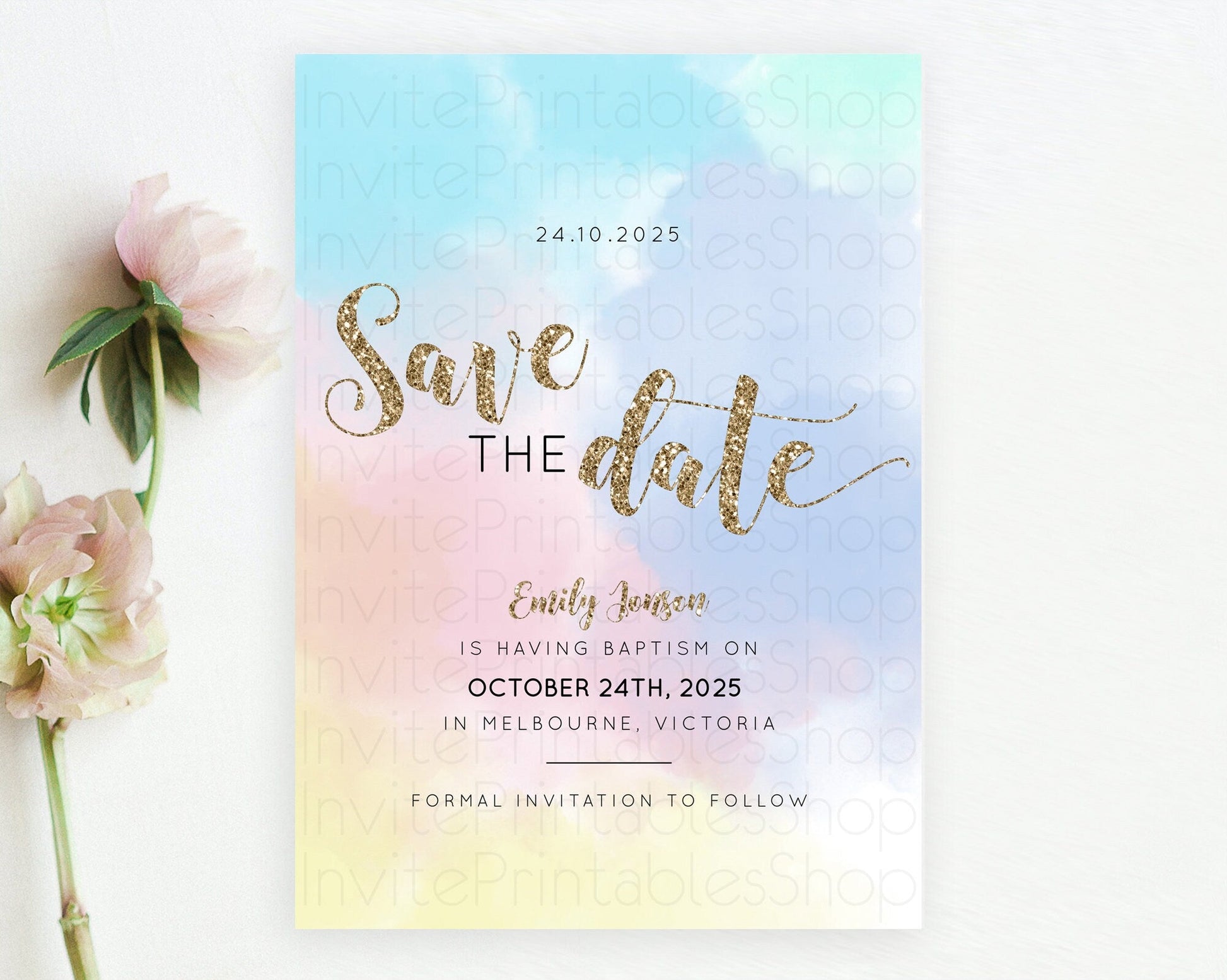 Pastel Save The Date Template Pastel Ombre Rainbow Watercolor Colorful Party For Birthday Baptism Baby Shower Wedding Bridal Shower D10378