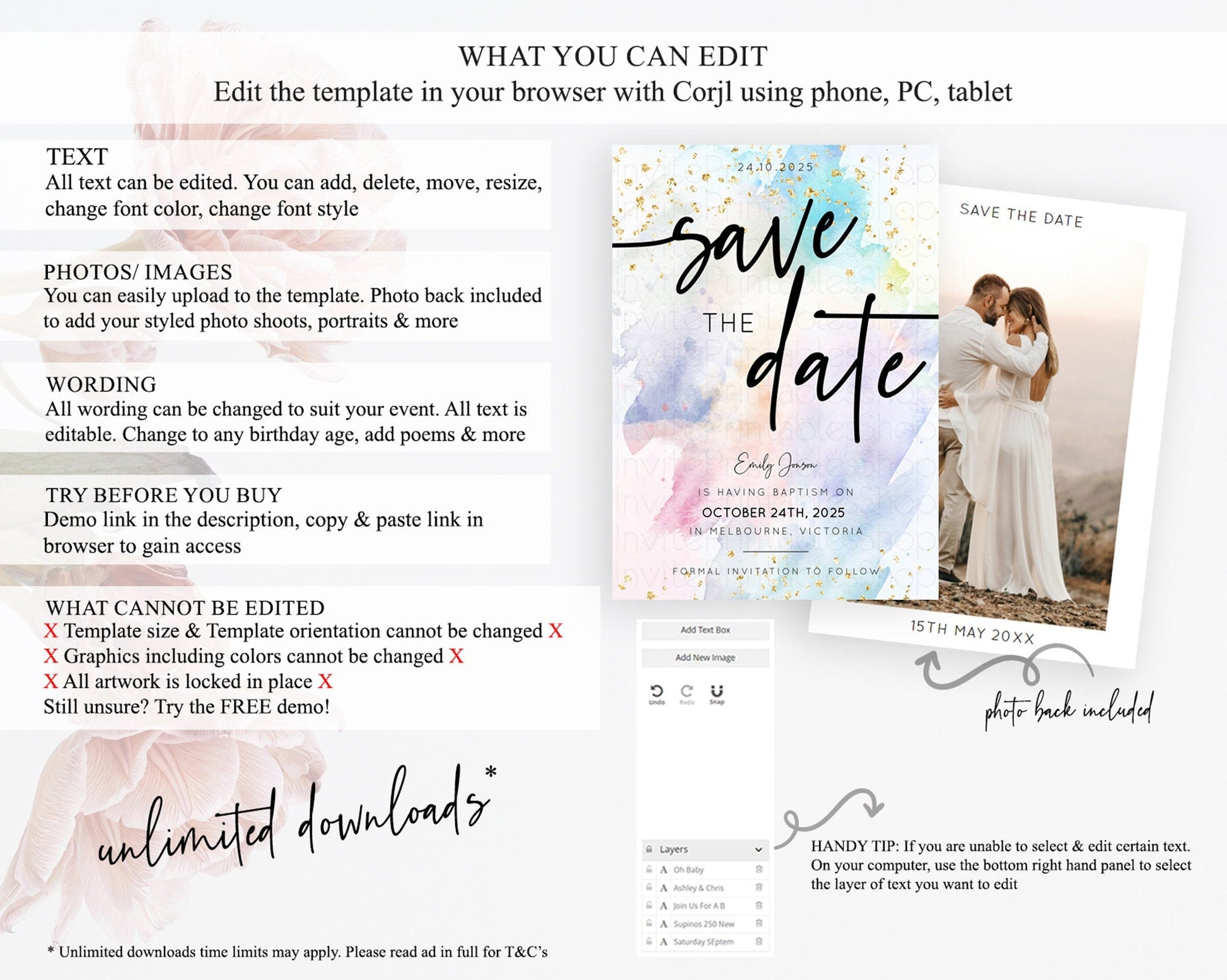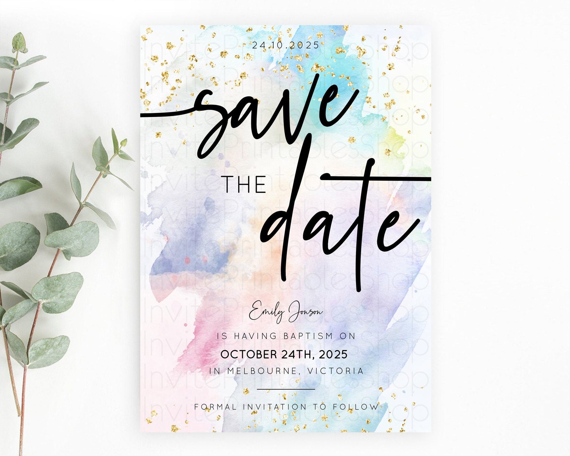 Pastel Save The Date Template Pastel Ombre Rainbow Watercolor Colorful Party For Birthday Baptism Baby Shower Wedding Bridal Shower D10424