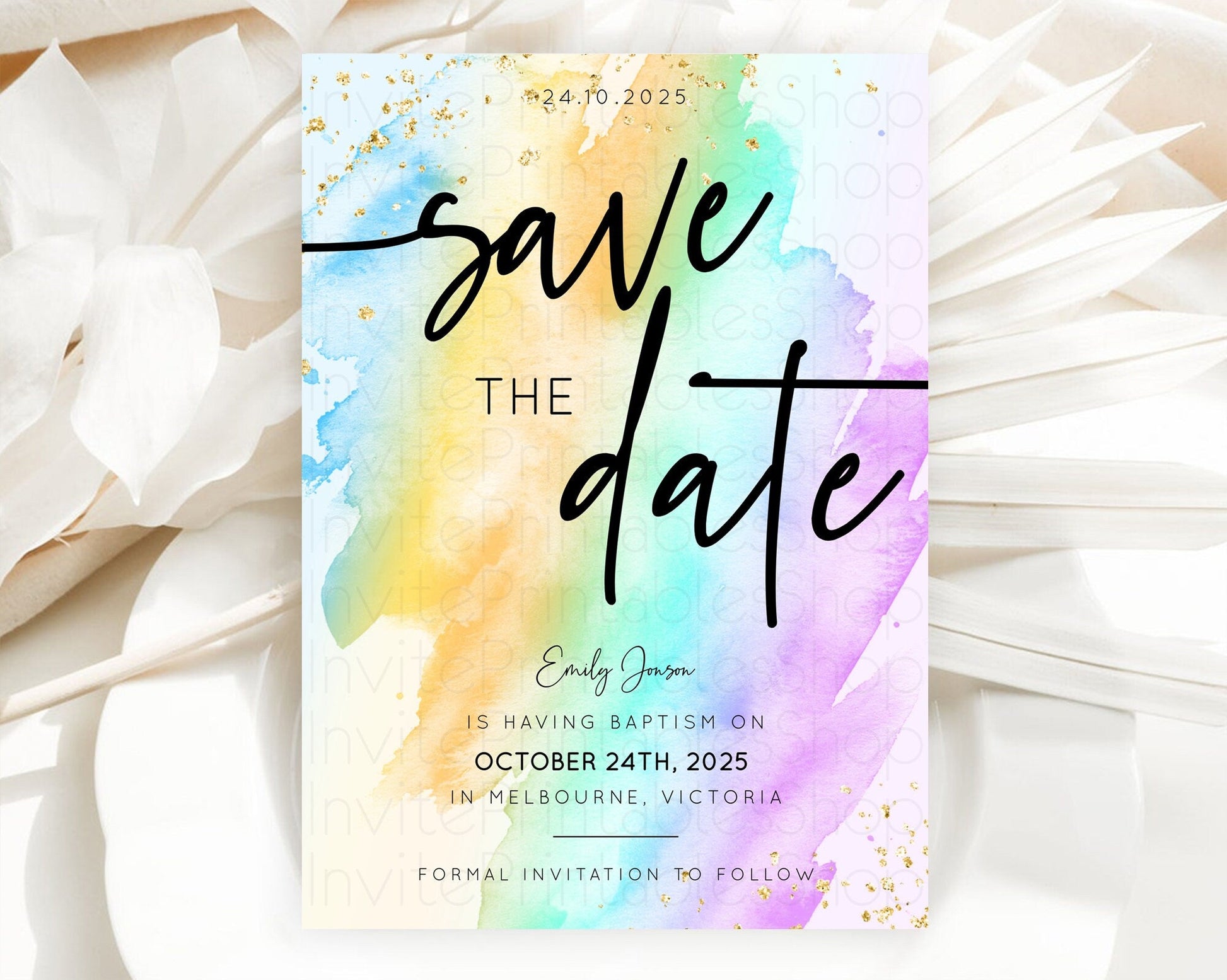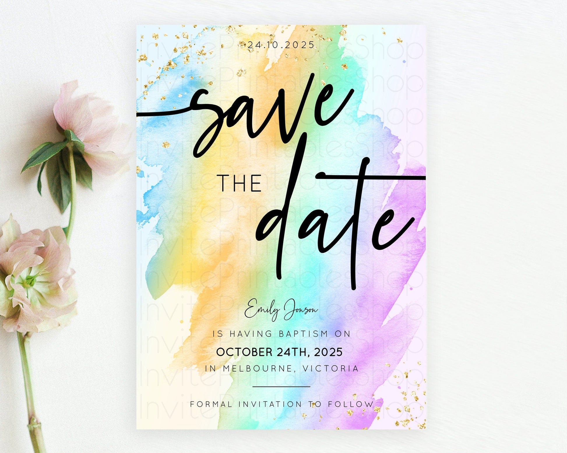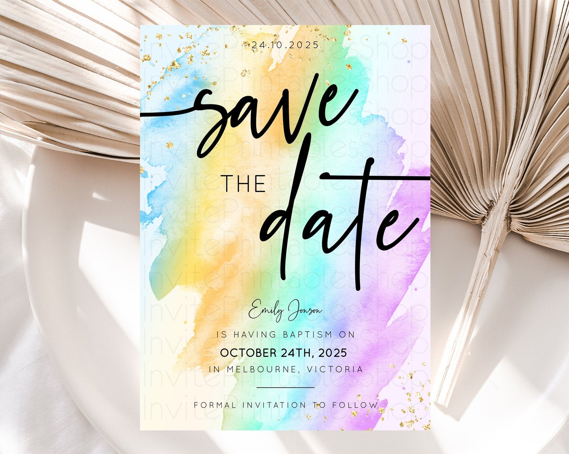 Pastel Save The Date Template Pastel Ombre Rainbow Watercolor Colorful Party For Birthday Baptism Baby Shower Wedding Bridal Shower D10425