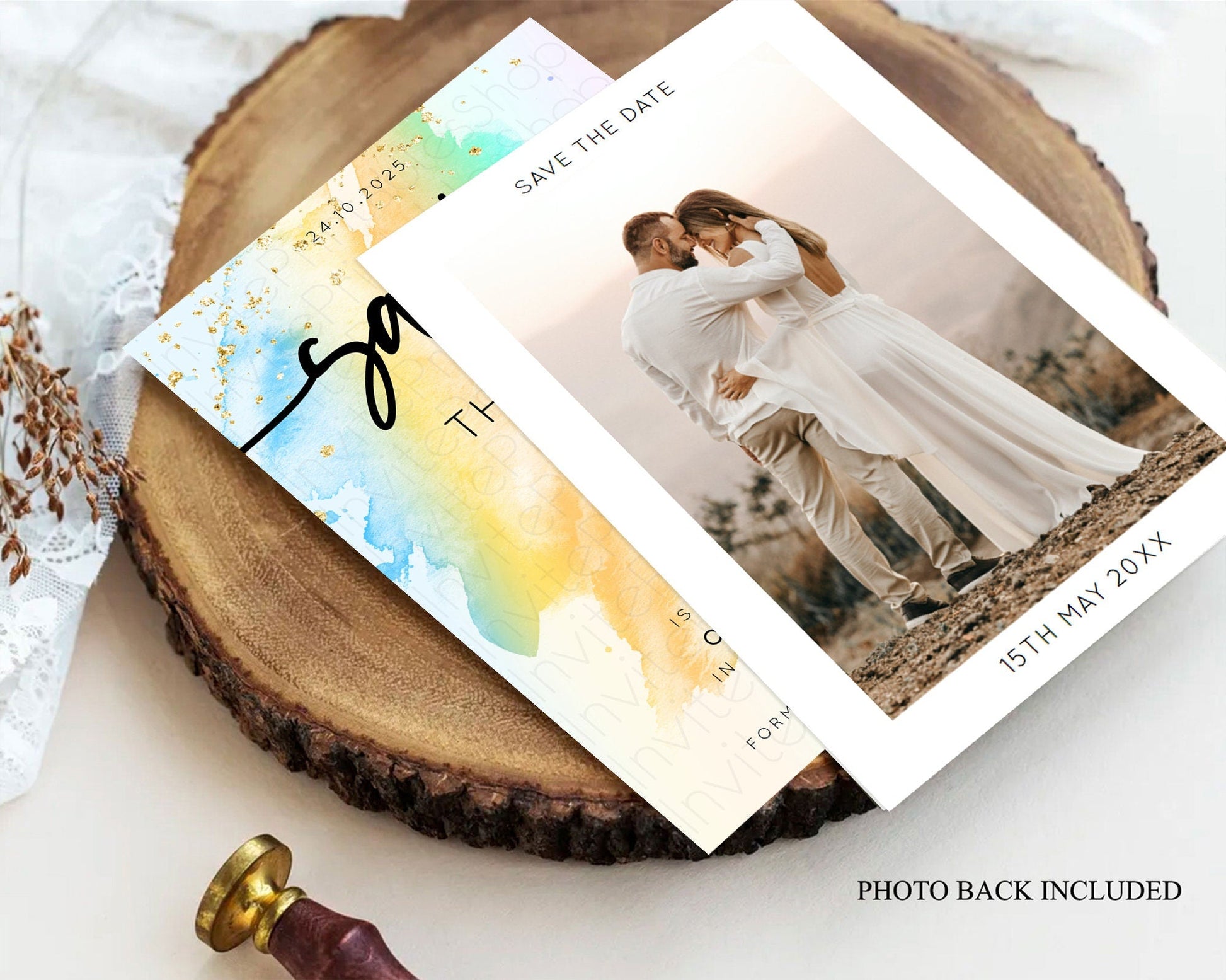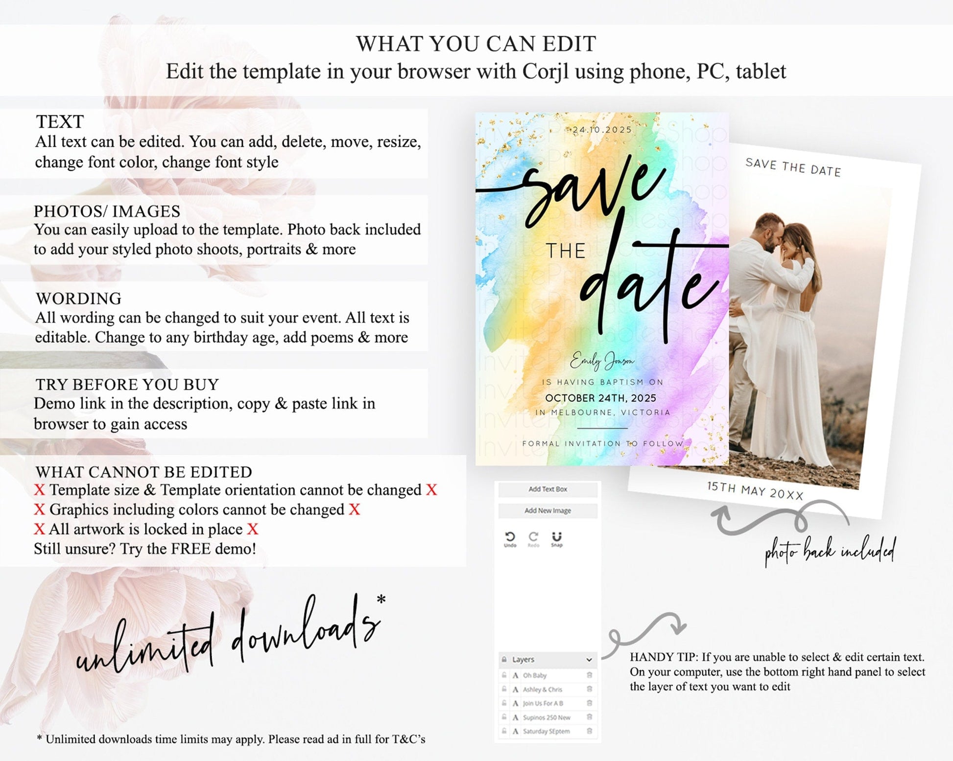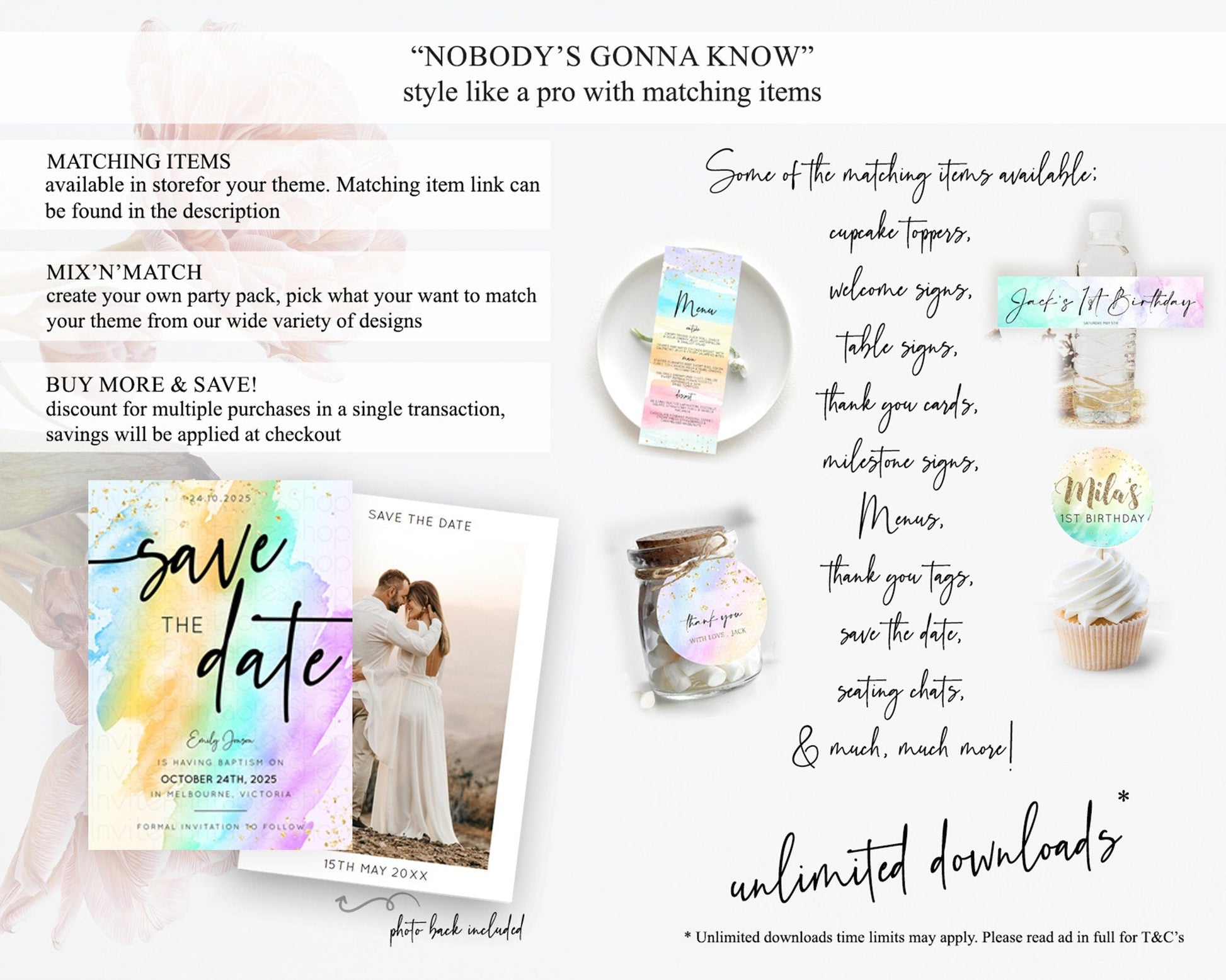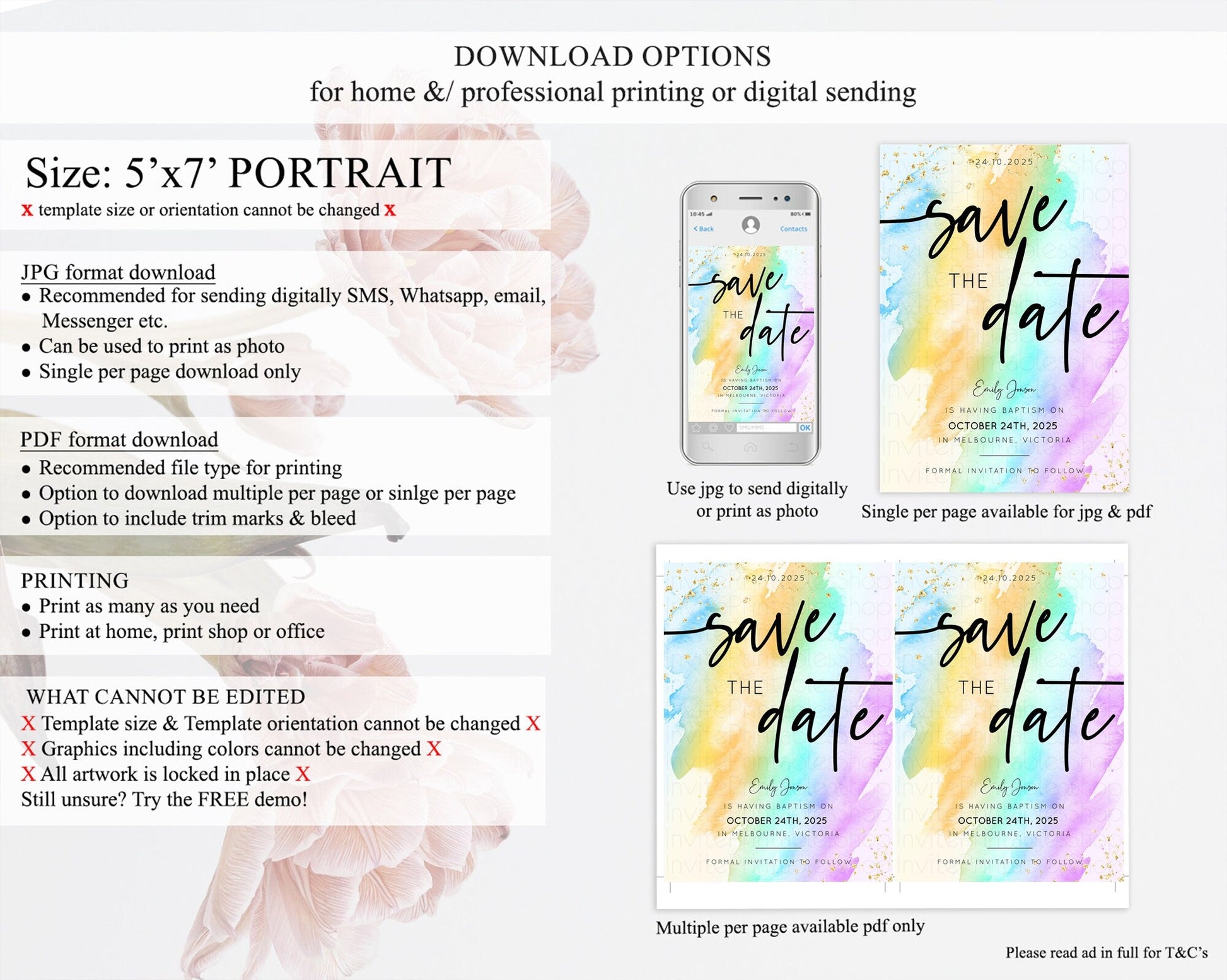 Pastel Save The Date Template Pastel Ombre Rainbow Watercolor Colorful Party For Birthday Baptism Baby Shower Wedding Bridal Shower D10425