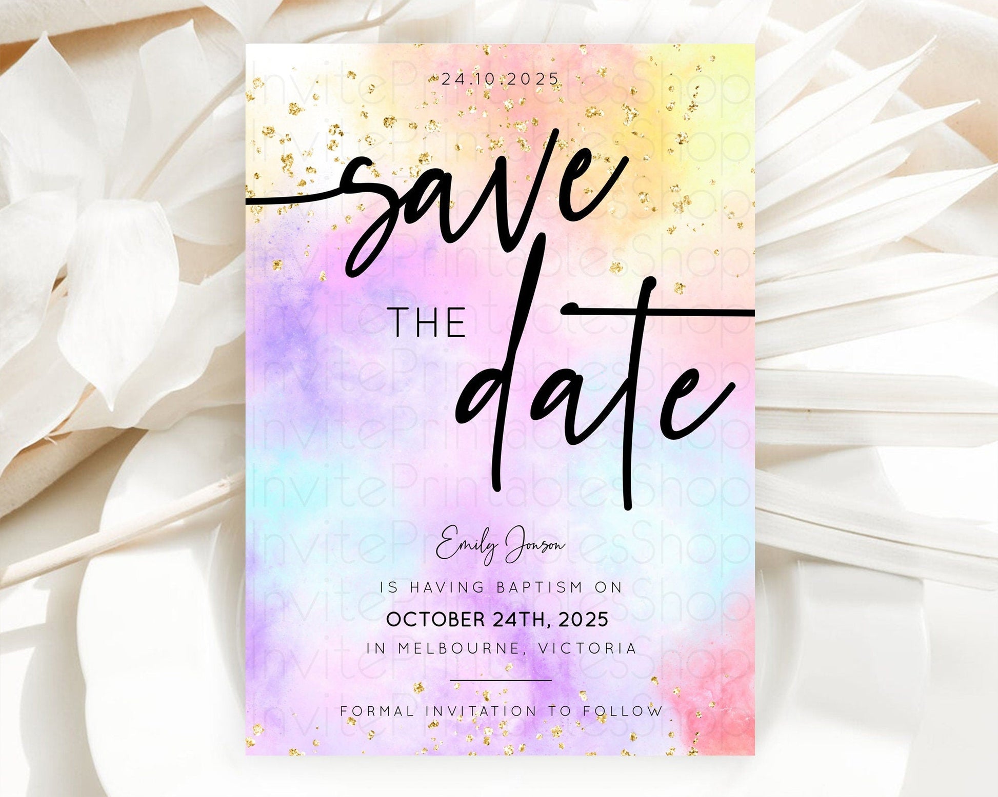 Pastel Save The Date Template Pastel Ombre Rainbow Watercolor Colorful Party For Birthday Baptism Baby Shower Wedding Bridal Shower D10437