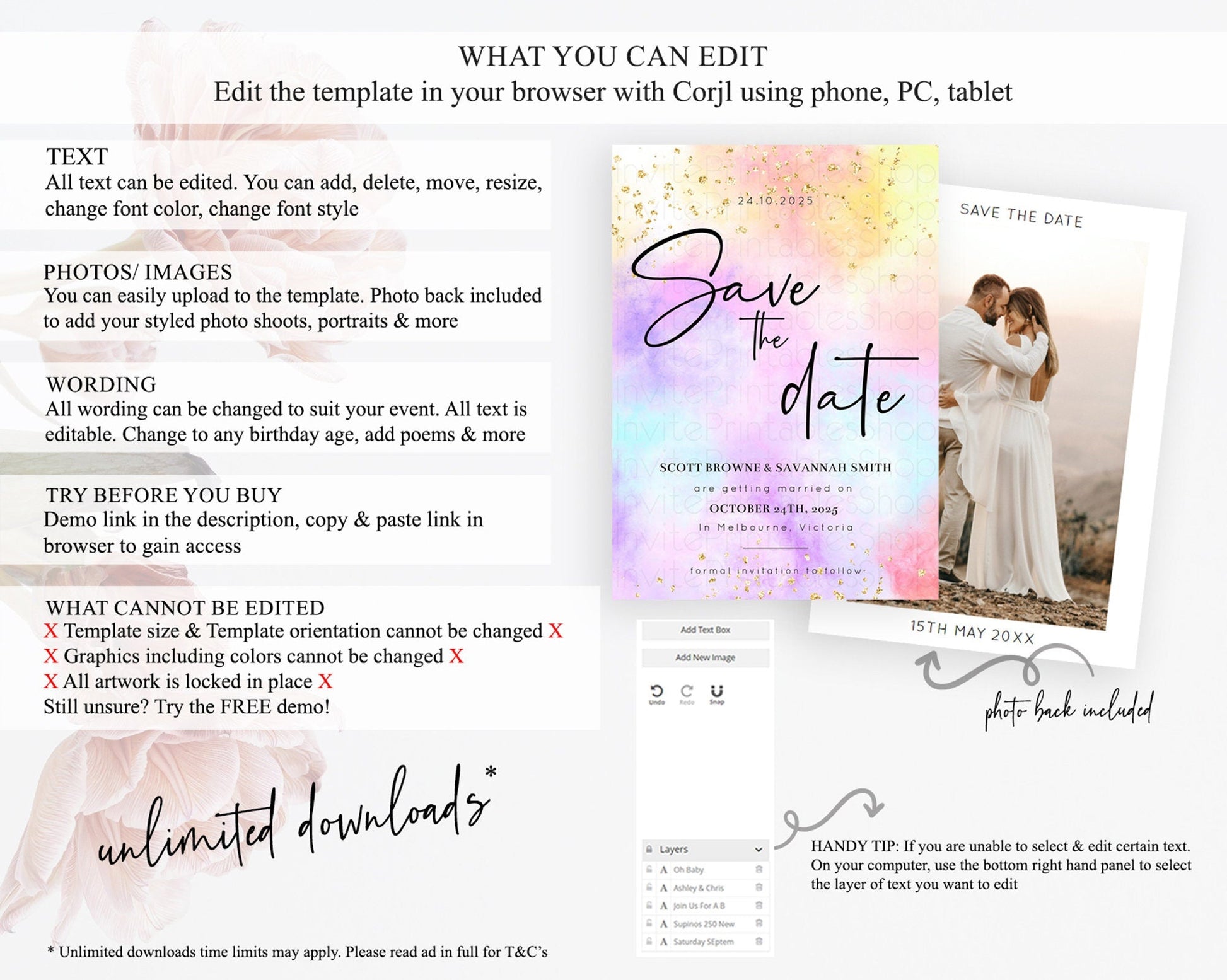 • Template size & orientation cannot be changed. Please use the demo link to confirm this product suits your needs.