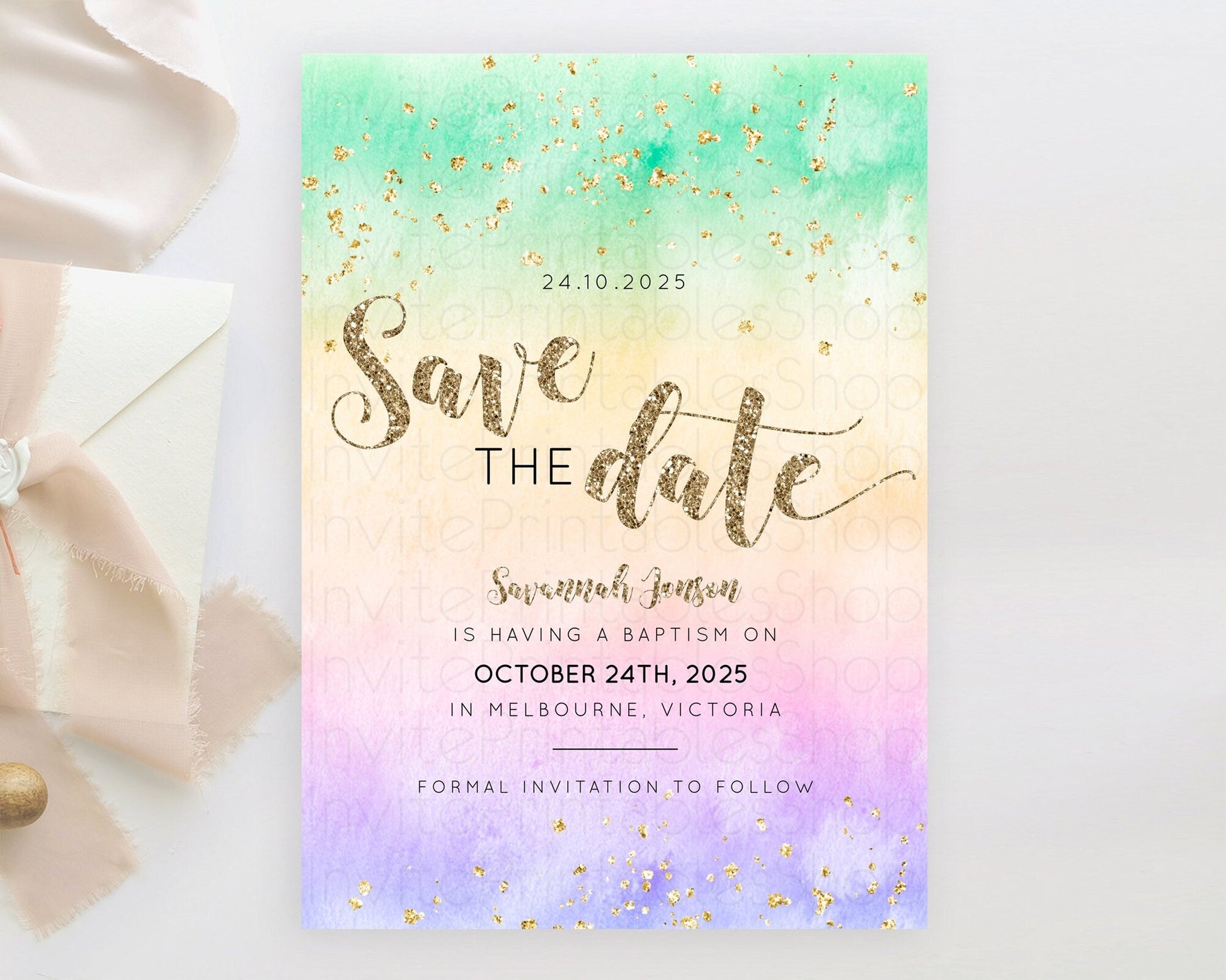 Pastel Save The Date Template Pastel Ombre Rainbow Watercolor Colorful Party For Birthday Baptism Baby Shower Wedding Bridal Shower D10478