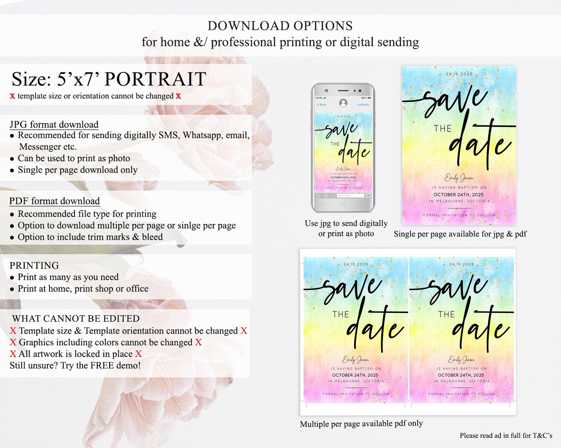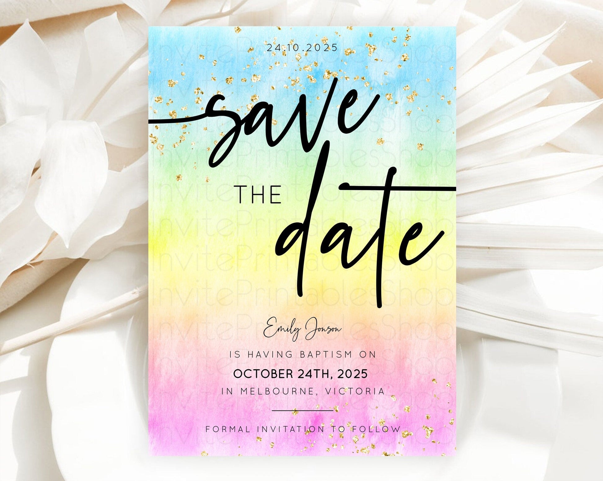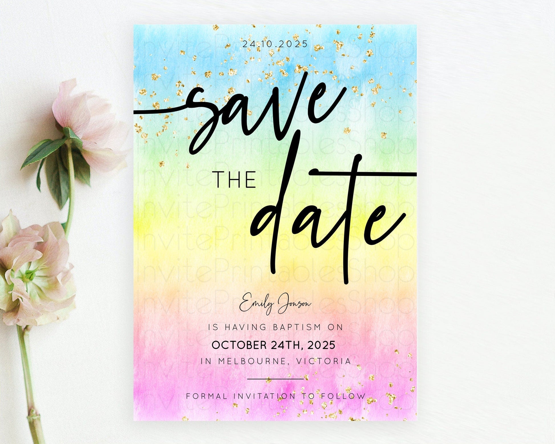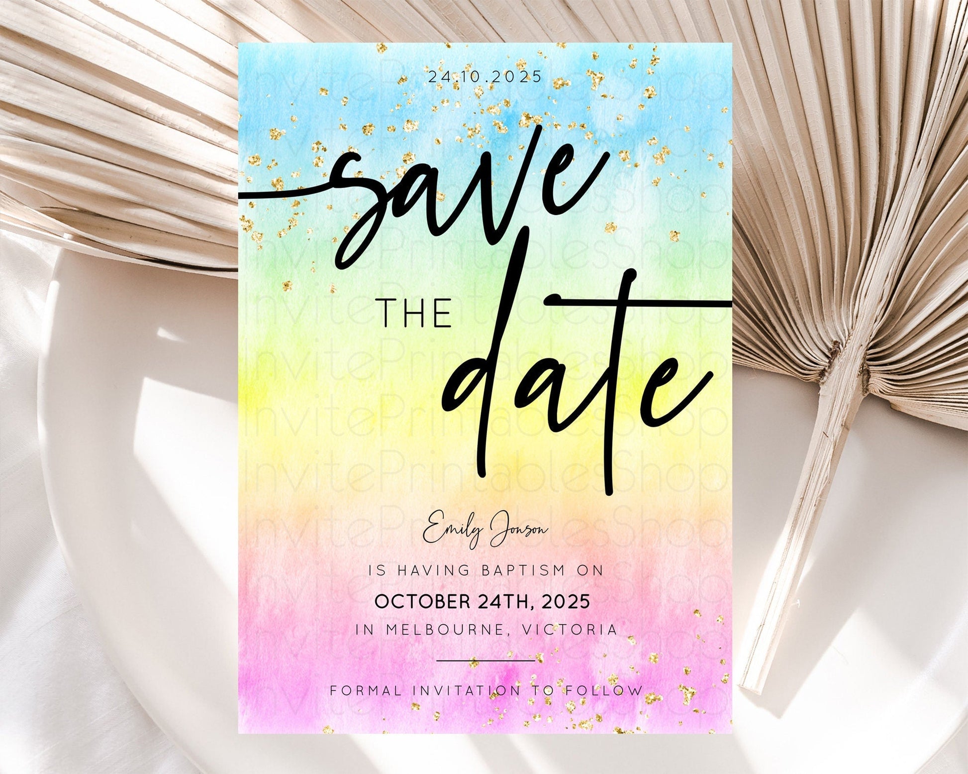 Pastel Save The Date Template Pastel Ombre Rainbow Watercolor Colorful Party For Birthday Baptism Baby Shower Wedding Bridal Shower D10480