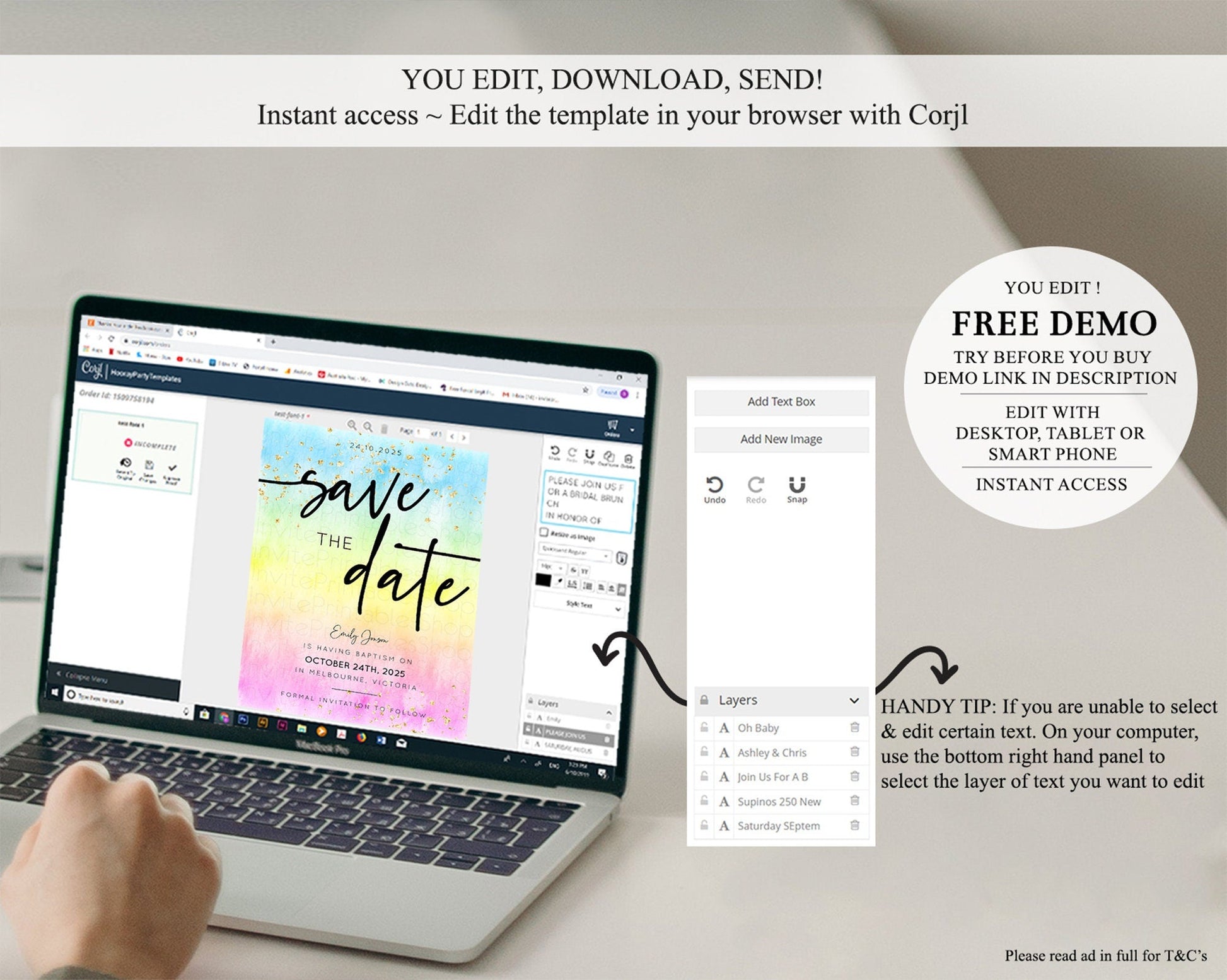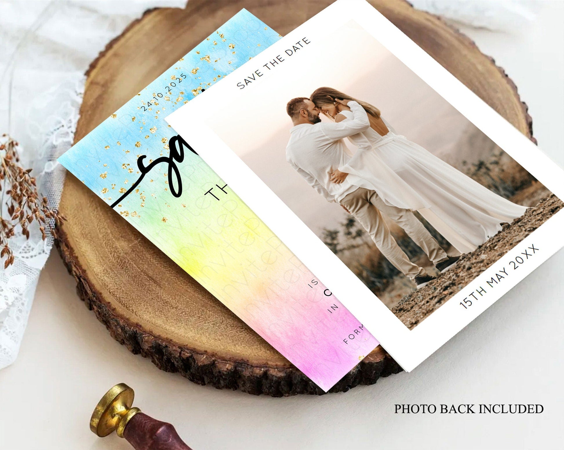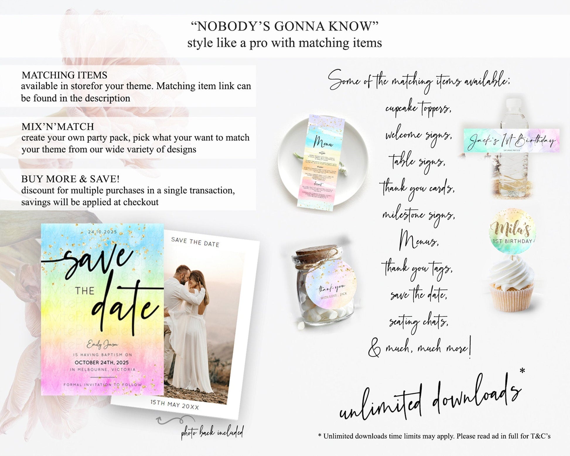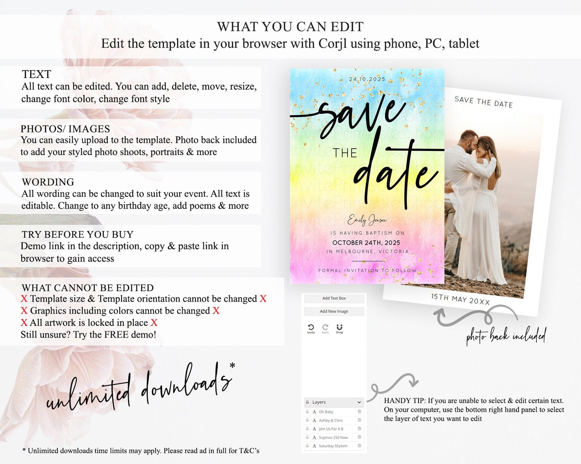 Pastel Save The Date Template Pastel Ombre Rainbow Watercolor Colorful Party For Birthday Baptism Baby Shower Wedding Bridal Shower D10480