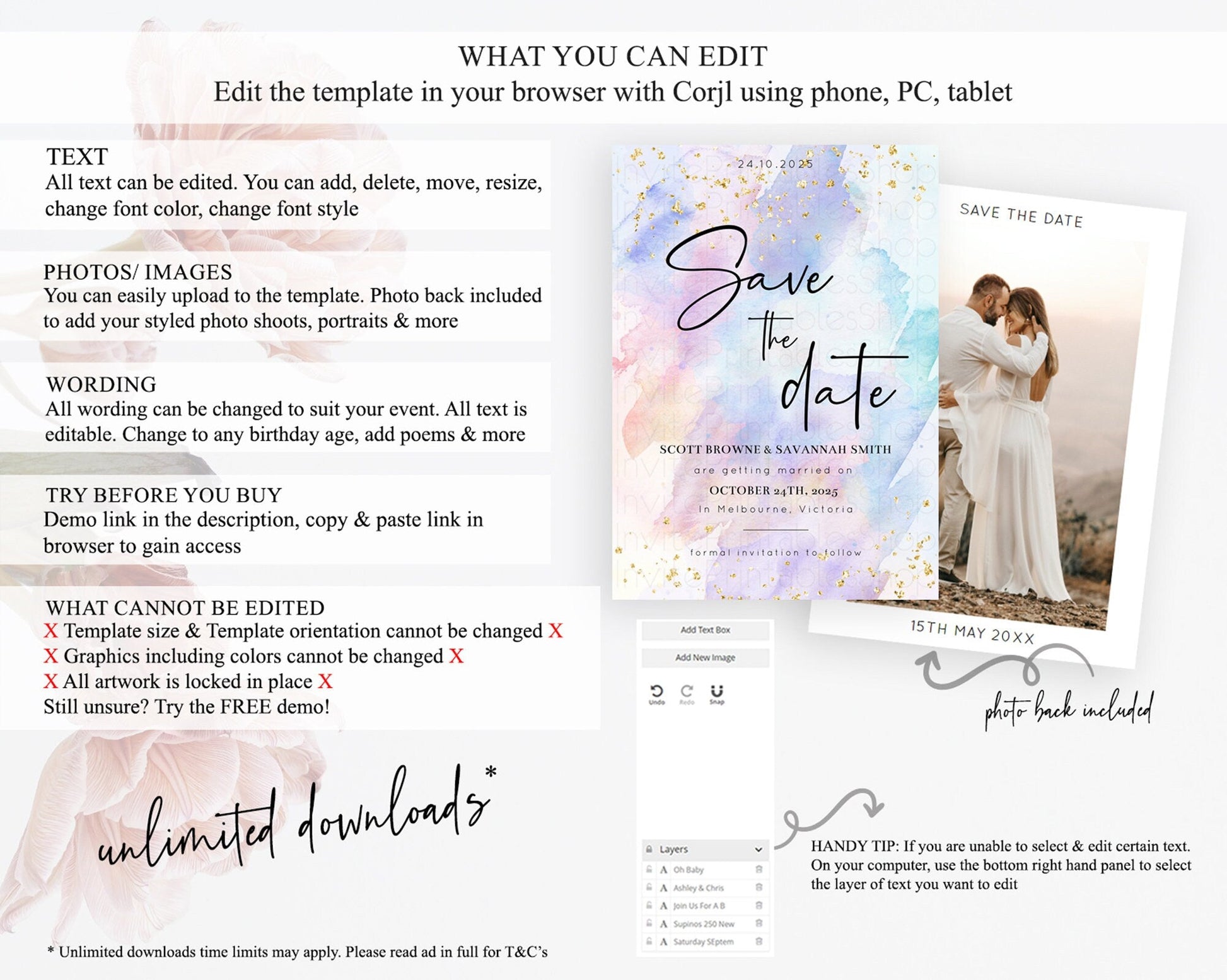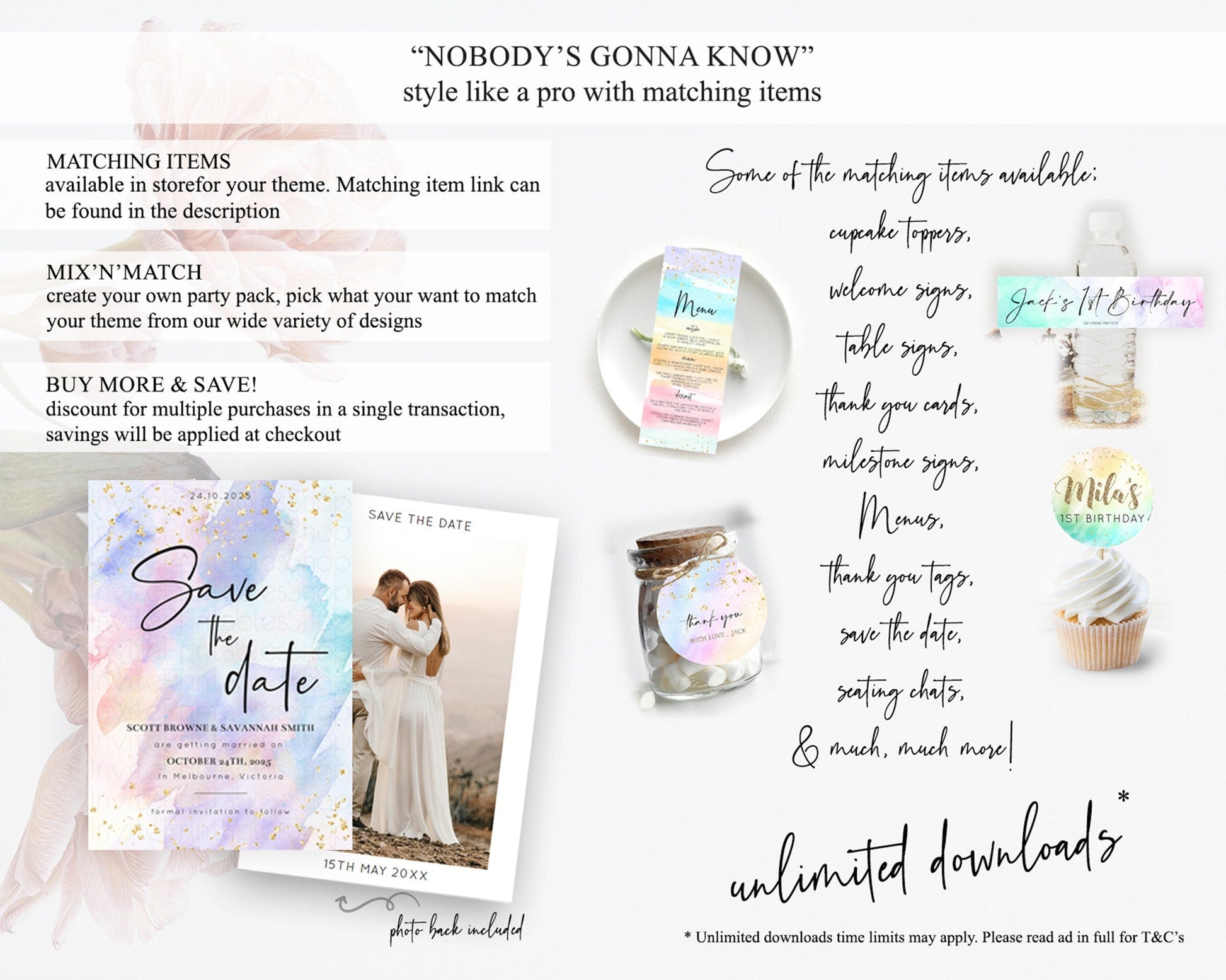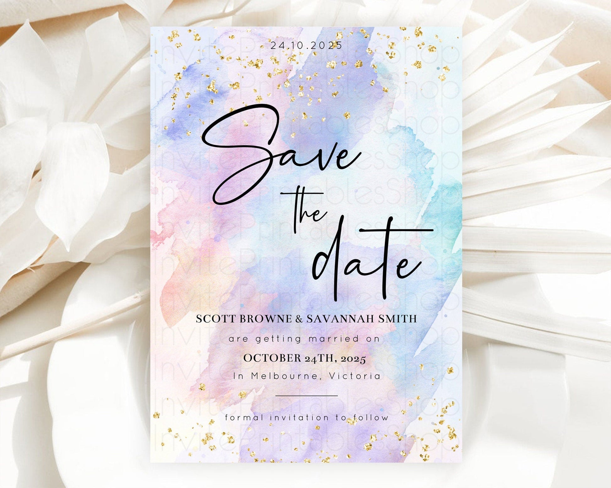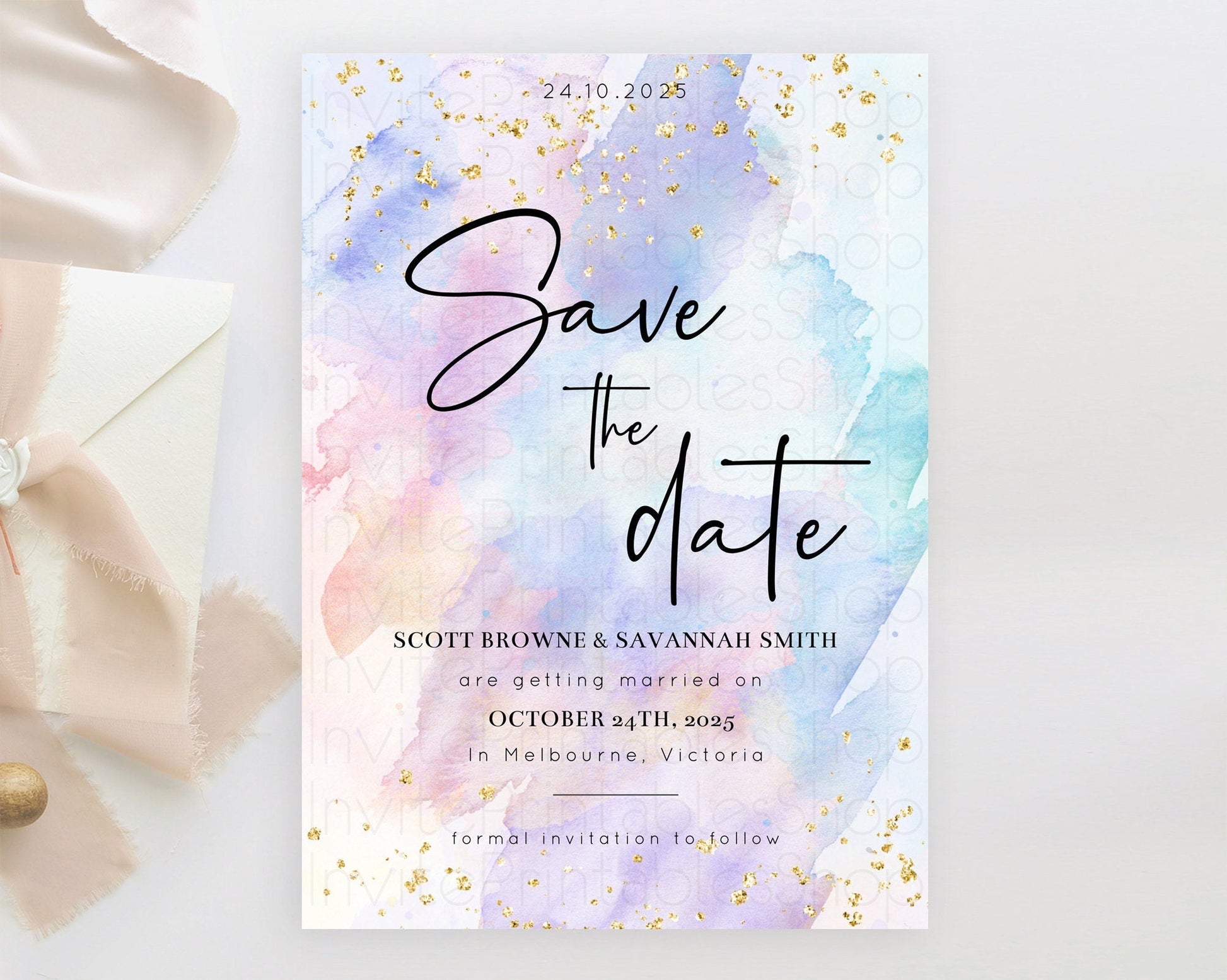 Pastel Save The Date Template Pastel Ombre Rainbow Watercolor Colorful Party For Birthday Baptism Baby Shower Wedding Bridal Shower D10585