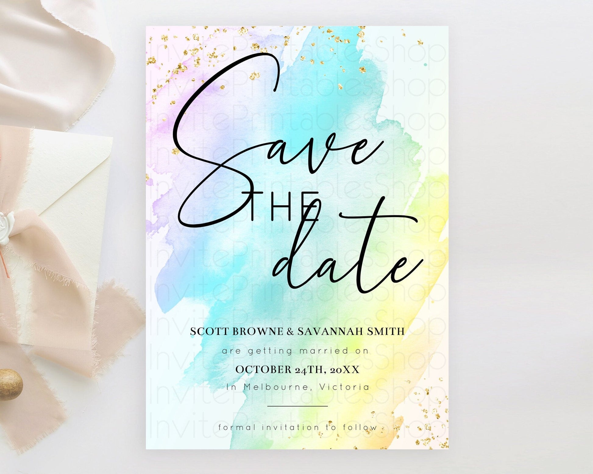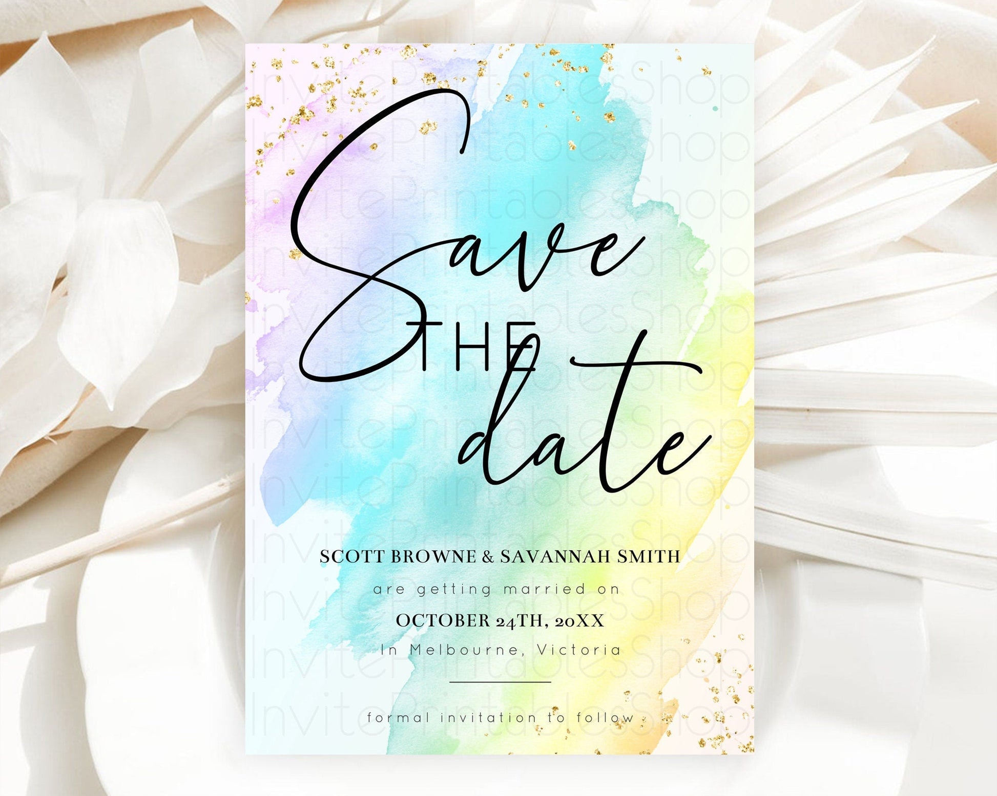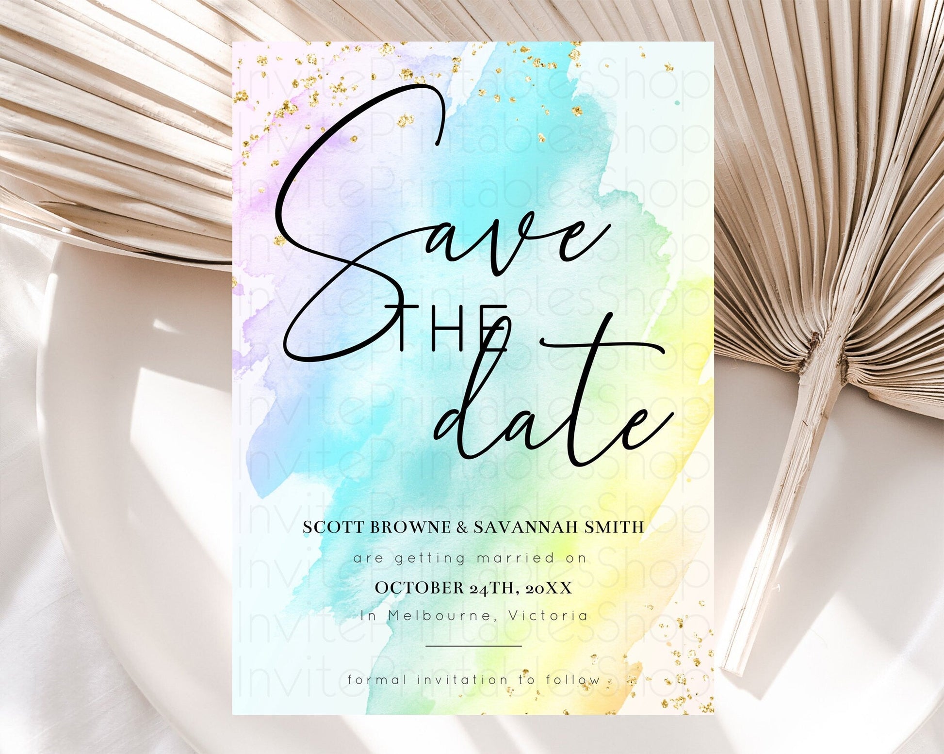 Pastel Save The Date Template Pastel Ombre Rainbow Watercolor Colorful Party For Birthday Baptism Baby Shower Wedding Bridal Shower D10773