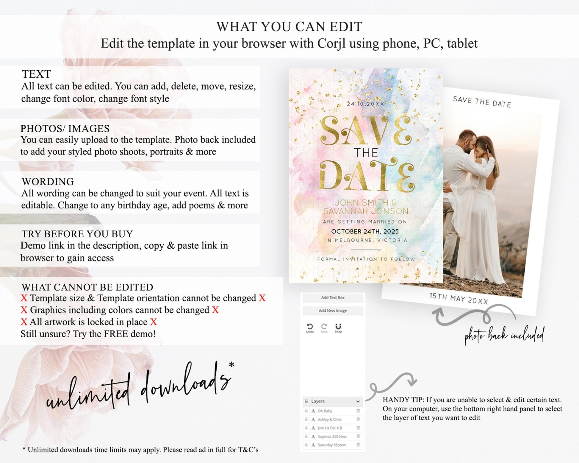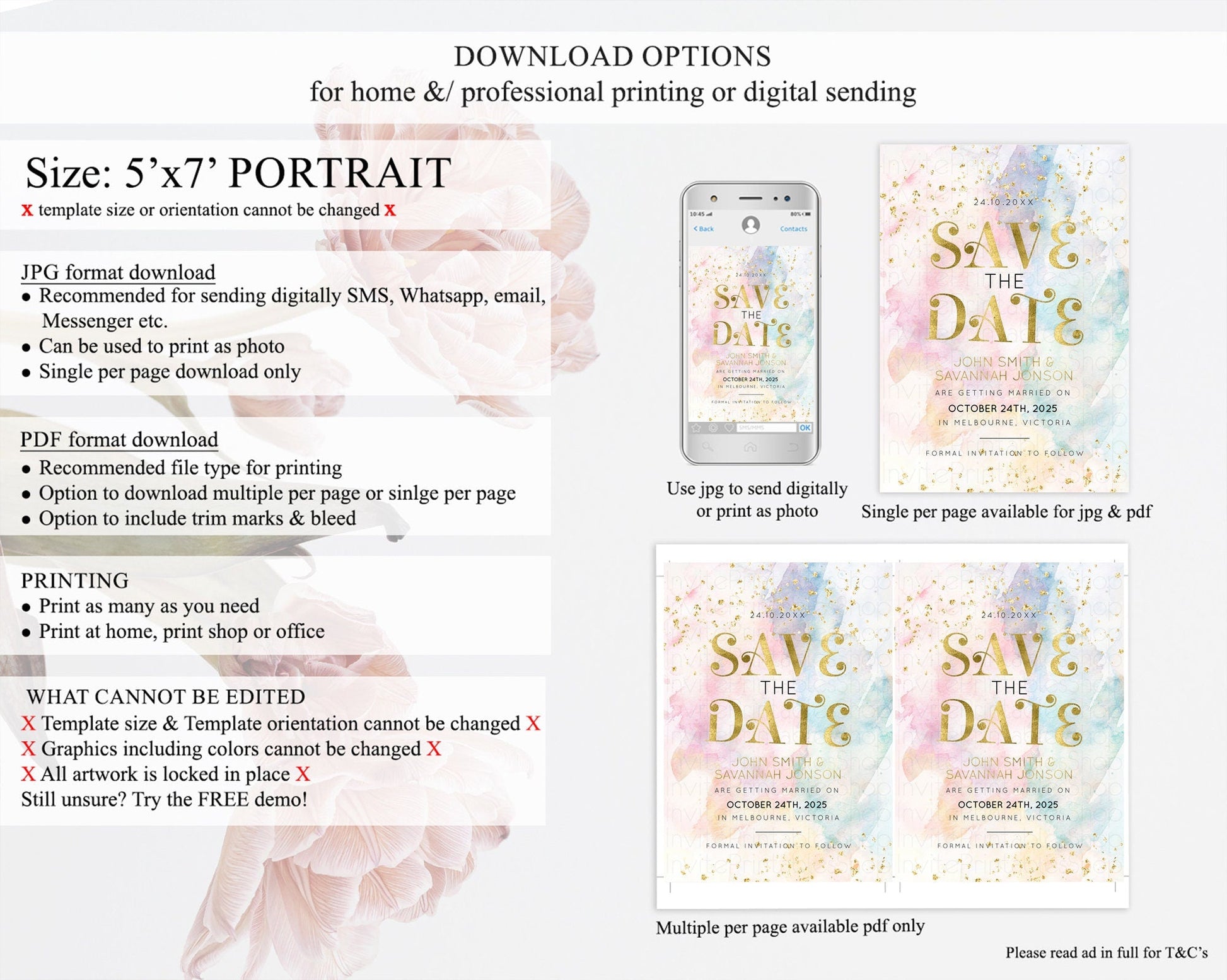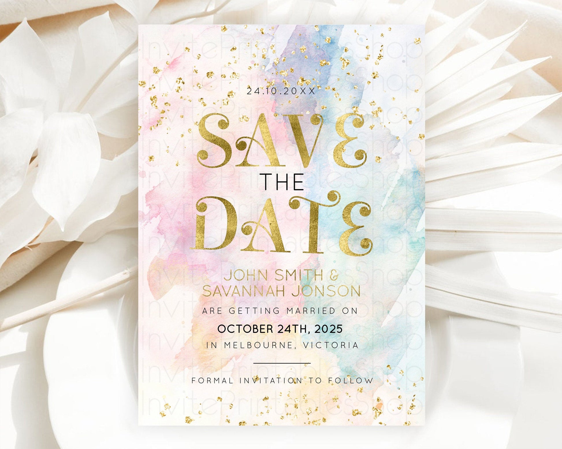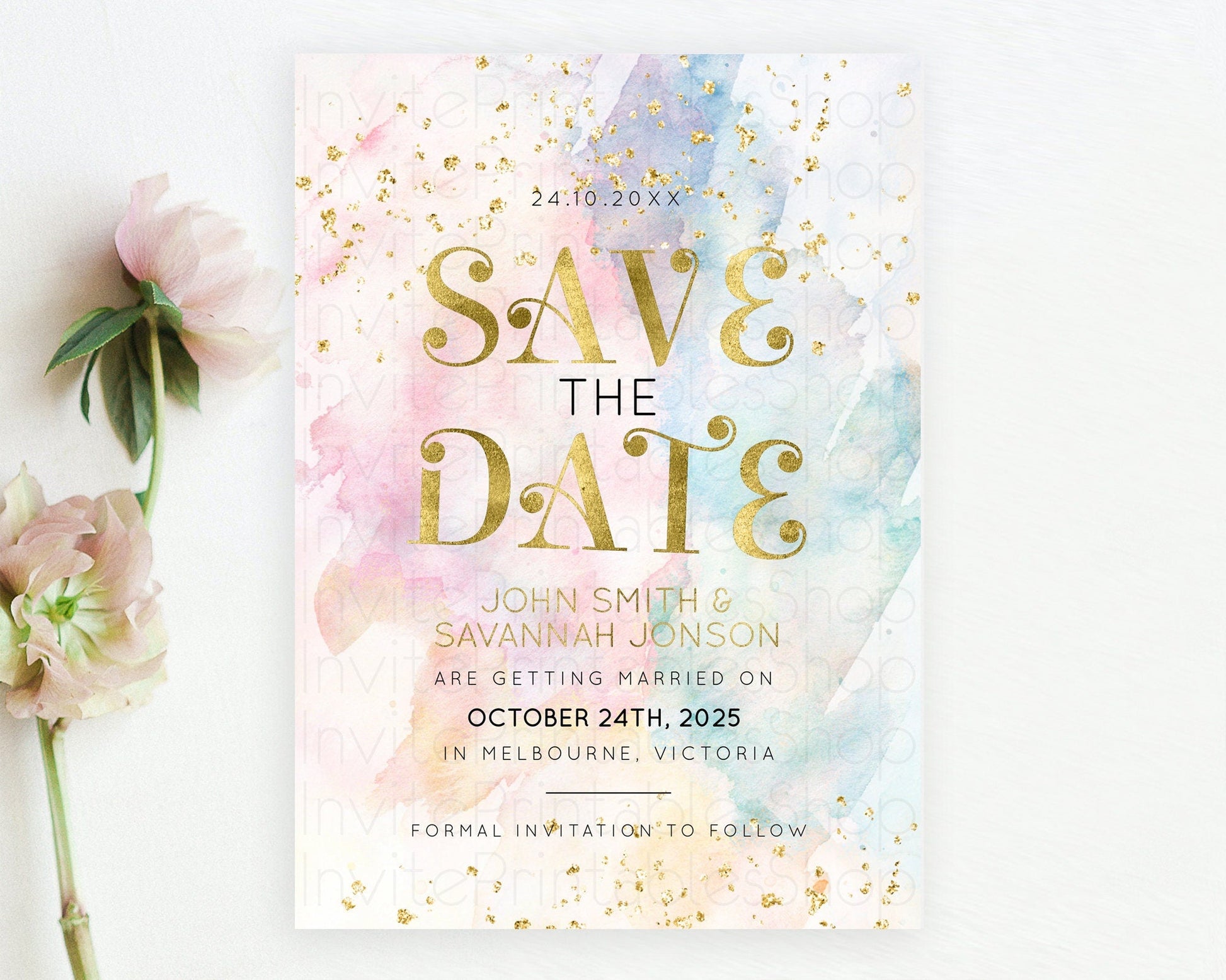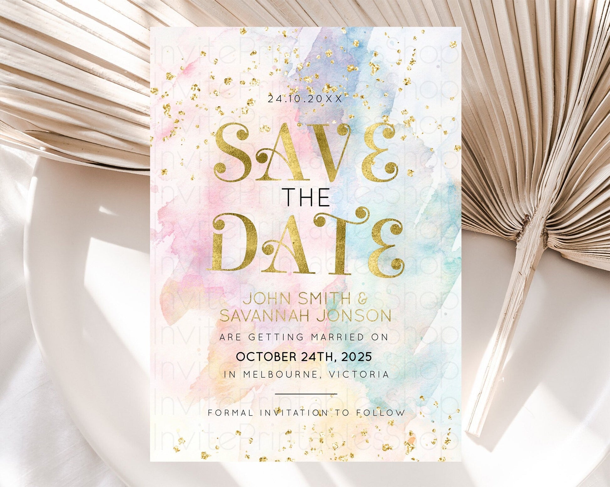Pastel Save The Date Template Pastel Ombre Rainbow Watercolor Colorful Party For Birthday Baptism Baby Shower Wedding Bridal Shower D10835