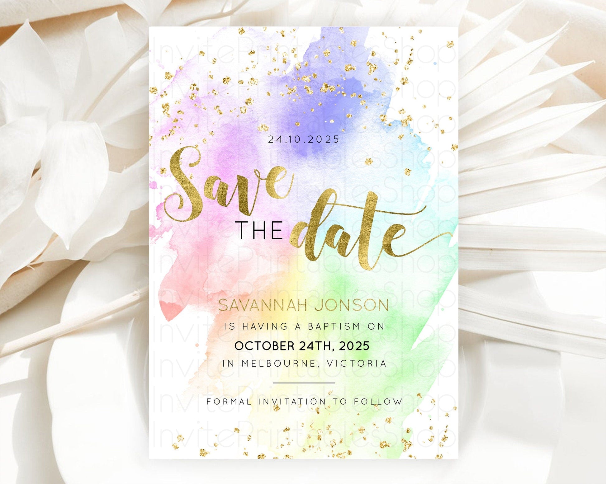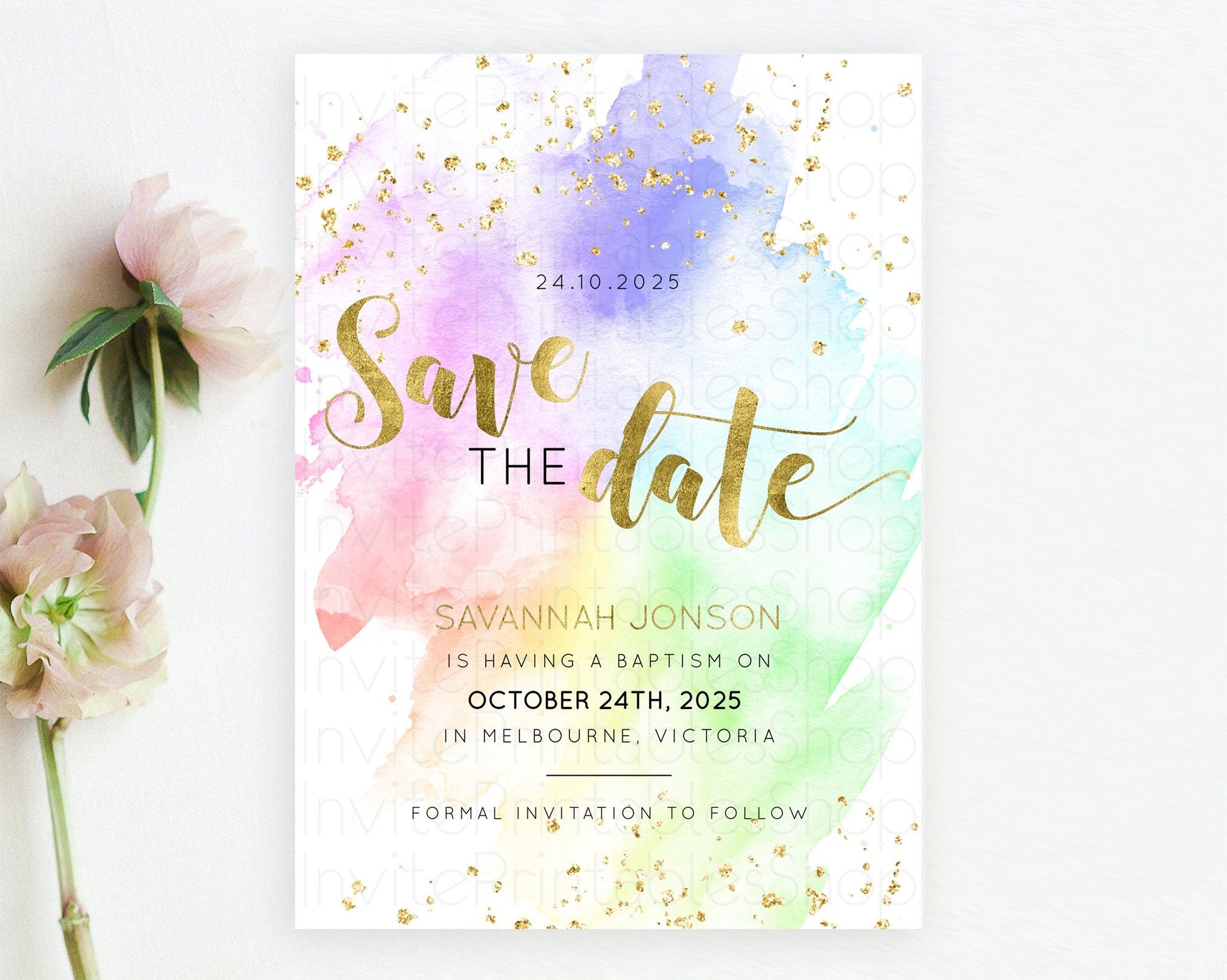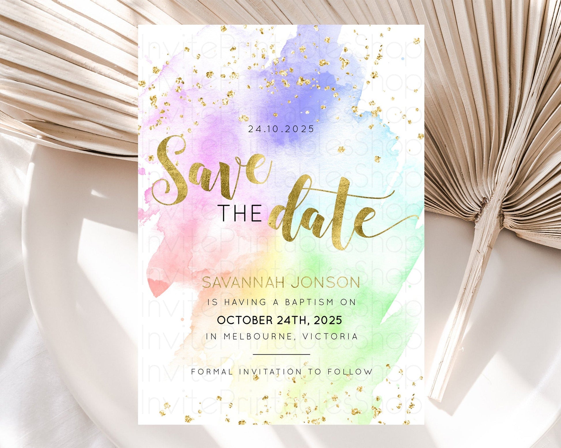 Pastel Save The Date Template Pastel Ombre Rainbow Watercolor Colorful Party For Birthday Baptism Baby Shower Wedding Bridal Shower D10876