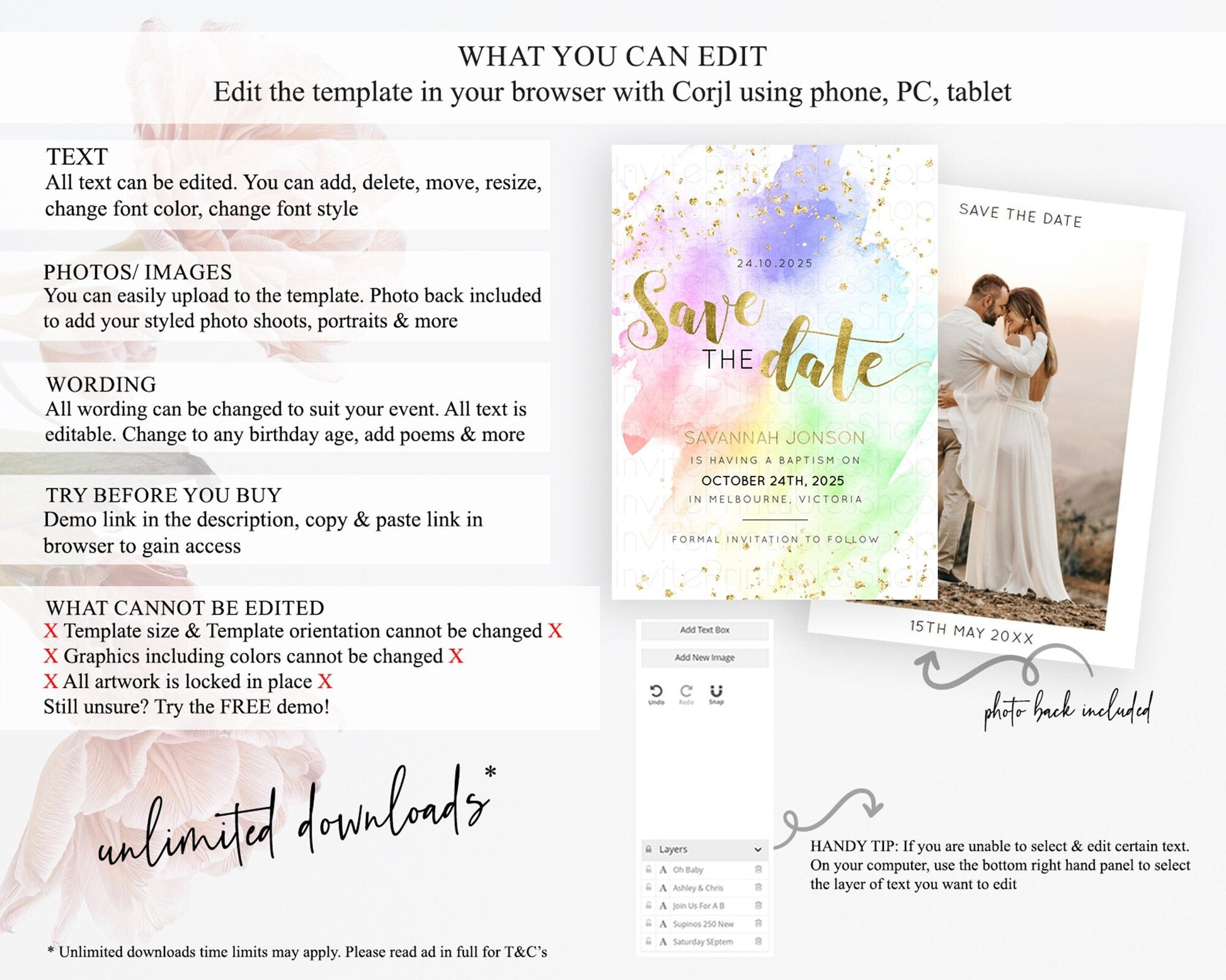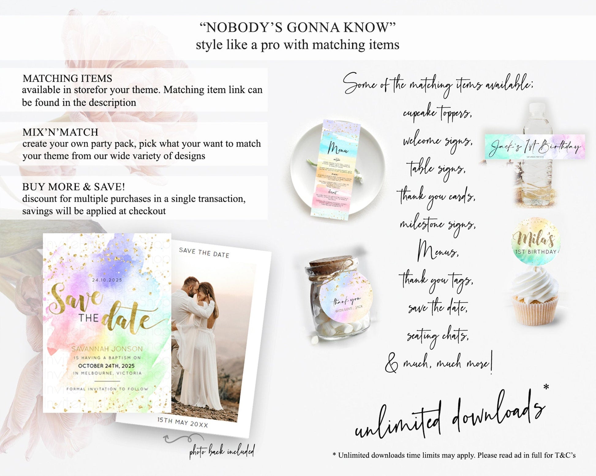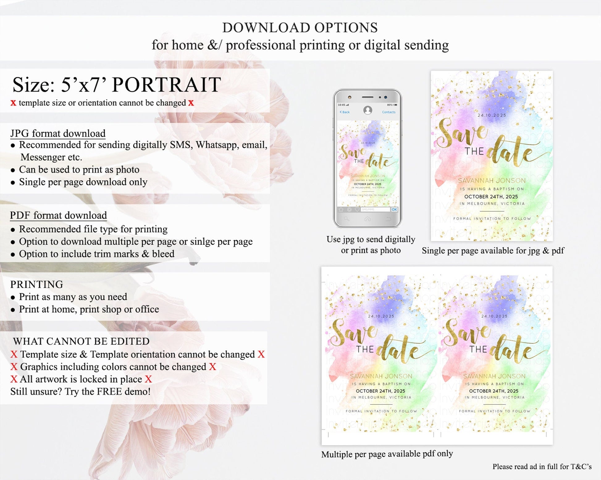 Pastel Save The Date Template Pastel Ombre Rainbow Watercolor Colorful Party For Birthday Baptism Baby Shower Wedding Bridal Shower D10876