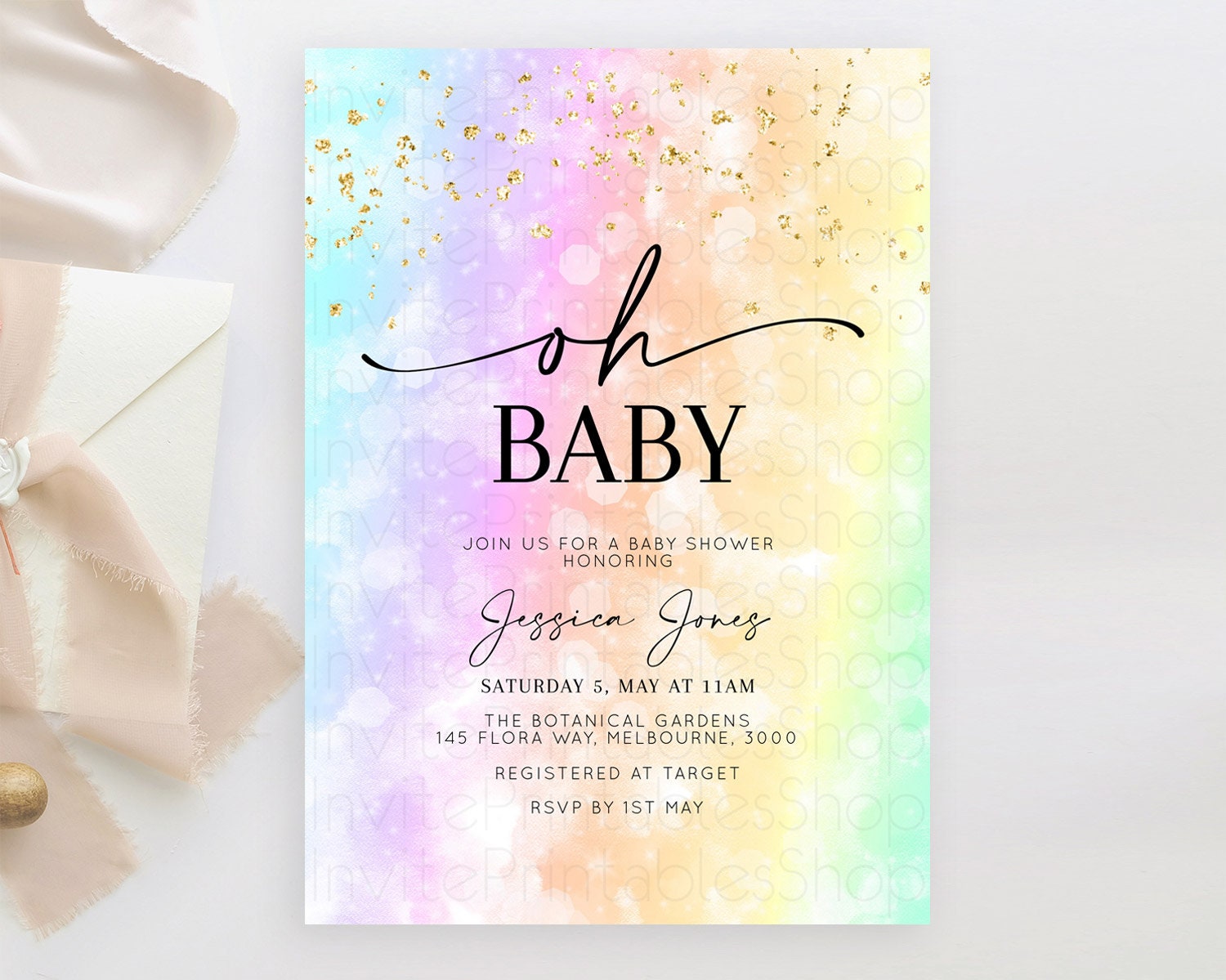 Pastel Watercolor Baby Shower Invitation with Iridescent & Gold Glitter Sprinkles, Ombre Effect - Teal, Purple, Yellow, and Green D10647
