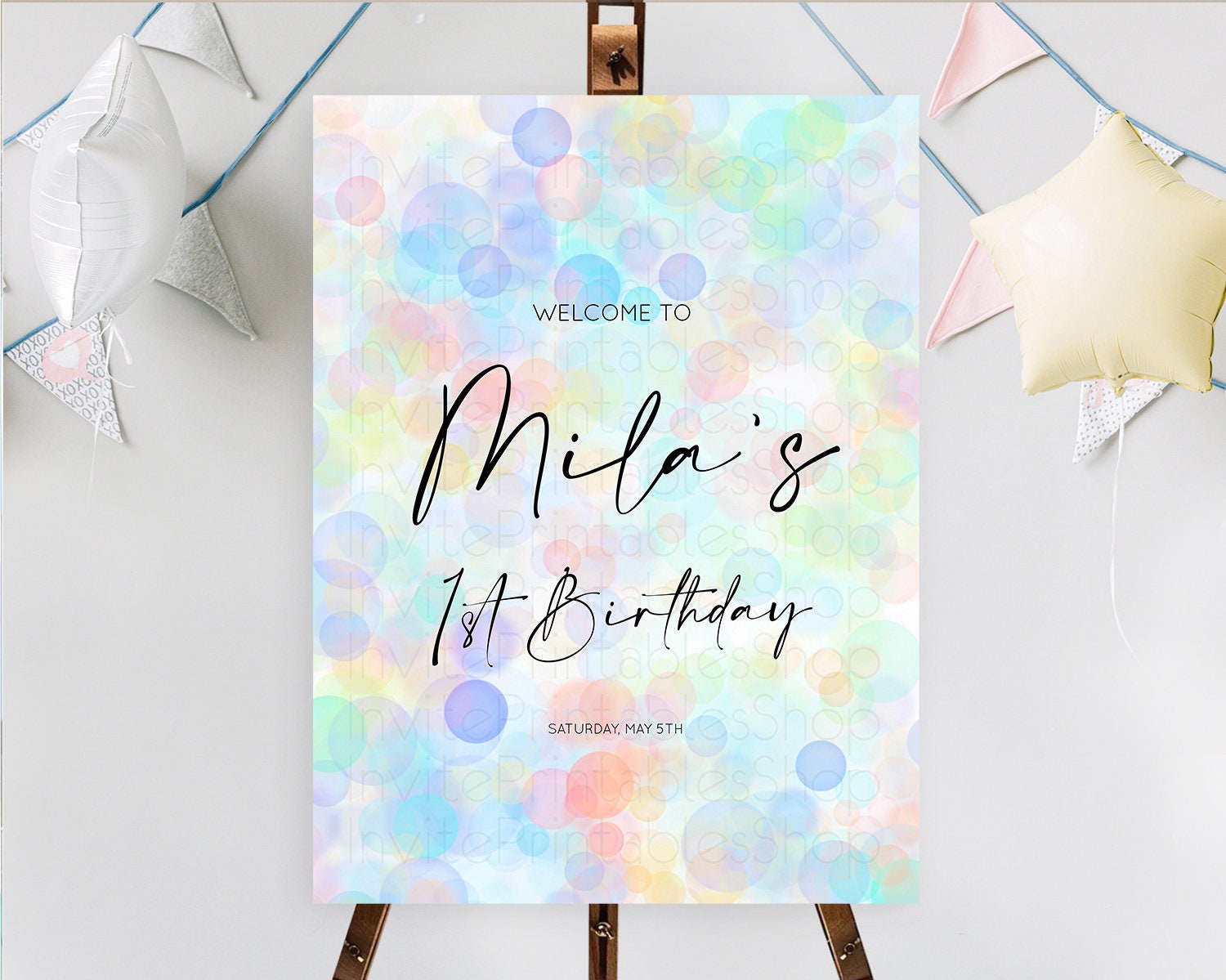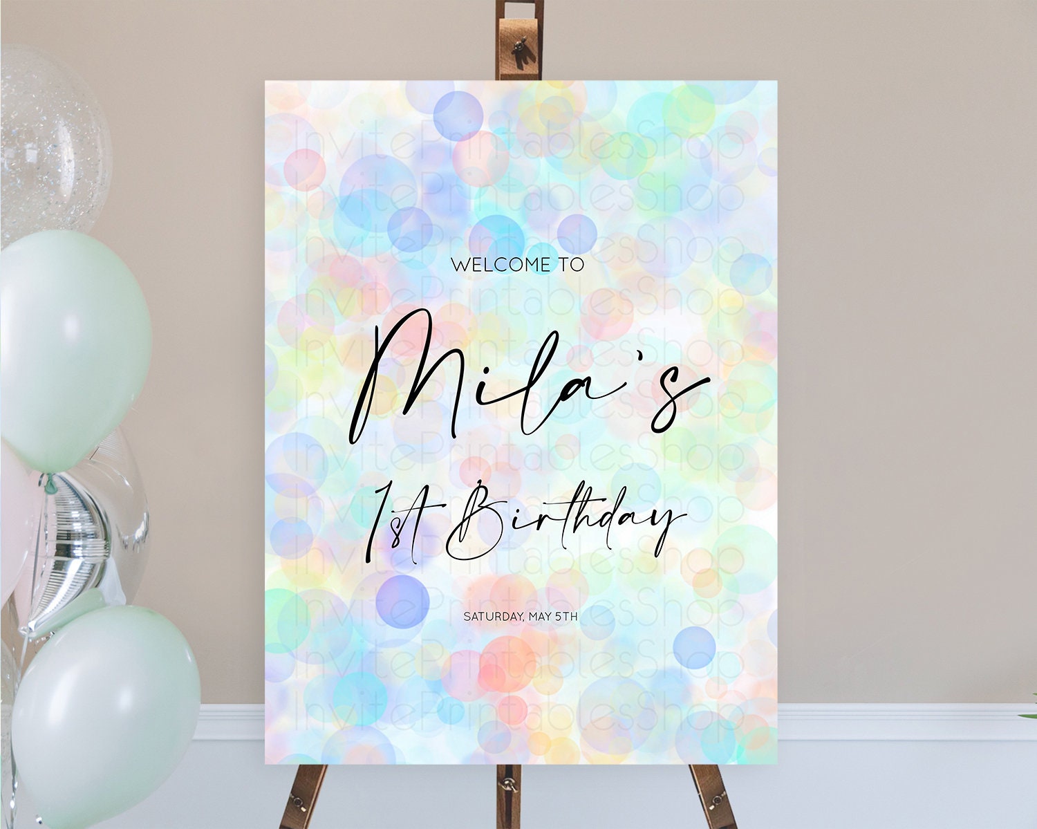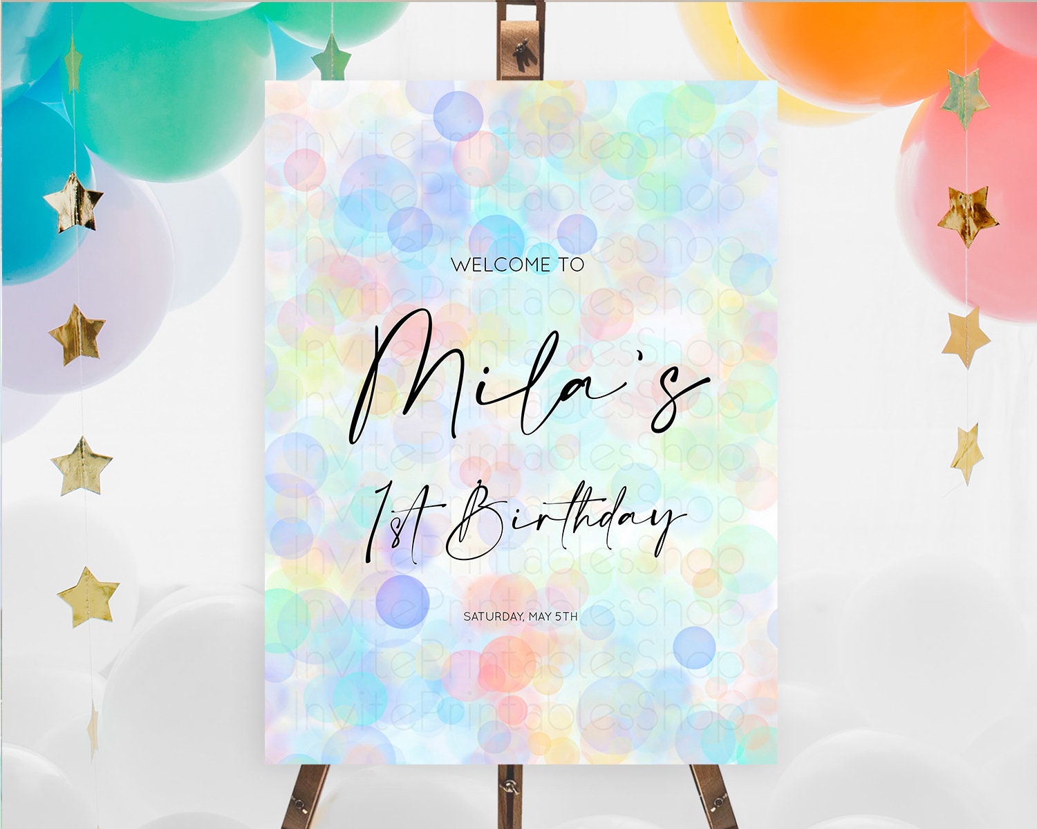 Pastel Welcome Sign Bubble Bath Birthday Party Rainbow Welcome Board Pastel Bubbles Colorful Confetti First Birthday Welcome Sign D10446