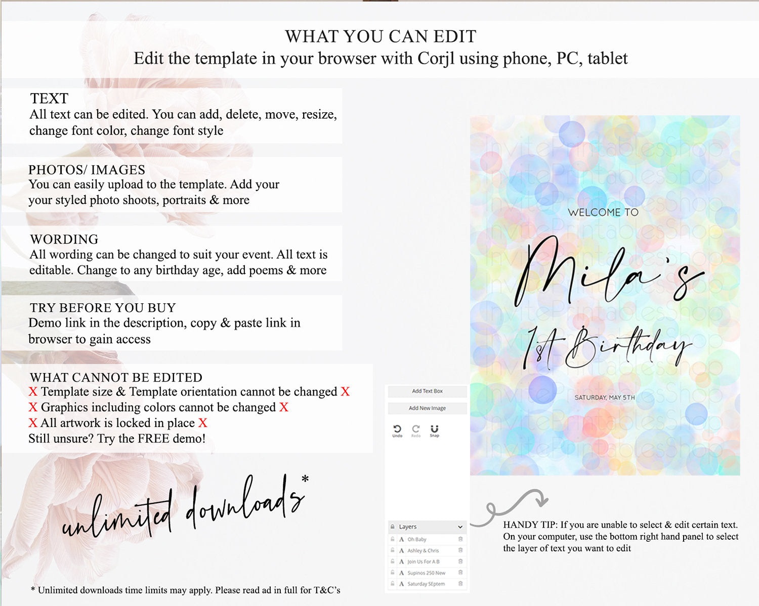 • After purchase, Corjl emails your editing link. Allow up to 15 minutes for delivery.