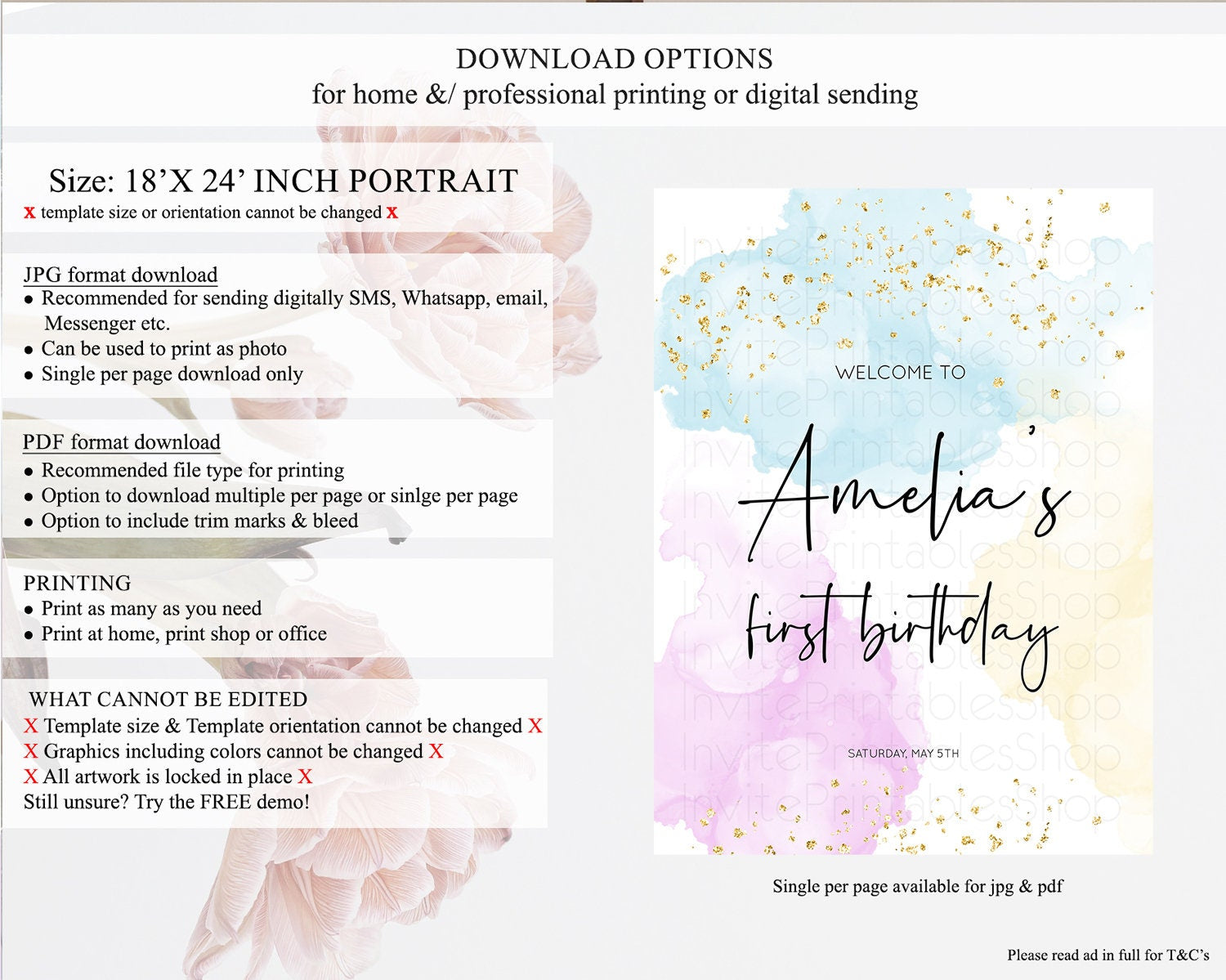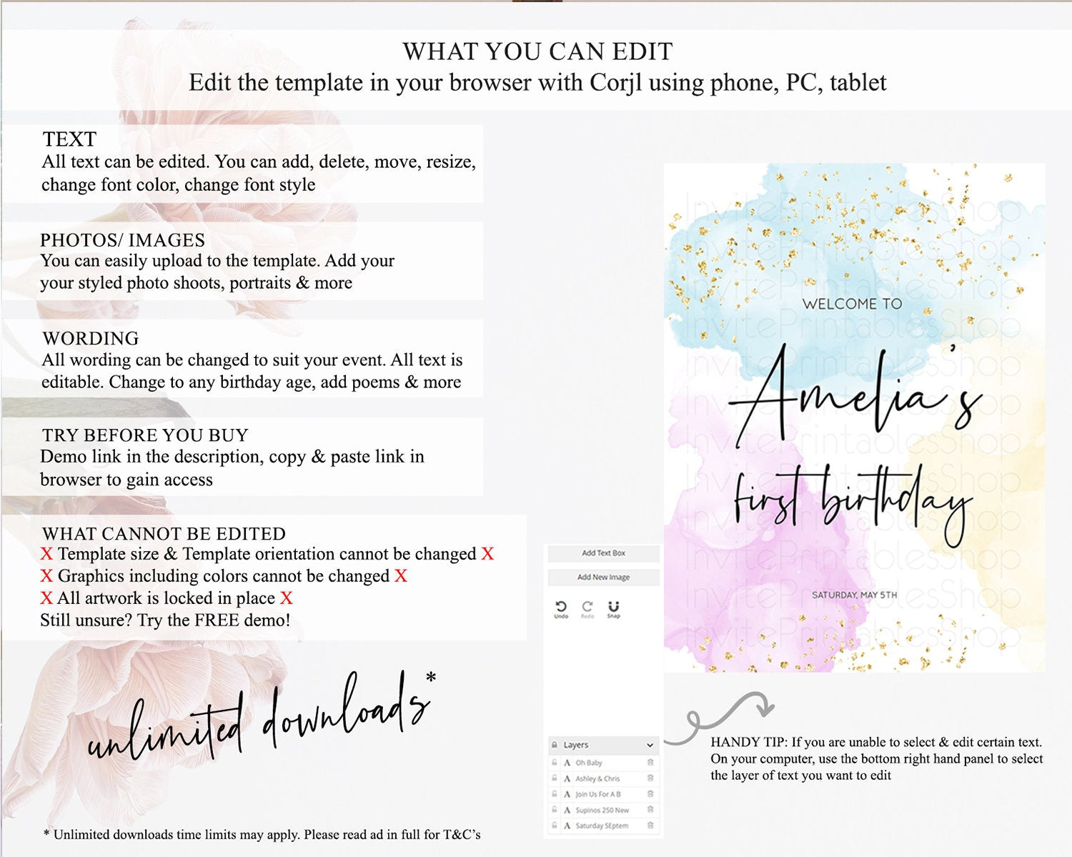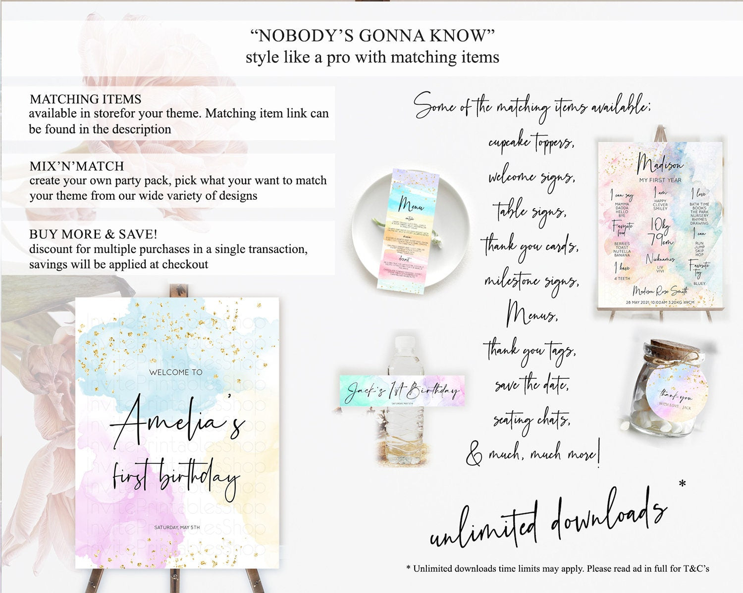 Pastel Welcome Sign Pastel Rainbow Welcome Sign Colorful Rainbow Confetti Watercolor Glitter Pastel First Birthday Welcome Sign D10155