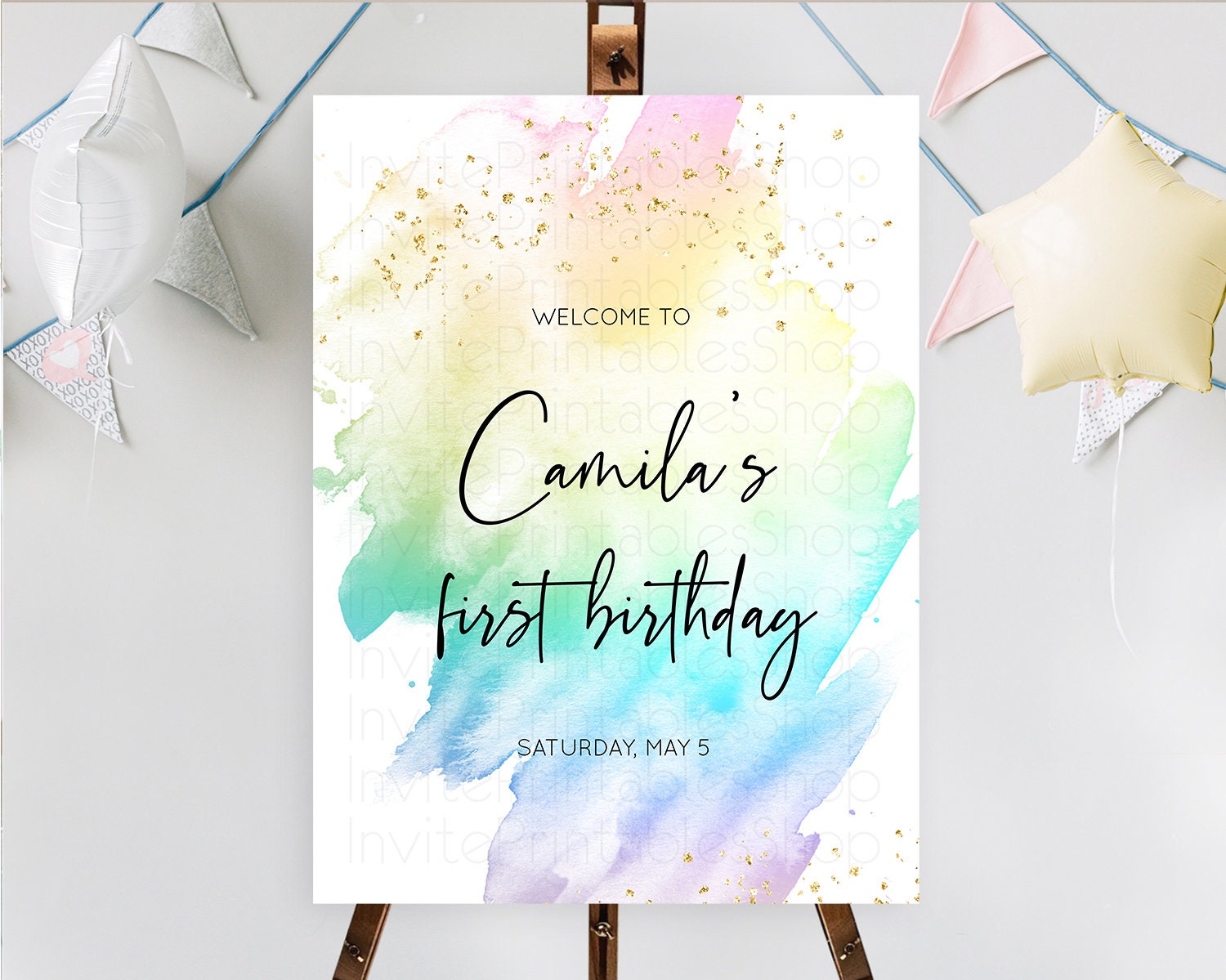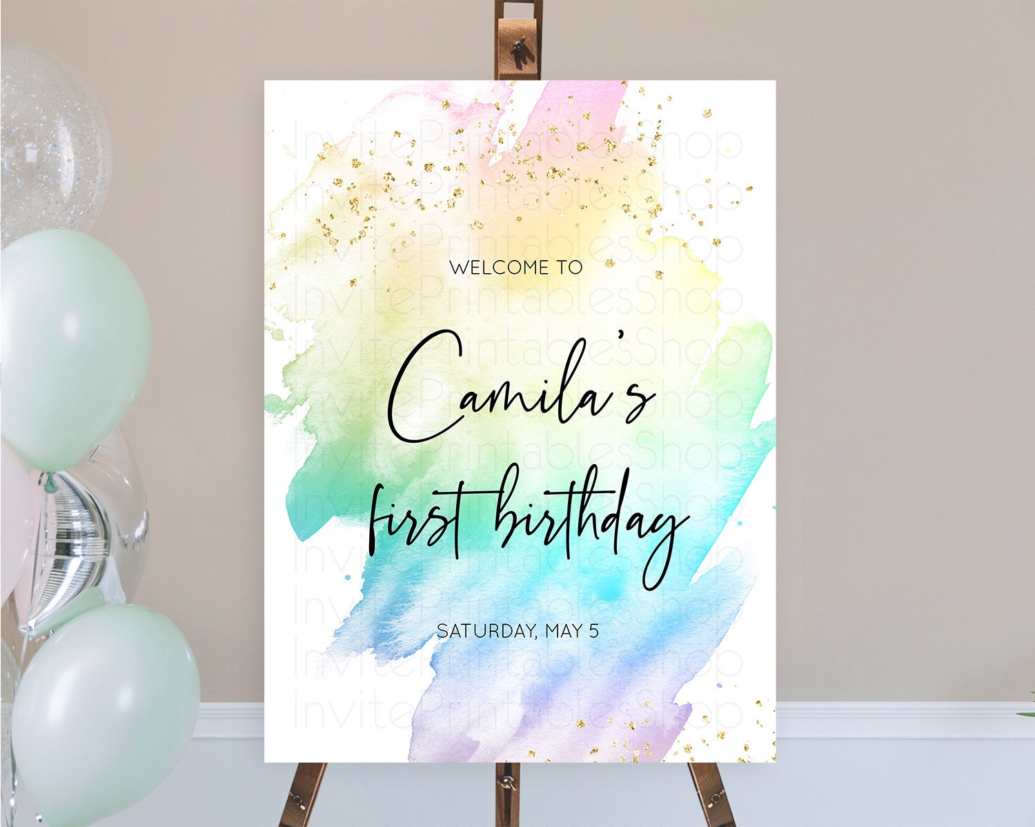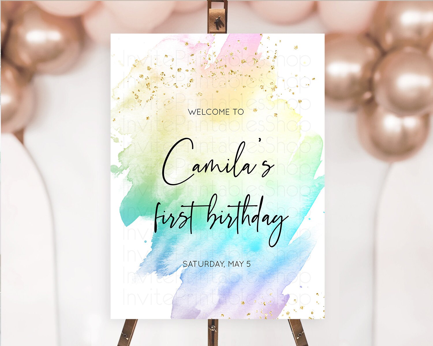 Pastel Welcome Sign Pastel Rainbow Welcome Sign Colorful Rainbow Confetti Watercolor Glitter Pastel First Birthday Welcome Sign D10256