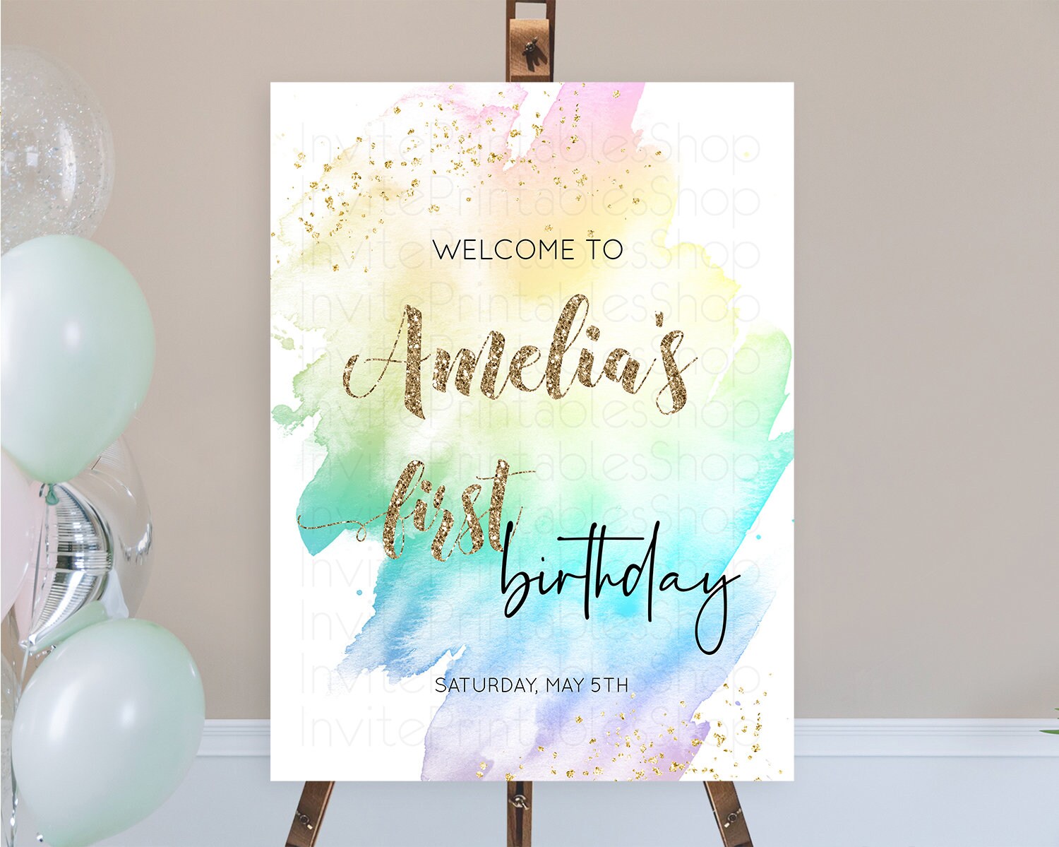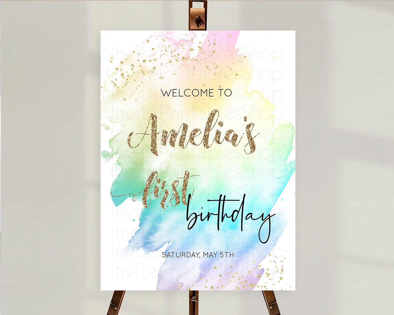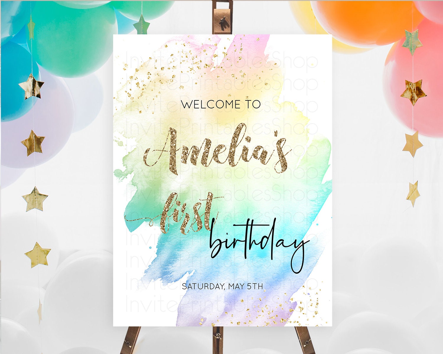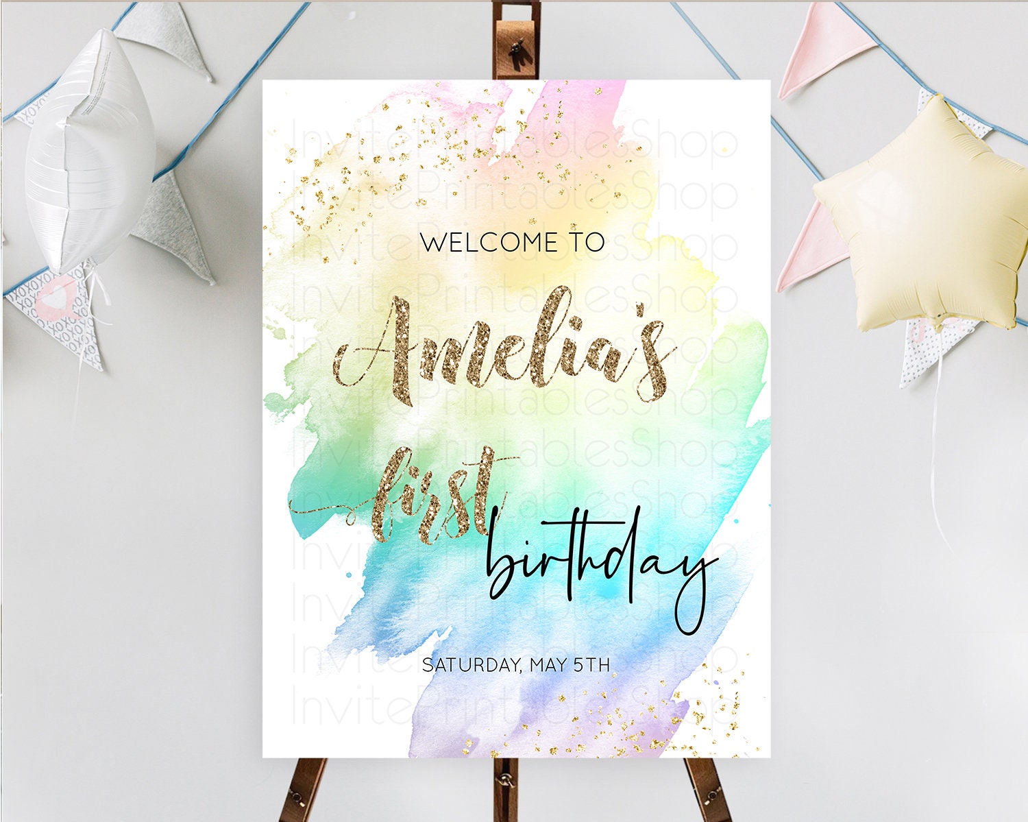 Pastel Welcome Sign Pastel Rainbow Welcome Sign Colorful Rainbow Confetti Watercolor Glitter Pastel First Birthday Welcome Sign D10259