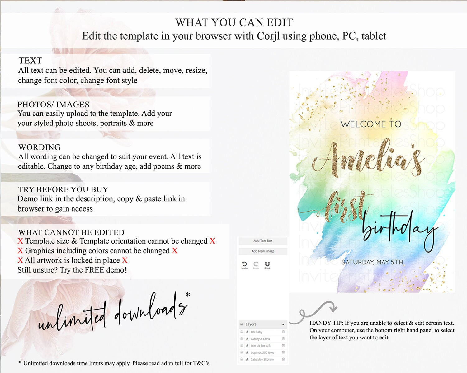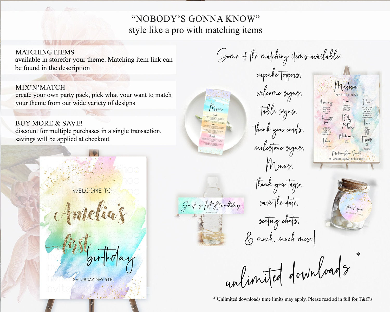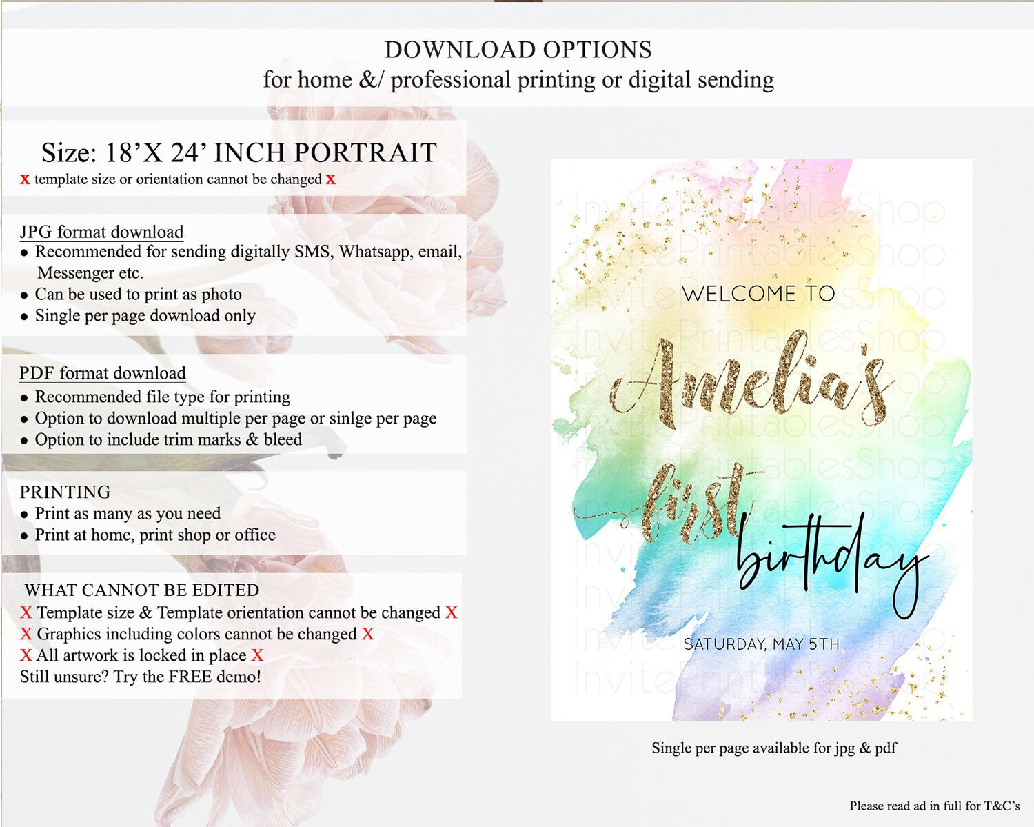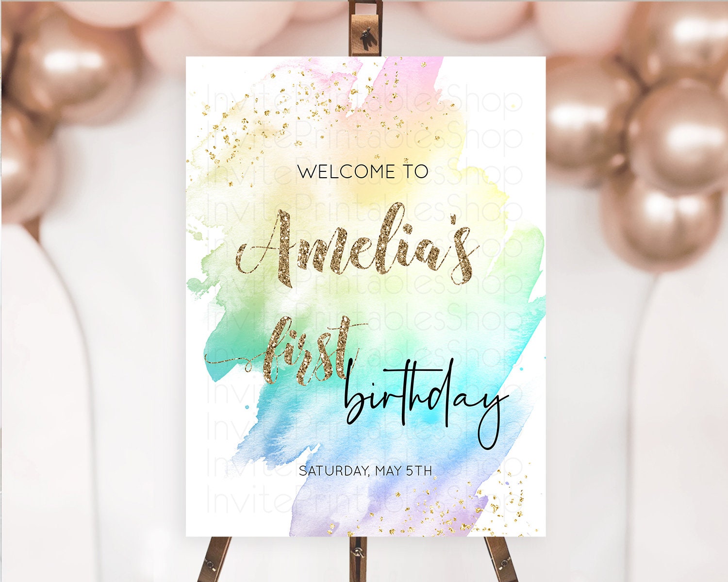Pastel Welcome Sign Pastel Rainbow Welcome Sign Colorful Rainbow Confetti Watercolor Glitter Pastel First Birthday Welcome Sign D10259