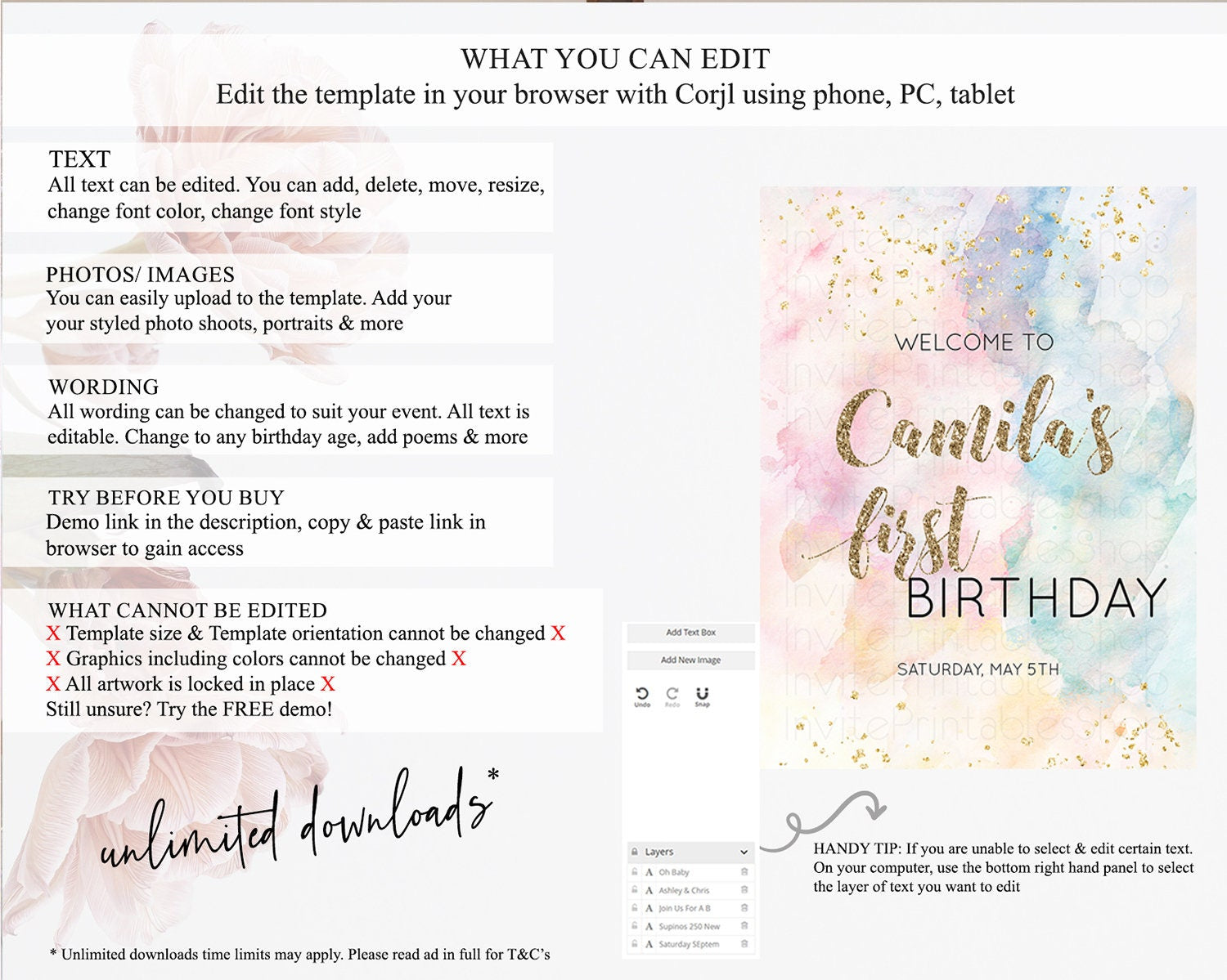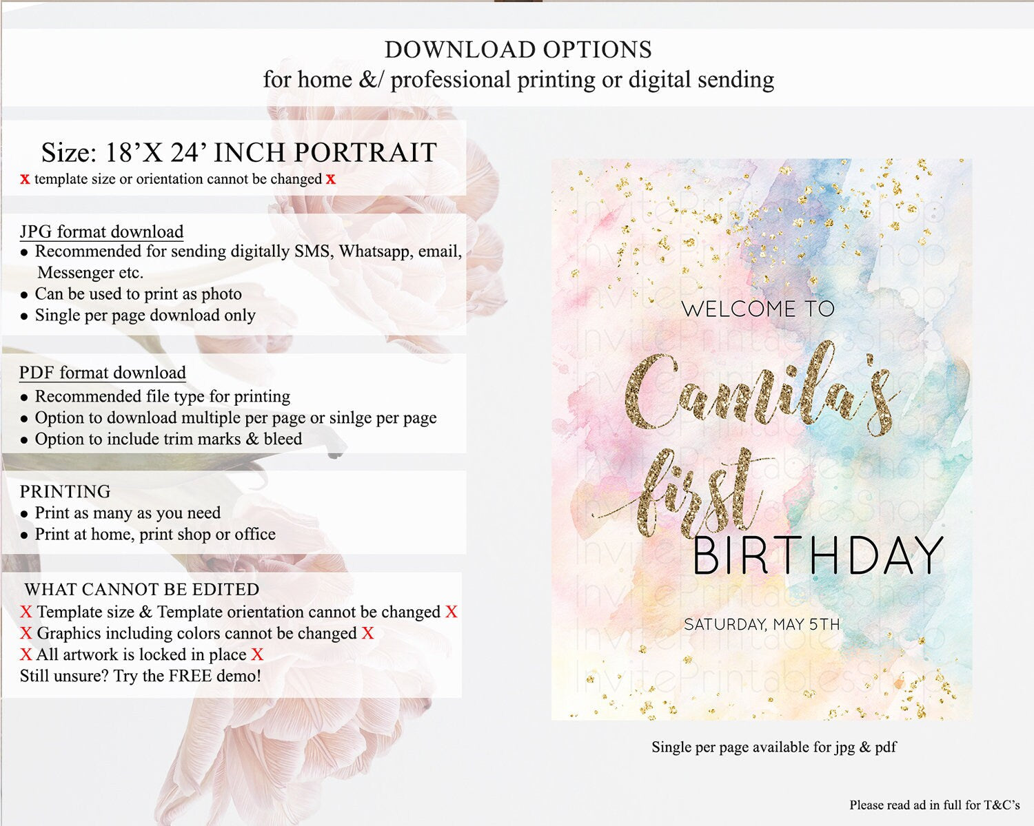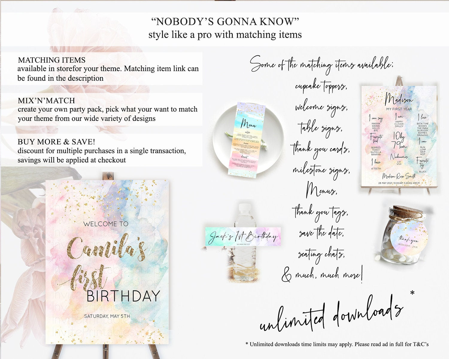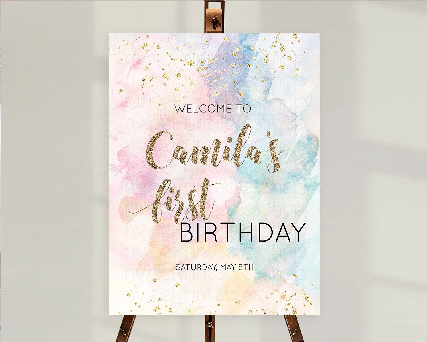 Pastel Welcome Sign Pastel Rainbow Welcome Sign Colorful Rainbow Confetti Watercolor Glitter Pastel First Birthday Welcome Sign D10264