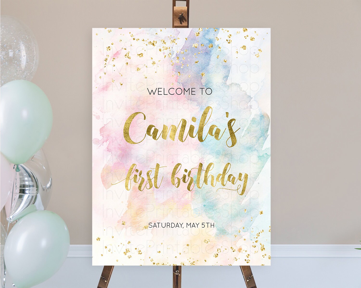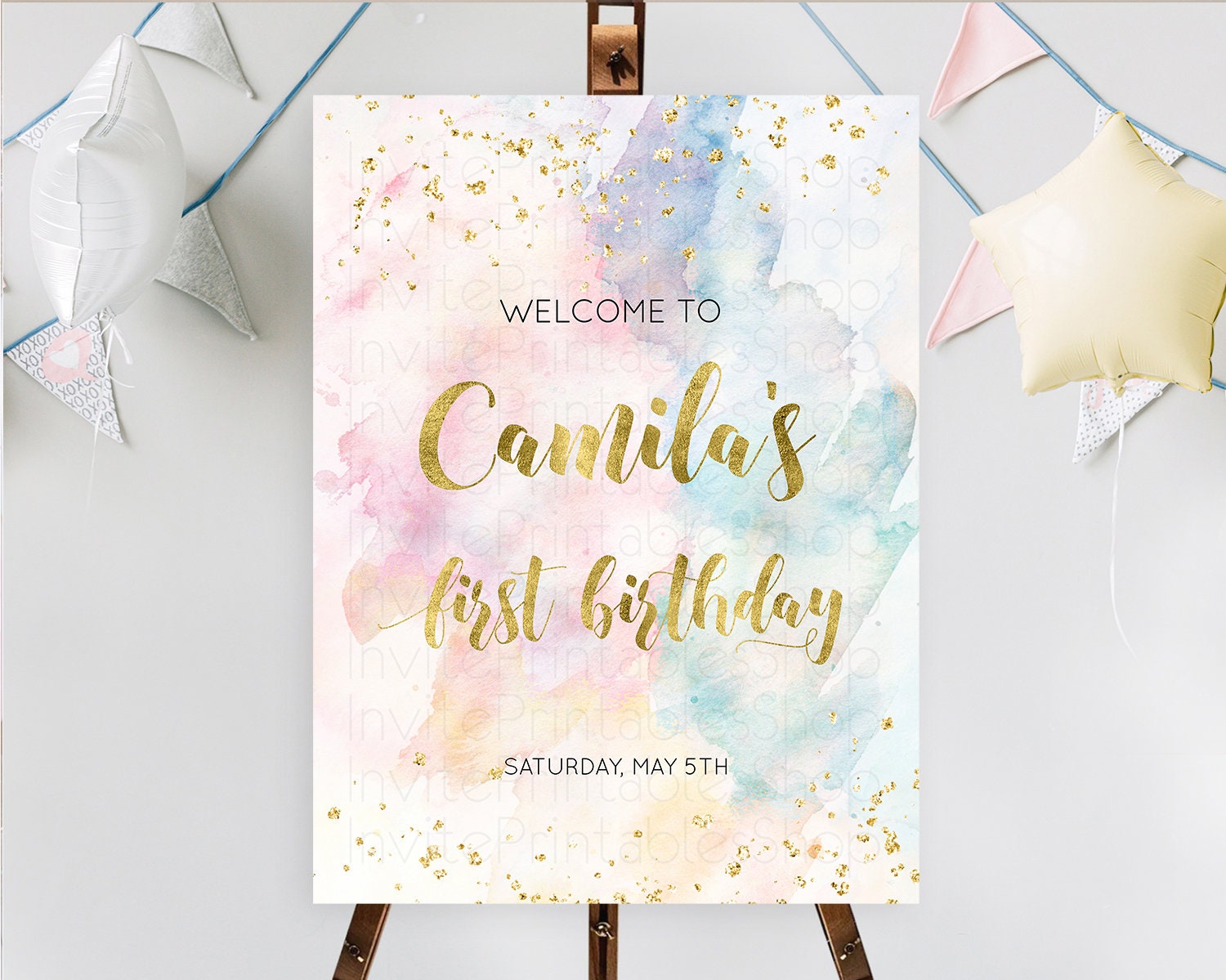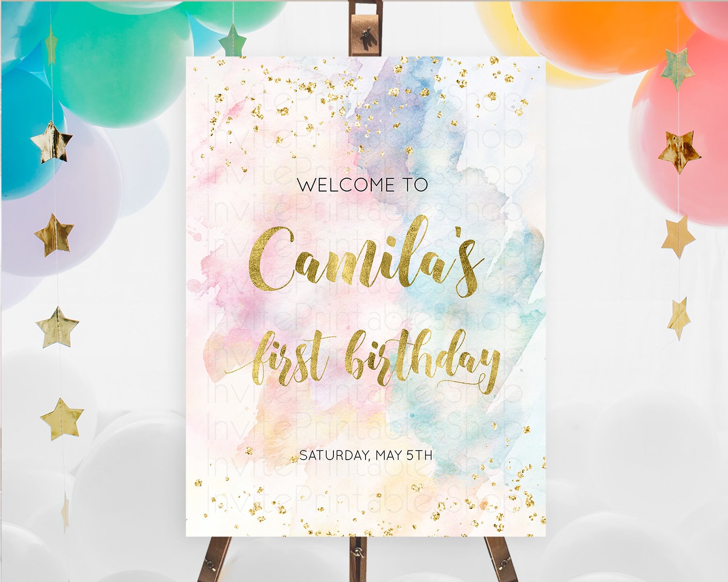 Pastel Welcome Sign Pastel Rainbow Welcome Sign Colorful Rainbow Confetti Watercolor Glitter Pastel First Birthday Welcome Sign D10265