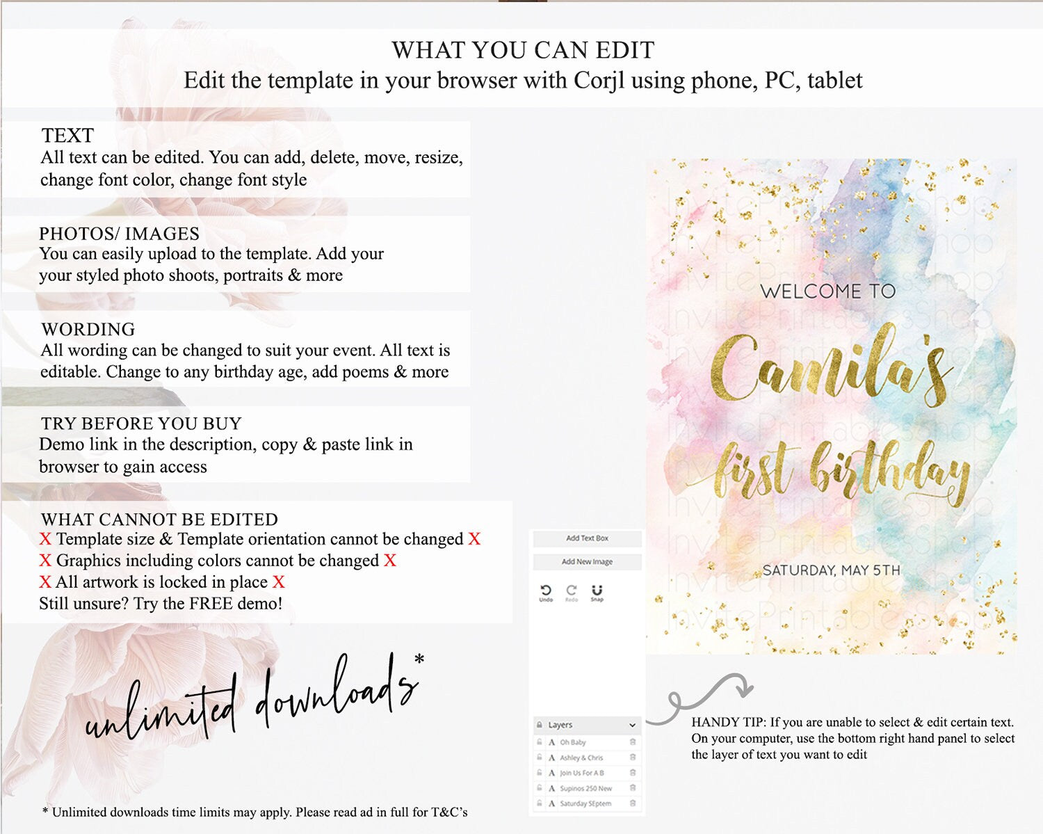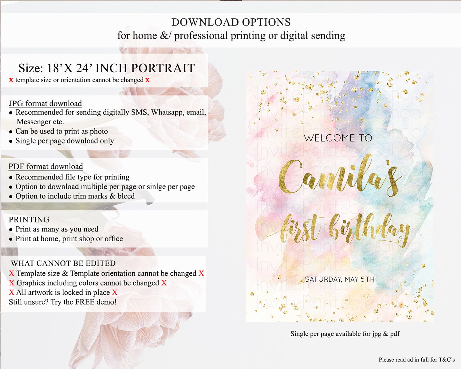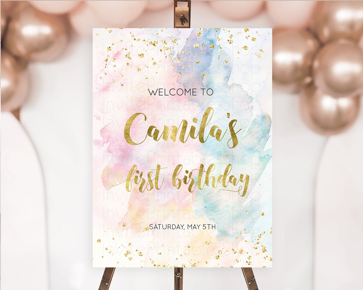Pastel Welcome Sign Pastel Rainbow Welcome Sign Colorful Rainbow Confetti Watercolor Glitter Pastel First Birthday Welcome Sign D10265