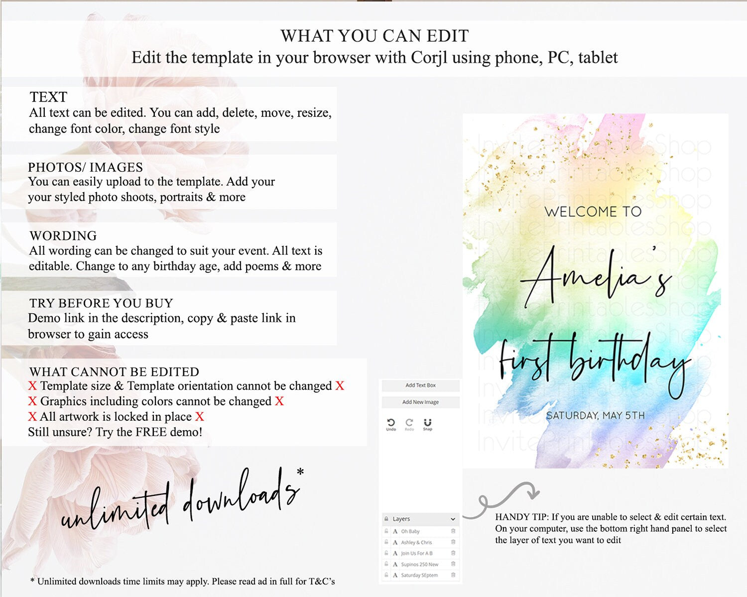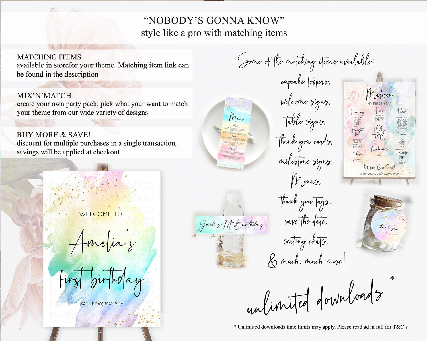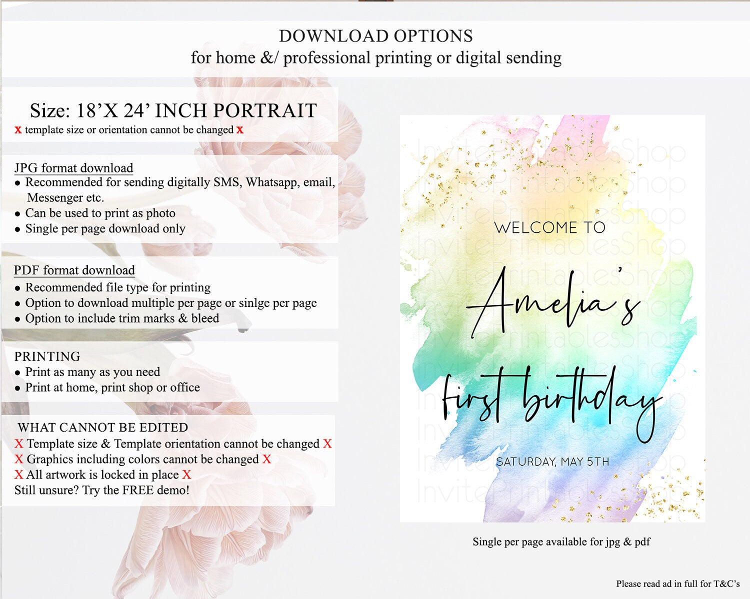 Pastel Welcome Sign Pastel Rainbow Welcome Sign Colorful Rainbow Confetti Watercolor Glitter Pastel First Birthday Welcome Sign D10279