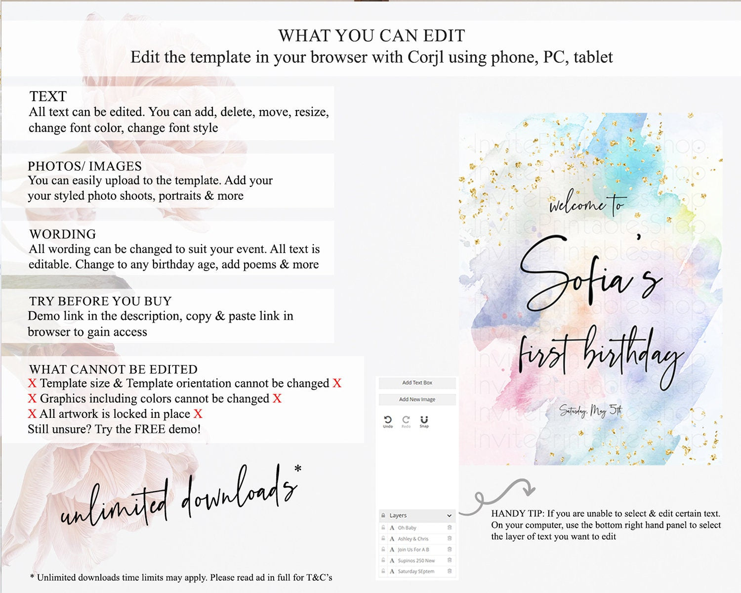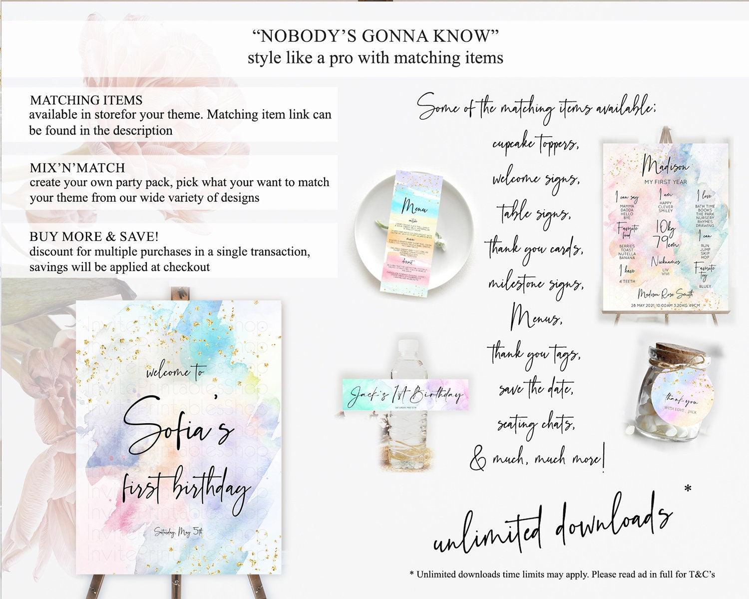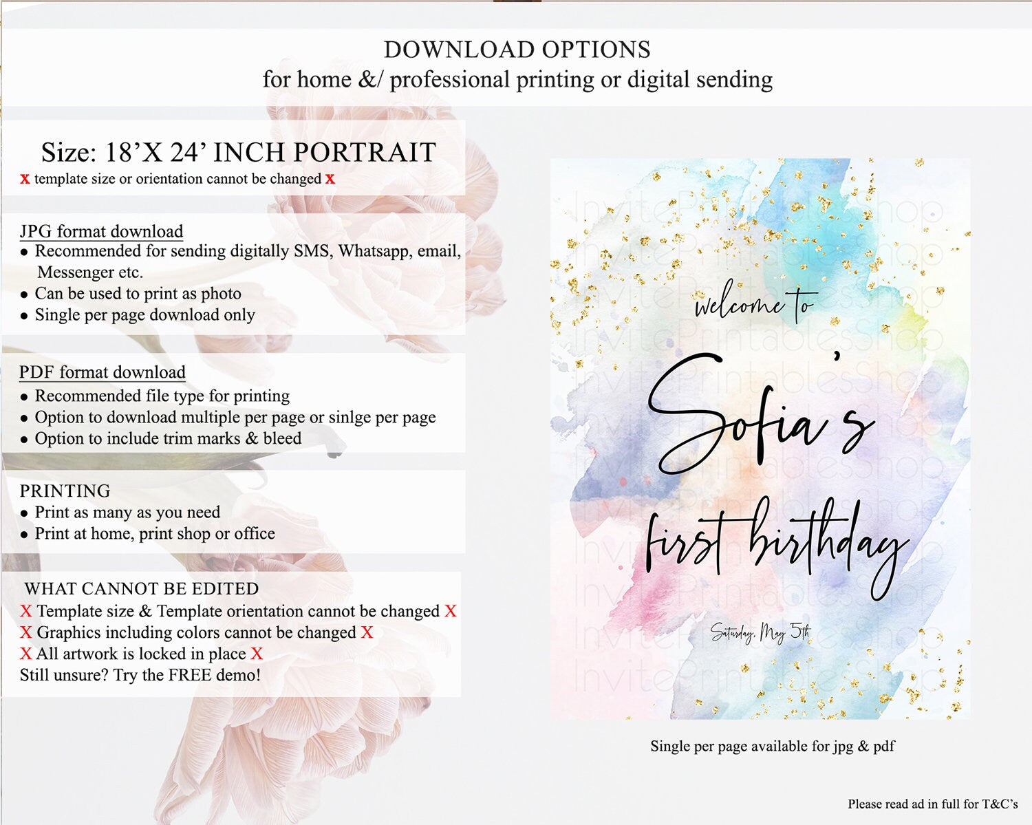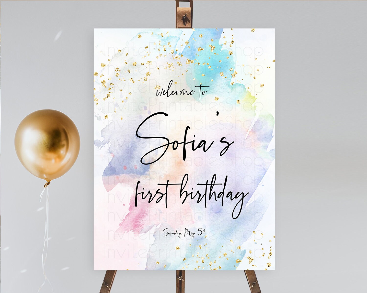 Pastel Welcome Sign Pastel Rainbow Welcome Sign Colorful Rainbow Confetti Watercolor Glitter Pastel First Birthday Welcome Sign D10424