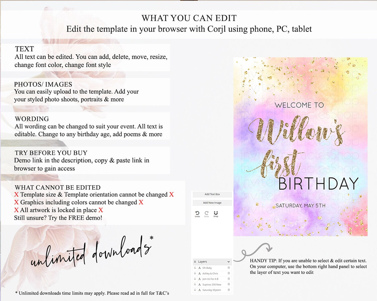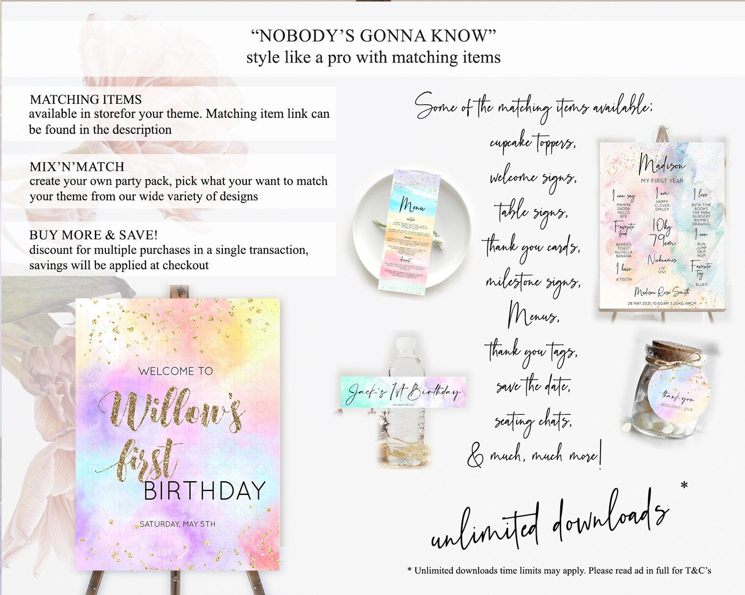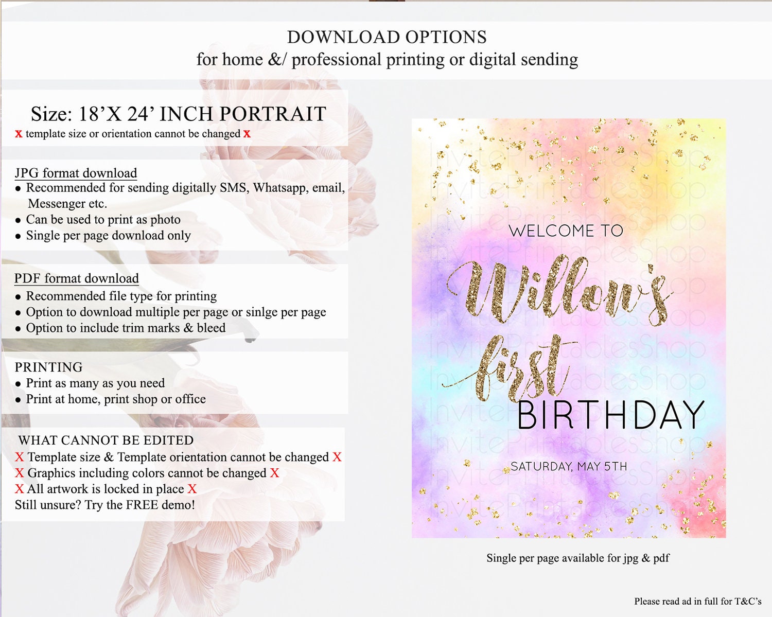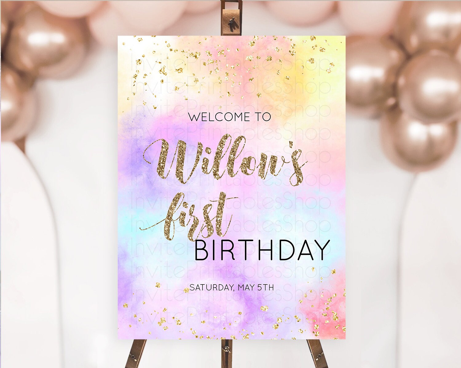Pastel Welcome Sign Pastel Rainbow Welcome Sign Colorful Rainbow Confetti Watercolor Glitter Pastel First Birthday Welcome Sign D10435
