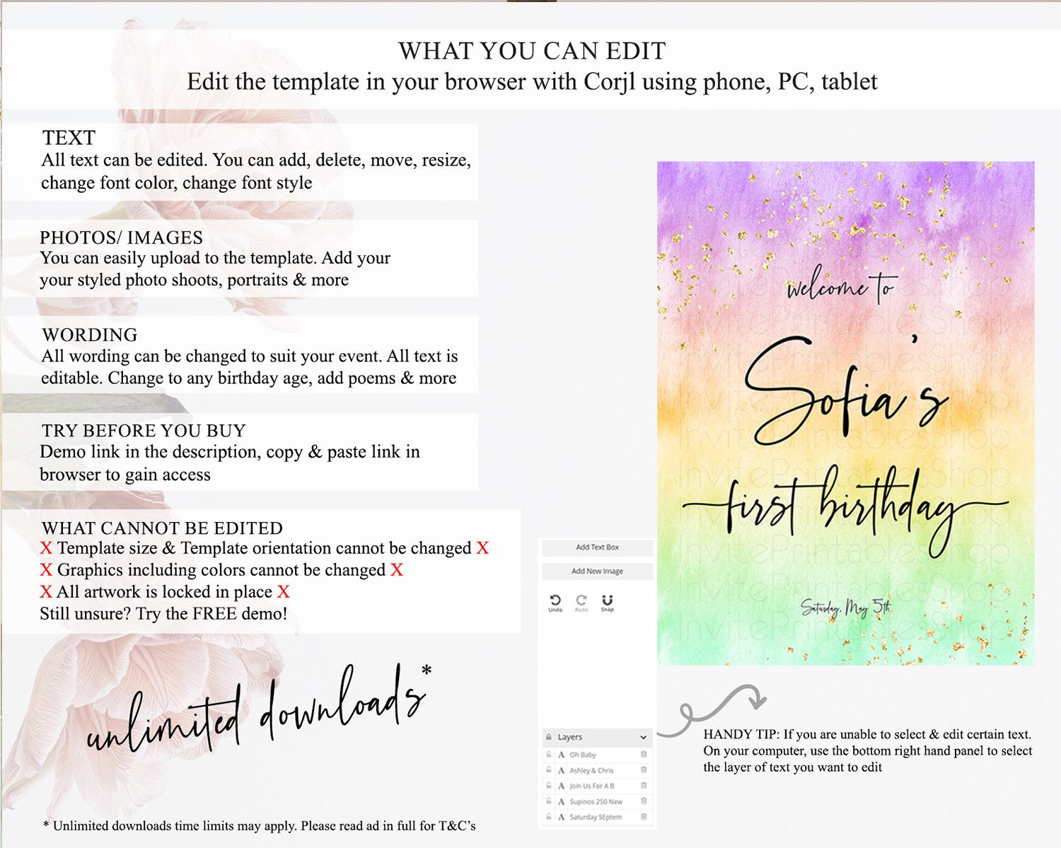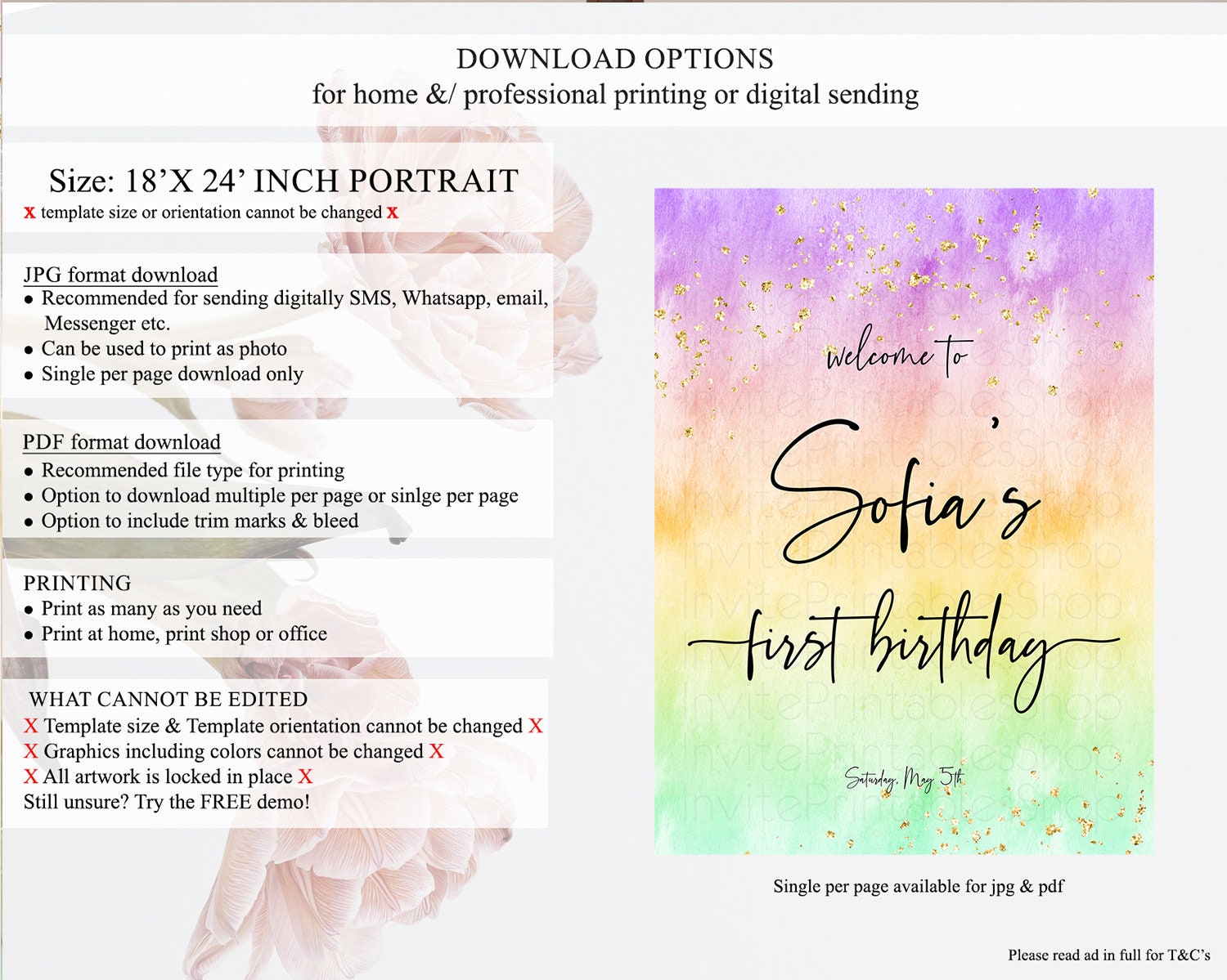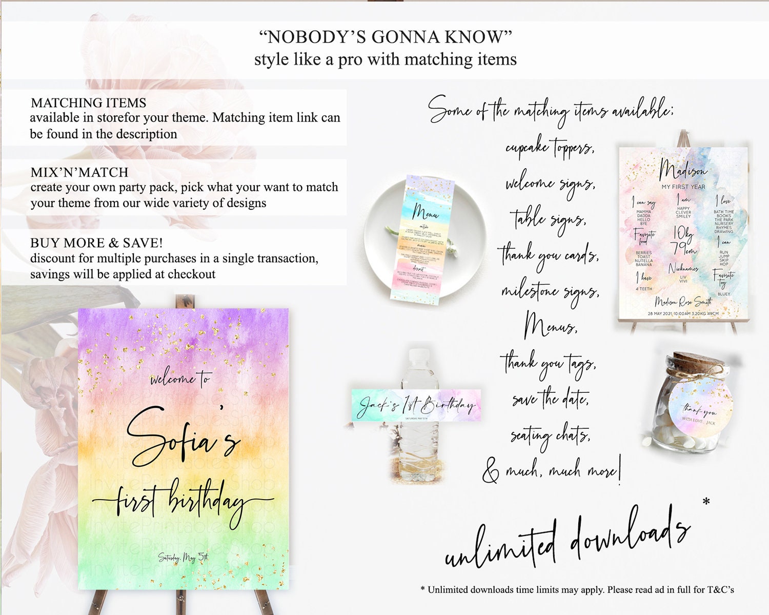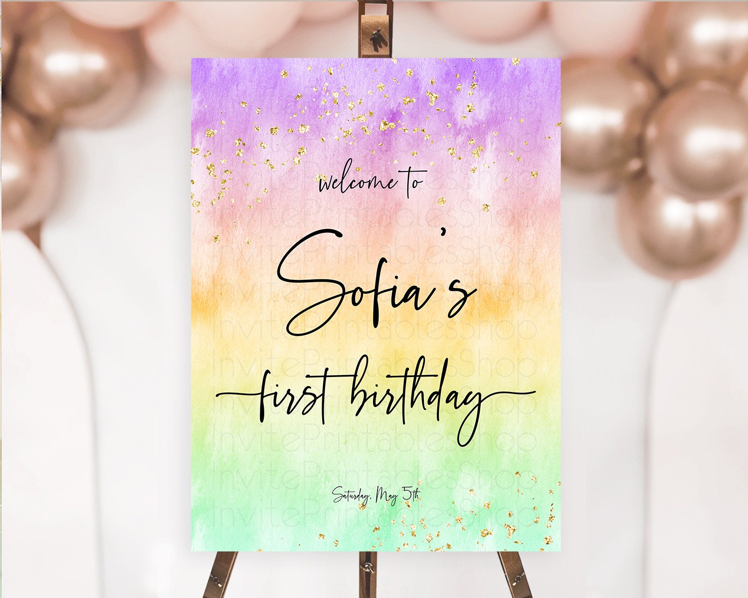 Pastel Welcome Sign Pastel Rainbow Welcome Sign Colorful Rainbow Confetti Watercolor Glitter Pastel First Birthday Welcome Sign D10514