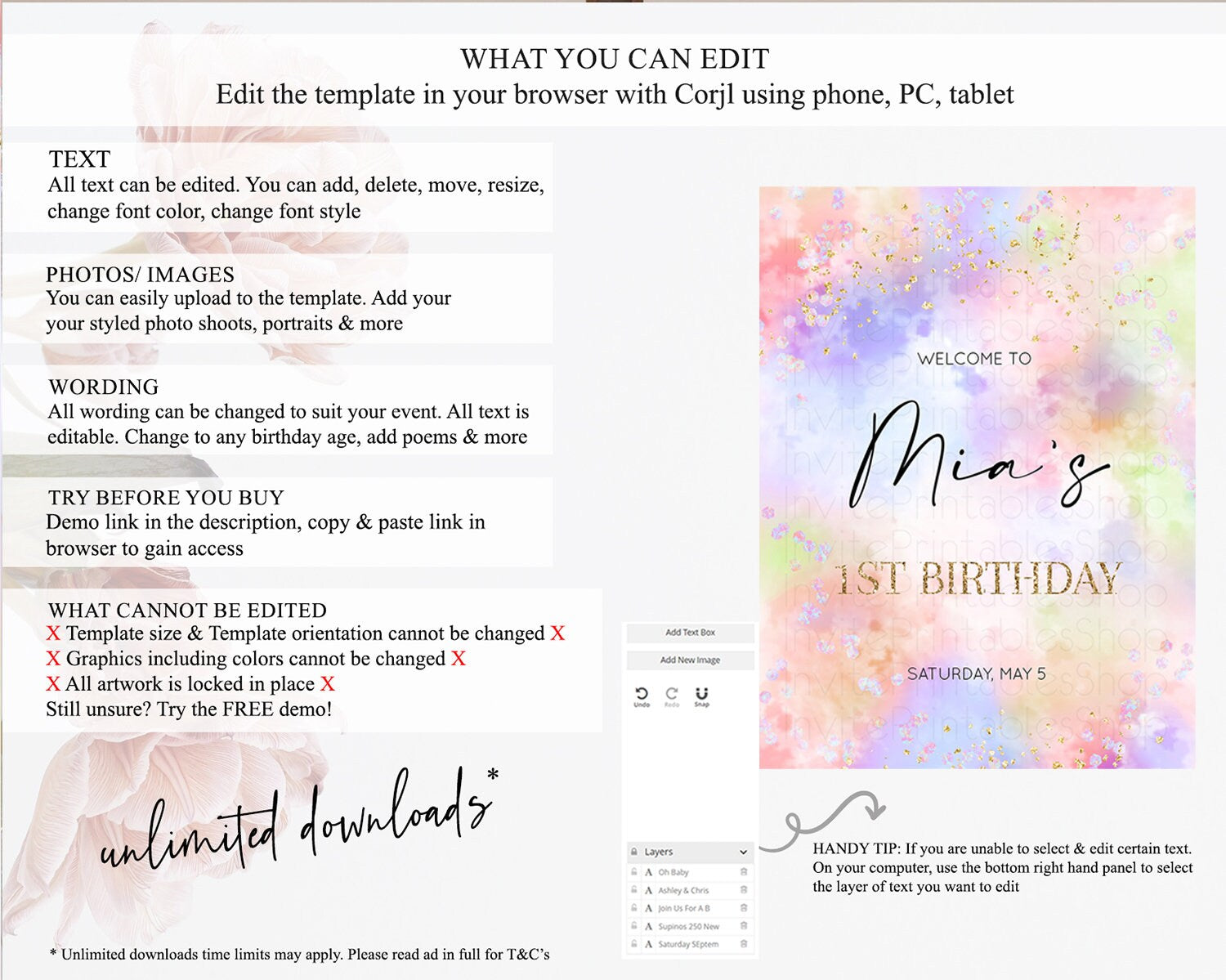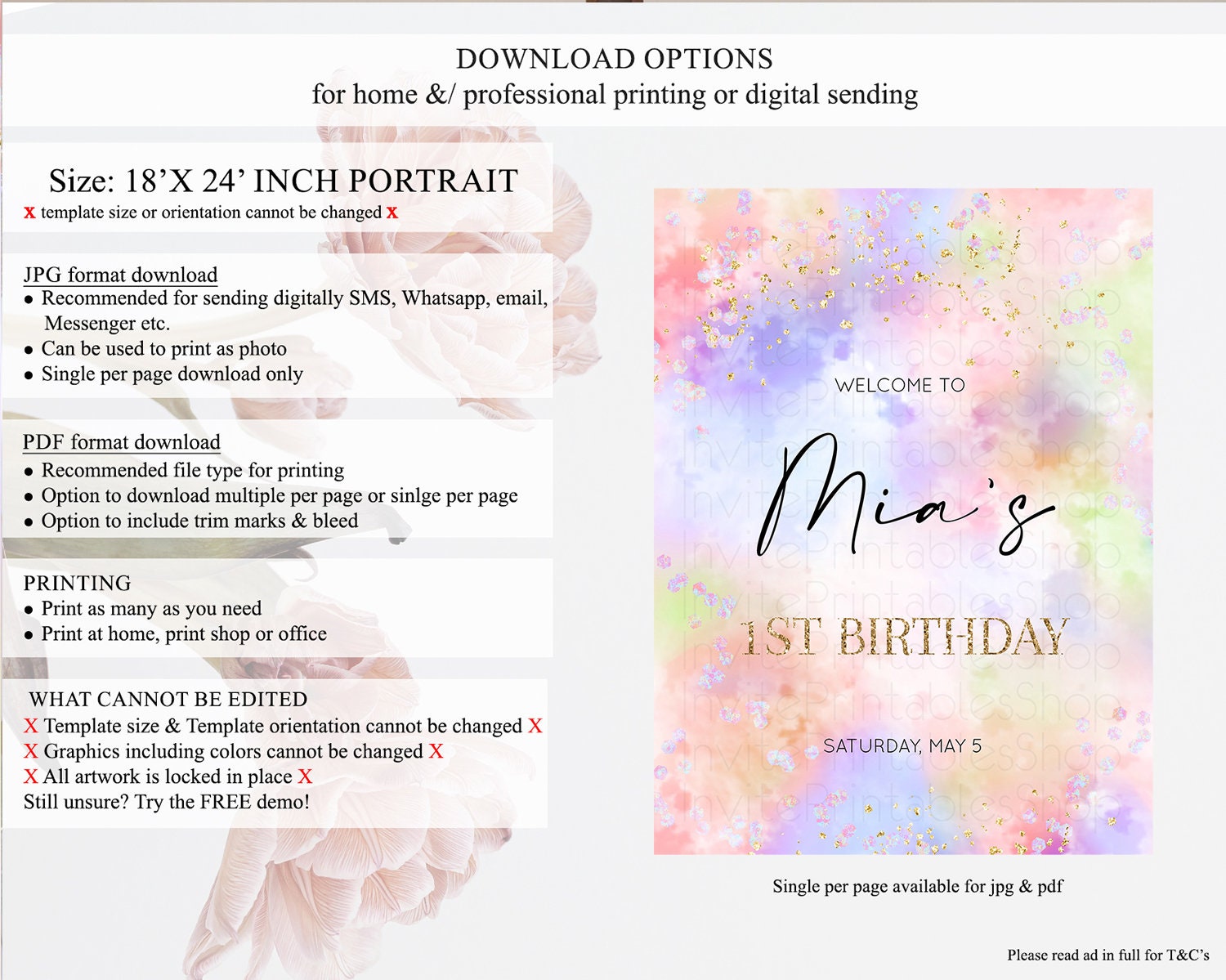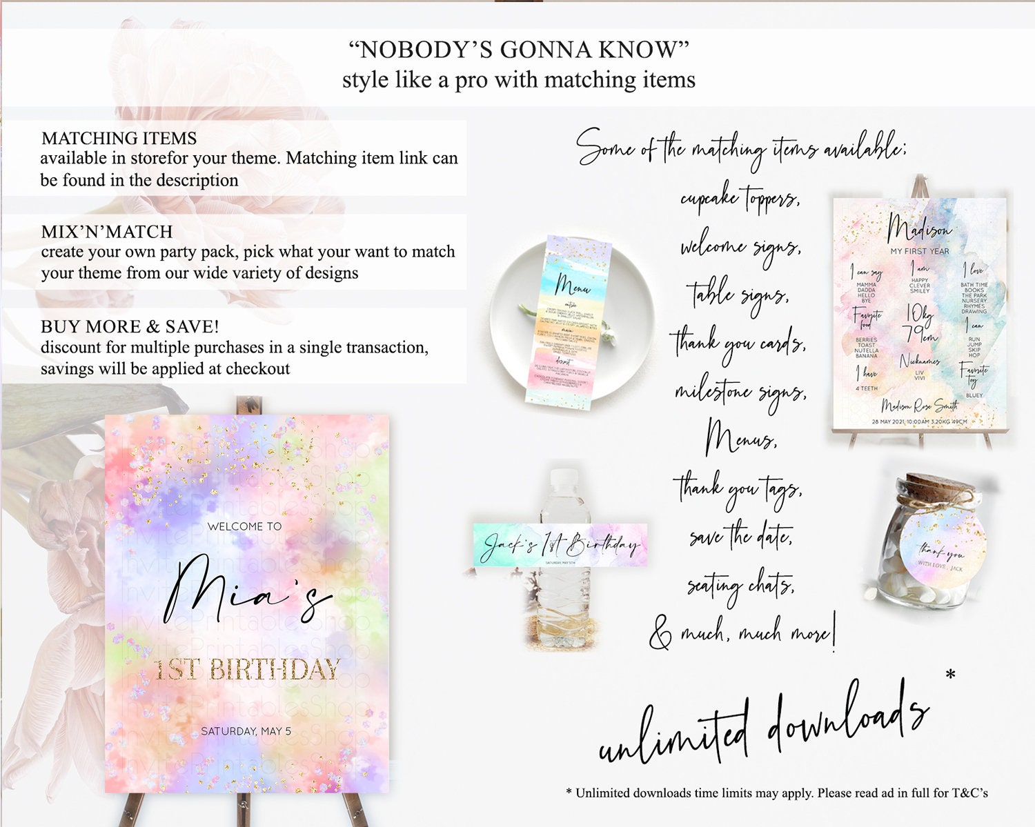 Pastel Welcome Sign Pastel Rainbow Welcome Sign Colorful Rainbow Confetti Watercolor Glitter Pastel First Birthday Welcome Sign D10610