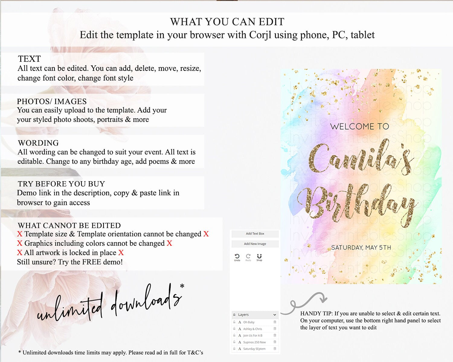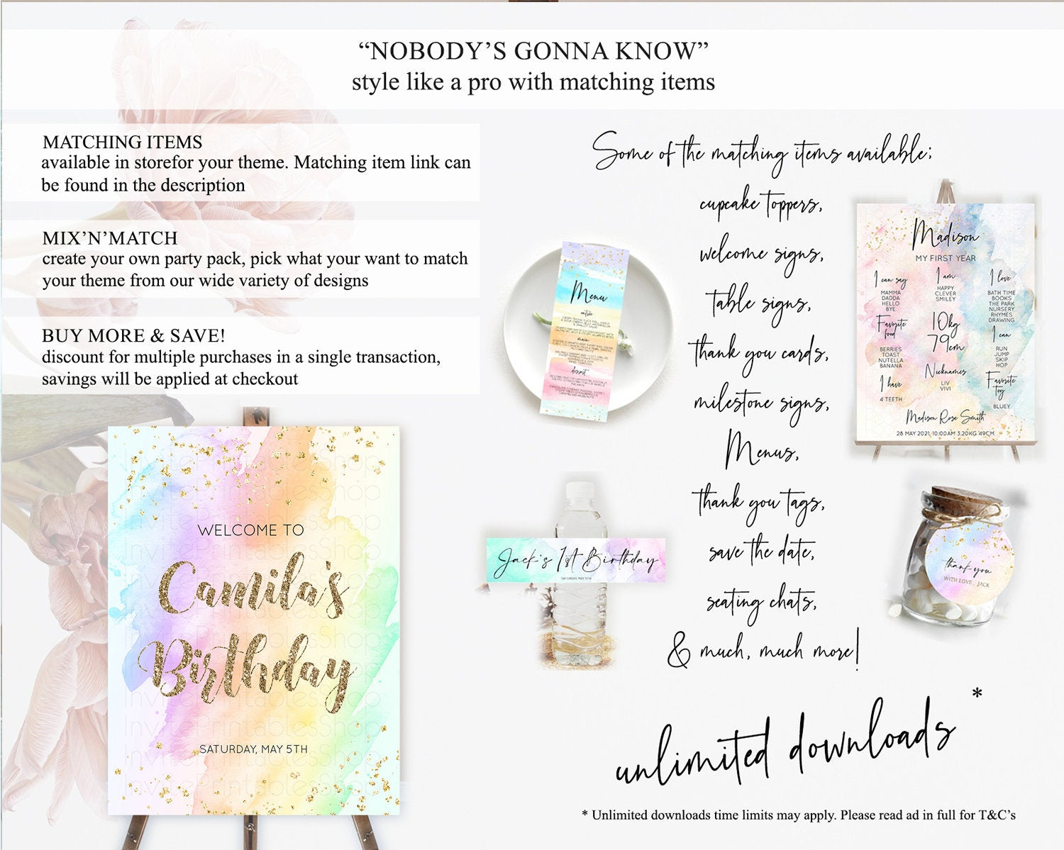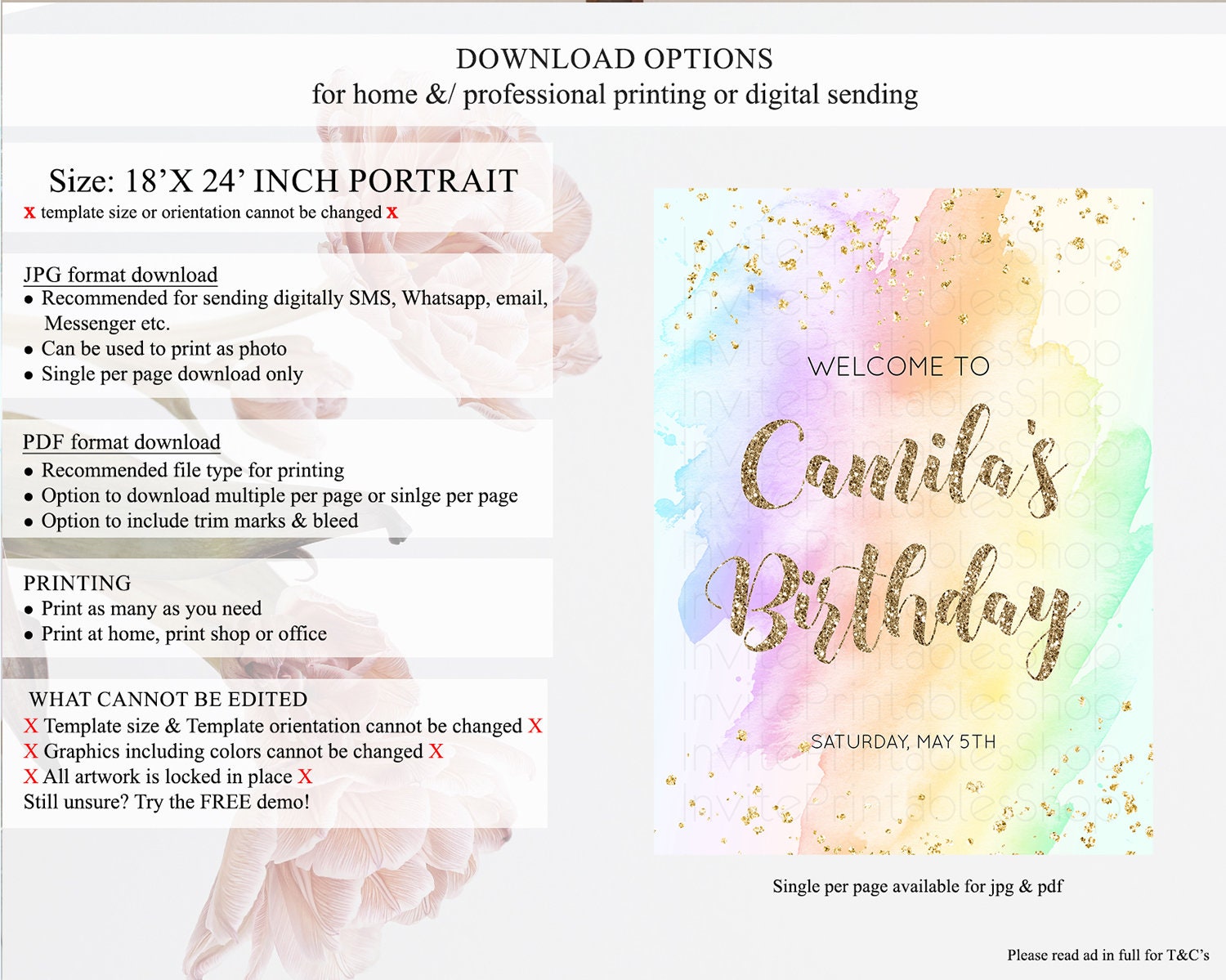 Pastel Welcome Sign Pastel Rainbow Welcome Sign Colorful Rainbow Confetti Watercolor Glitter Pastel First Birthday Welcome Sign D10643