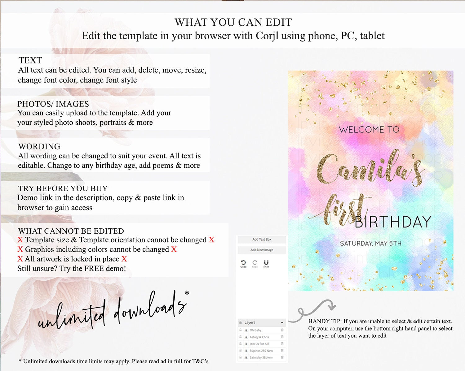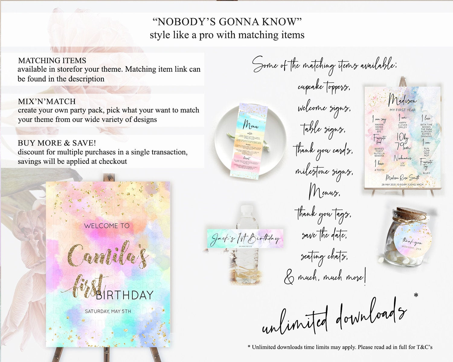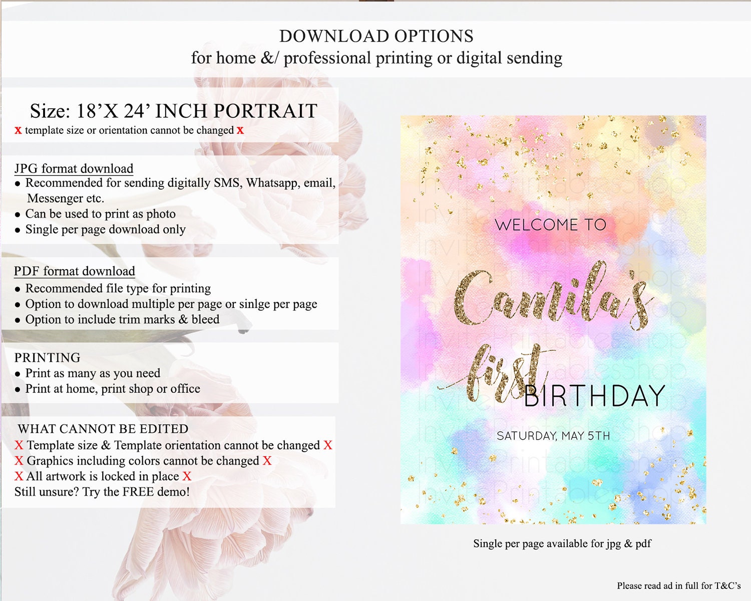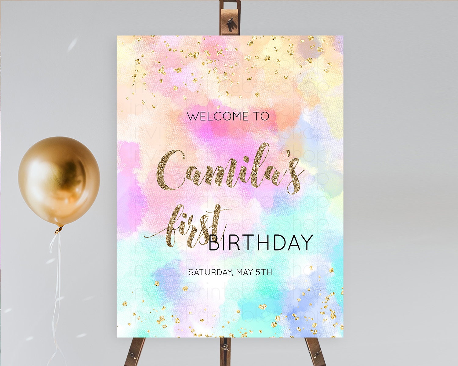 Pastel Welcome Sign Pastel Rainbow Welcome Sign Colorful Rainbow Confetti Watercolor Glitter Pastel First Birthday Welcome Sign D10669