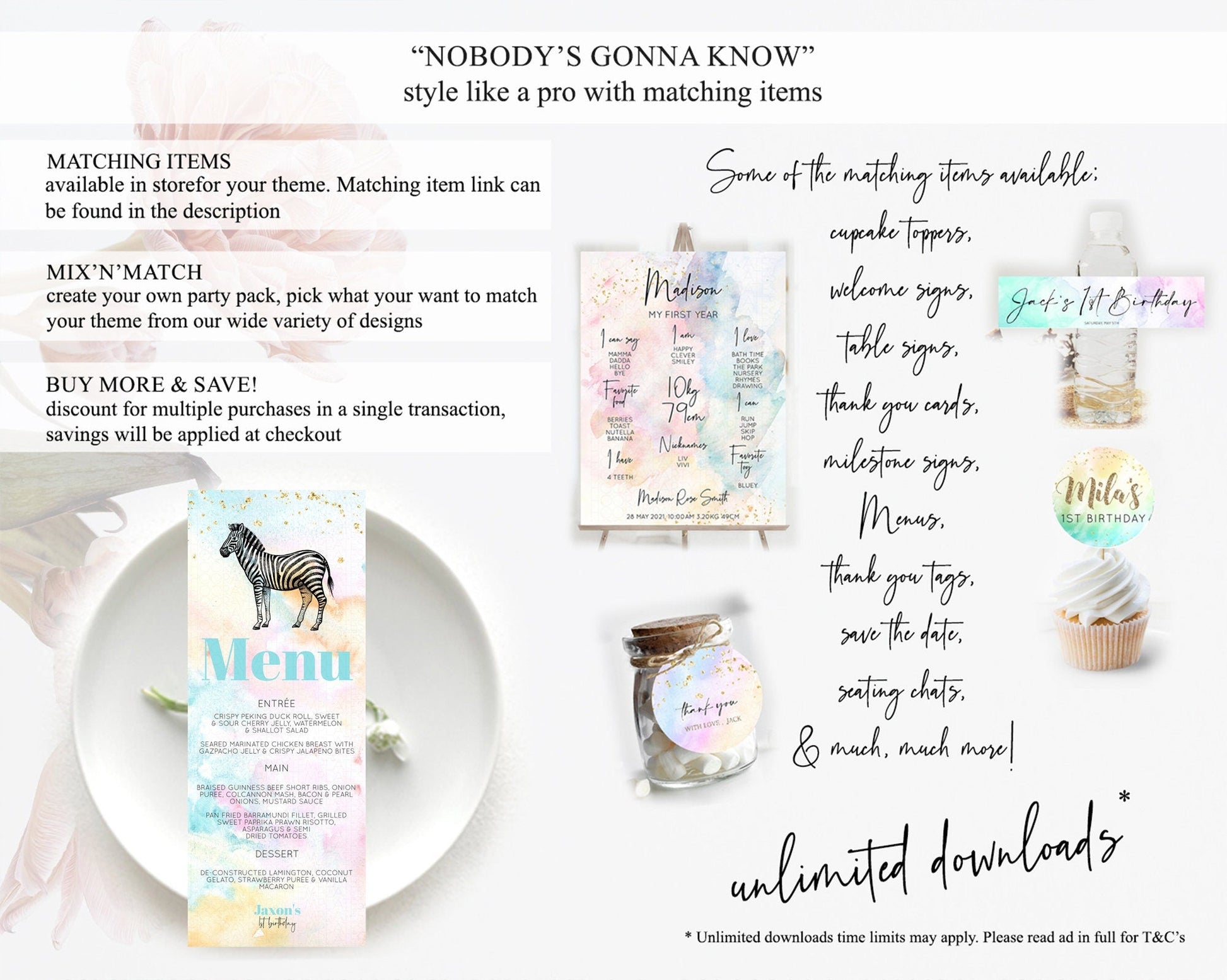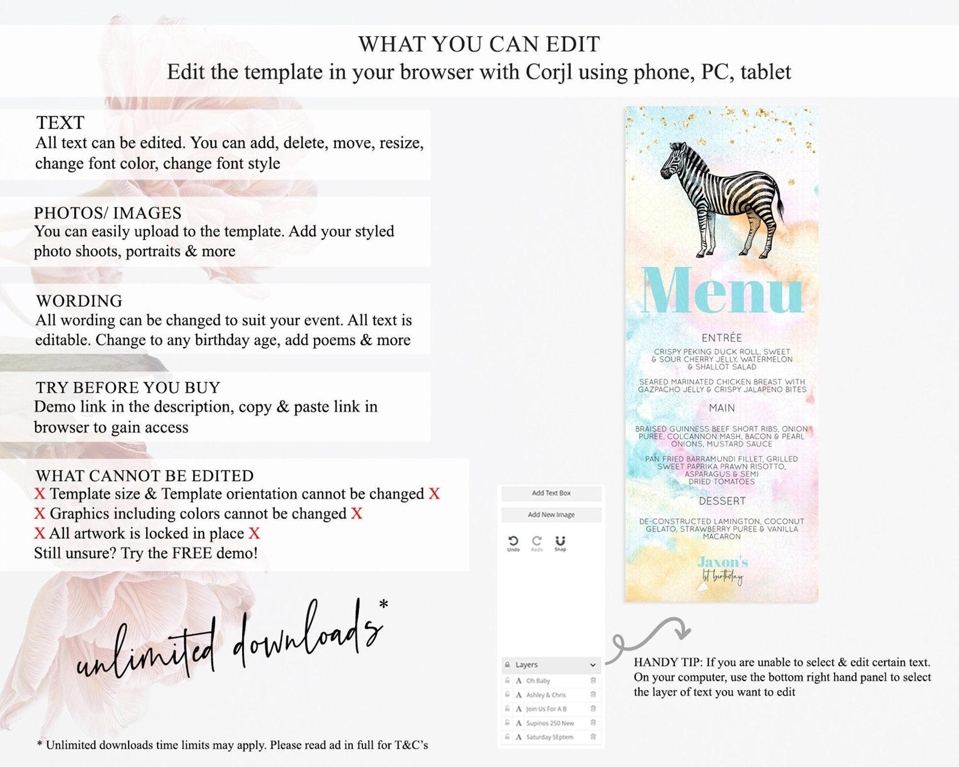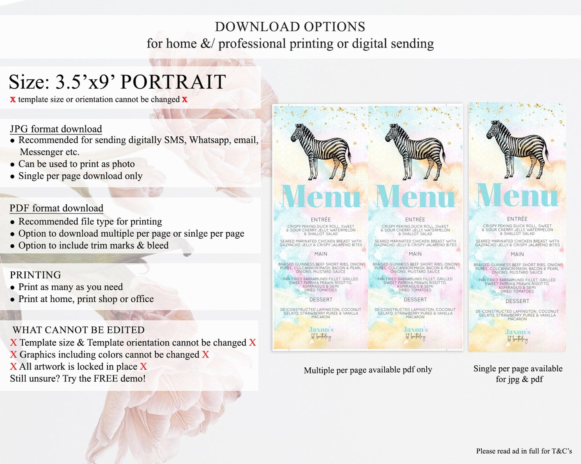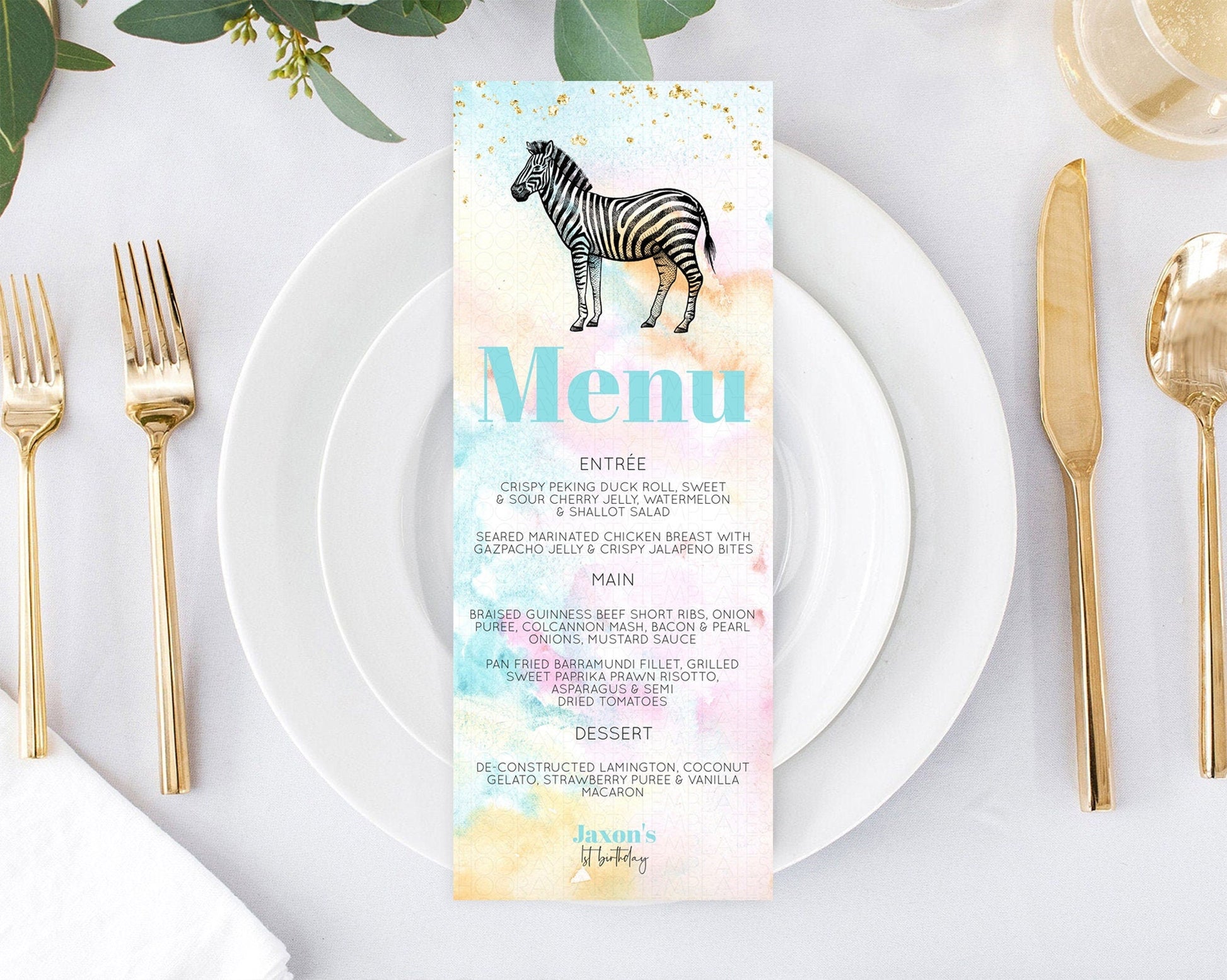 Pastel Zebra Menu Rainbow Zebra Menu Template Colorful Rainbow Table Decor Pastel Dinner Dessert Menu Zebra Party Food Menu D10281