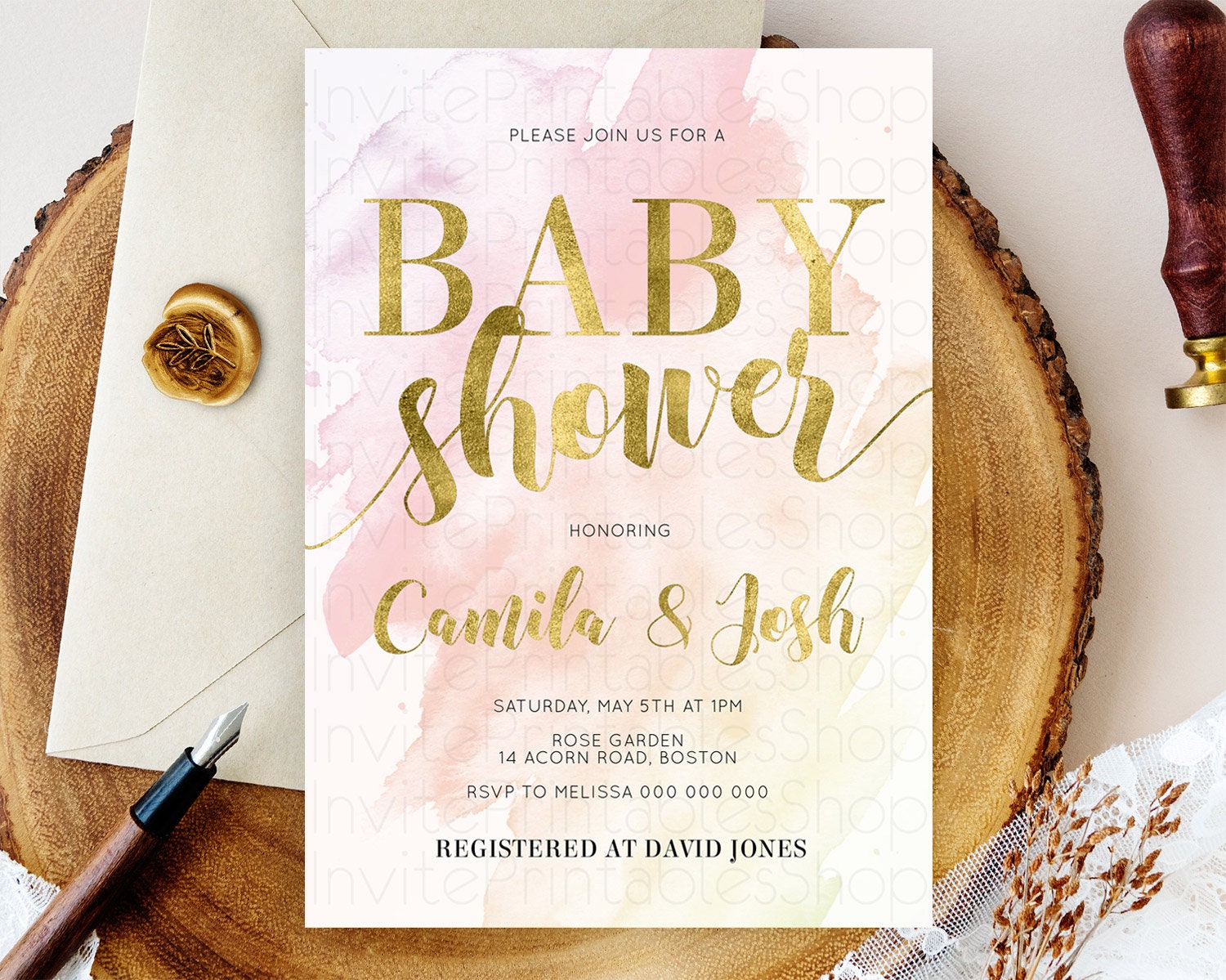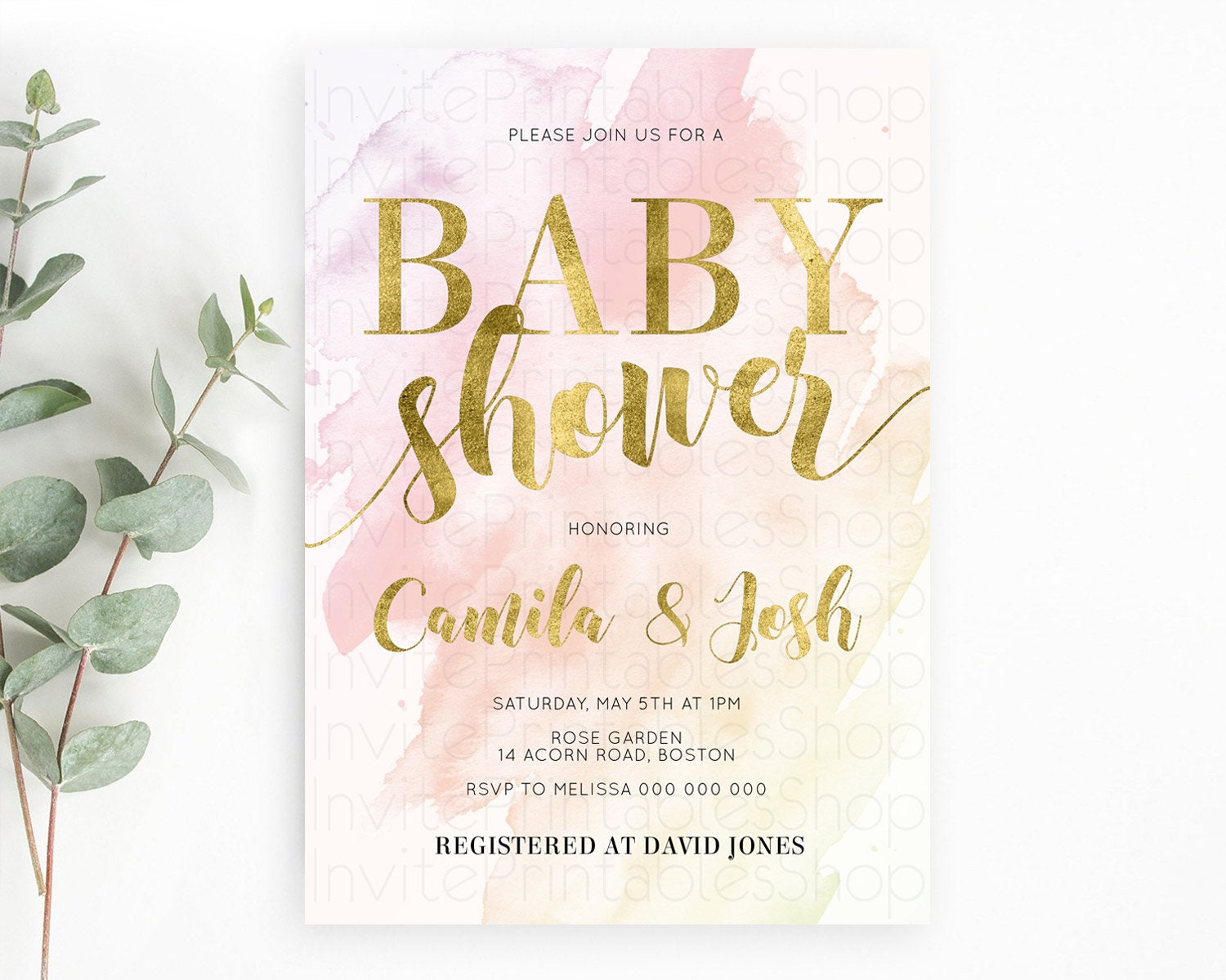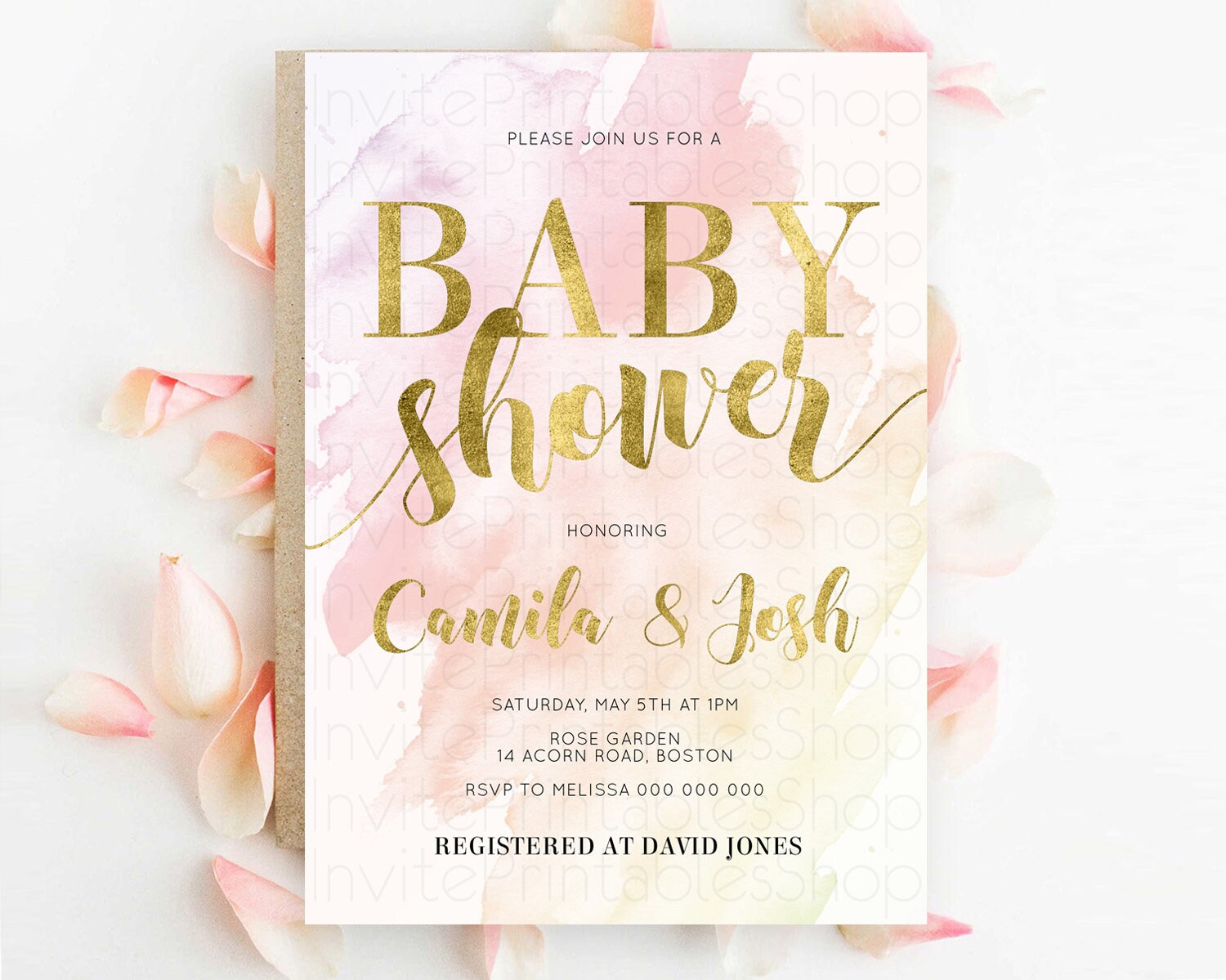 Pink Baby Shower Invitation Pink Watercolor Baby Shower Invitation Pastel Pink Watercolor Invitation Pink Splash Gold Invitation D11025