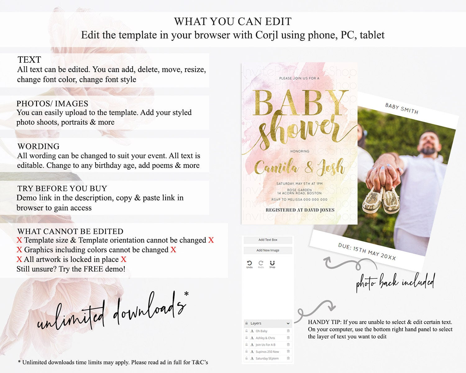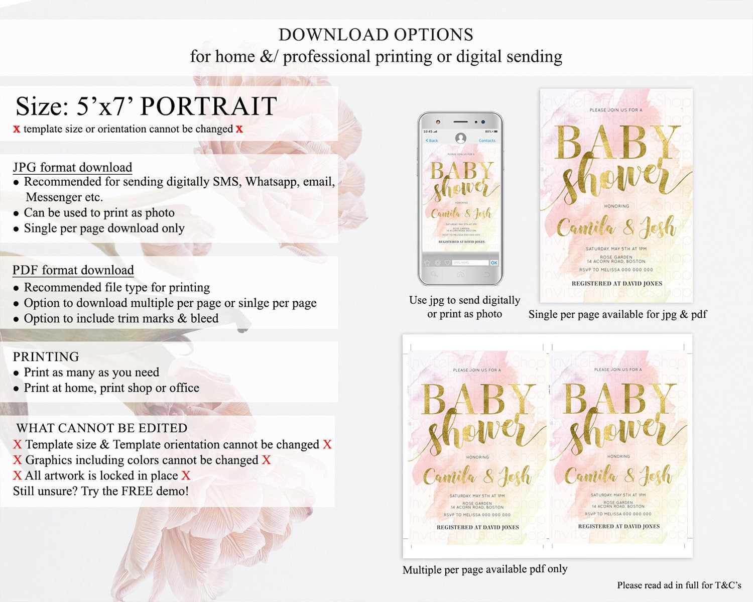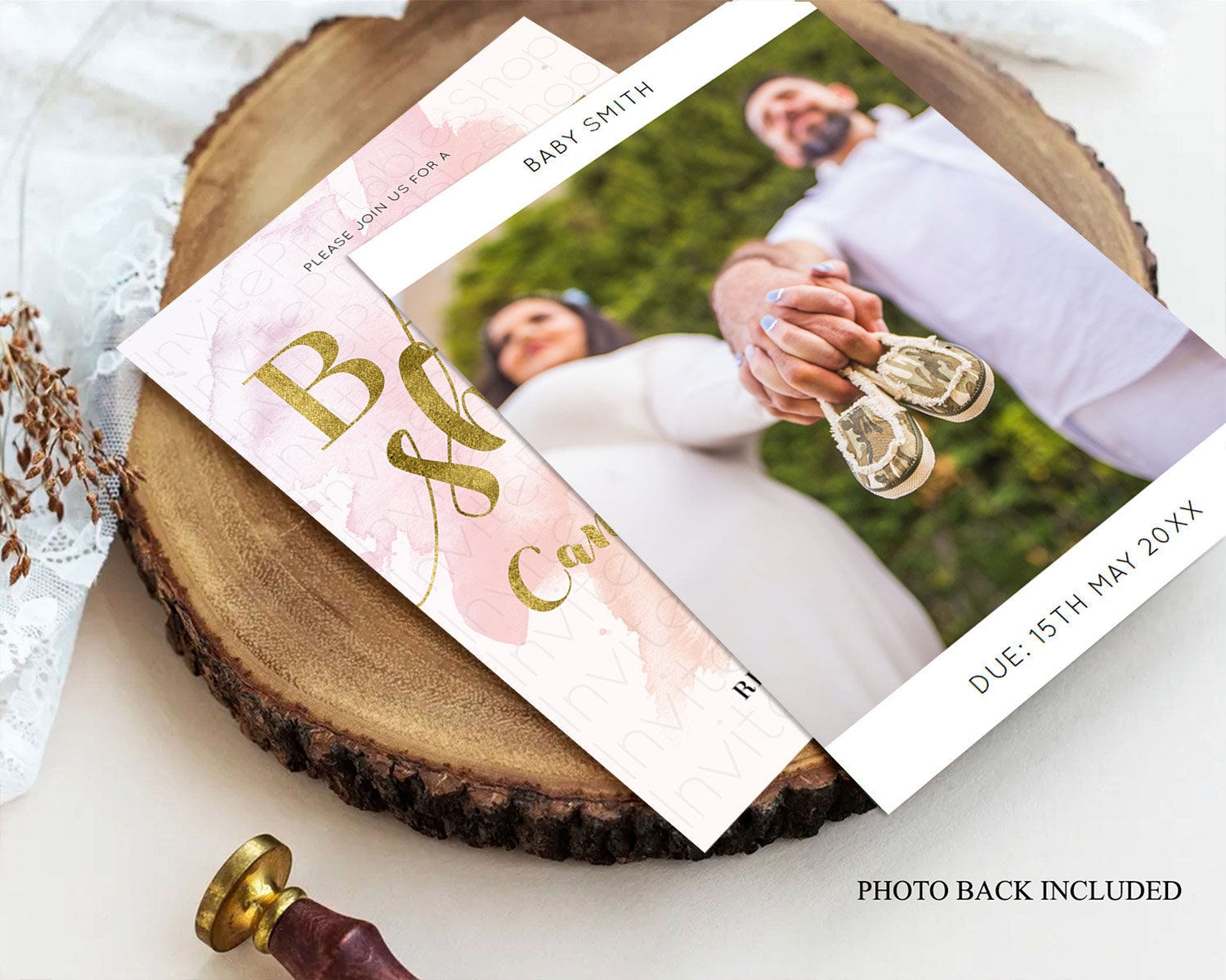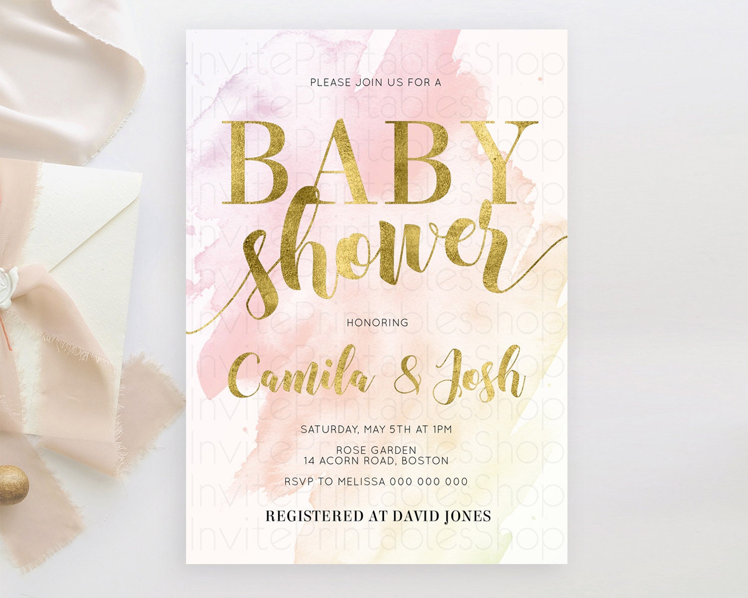 Pink Baby Shower Invitation Pink Watercolor Baby Shower Invitation Pastel Pink Watercolor Invitation Pink Splash Gold Invitation D11025