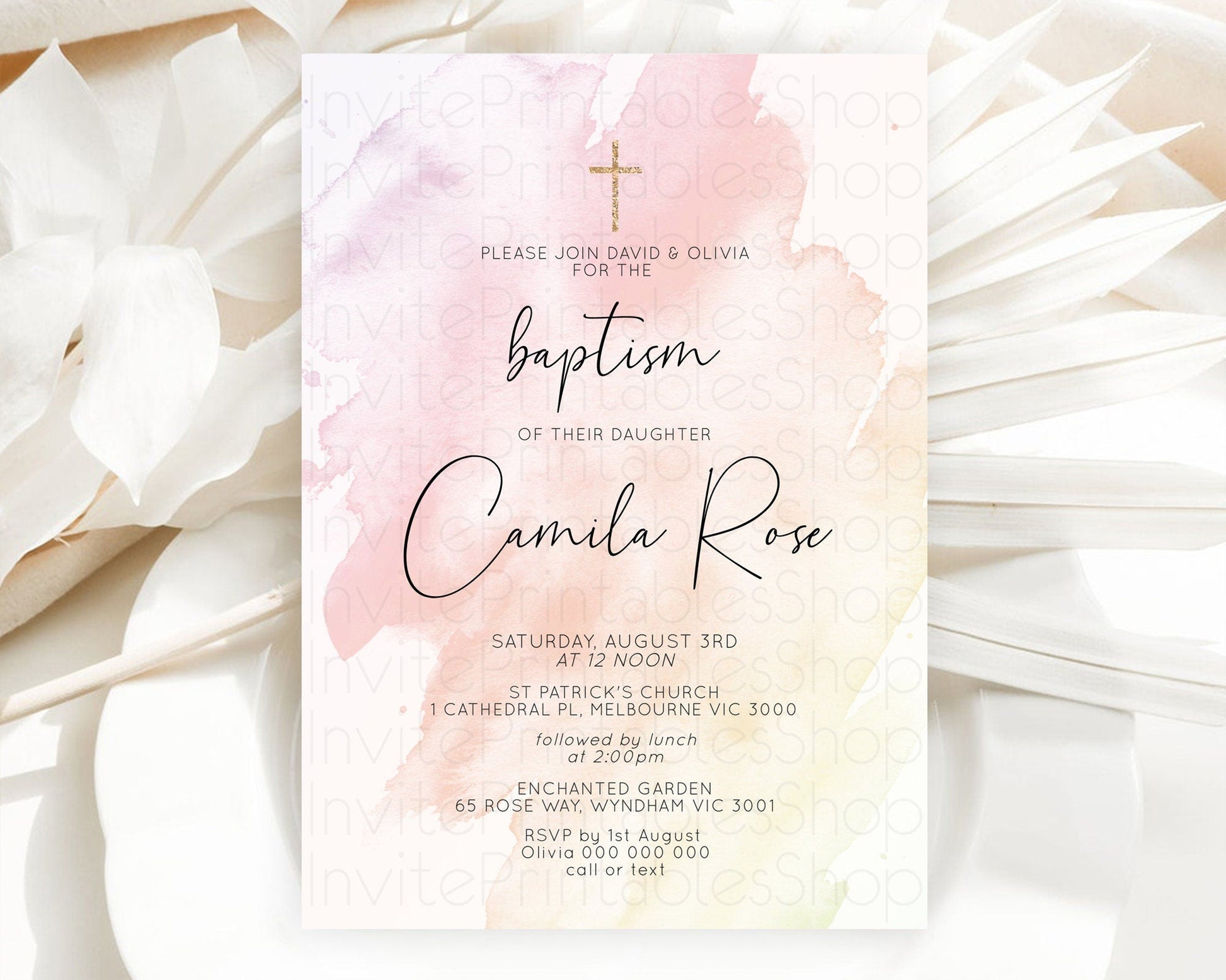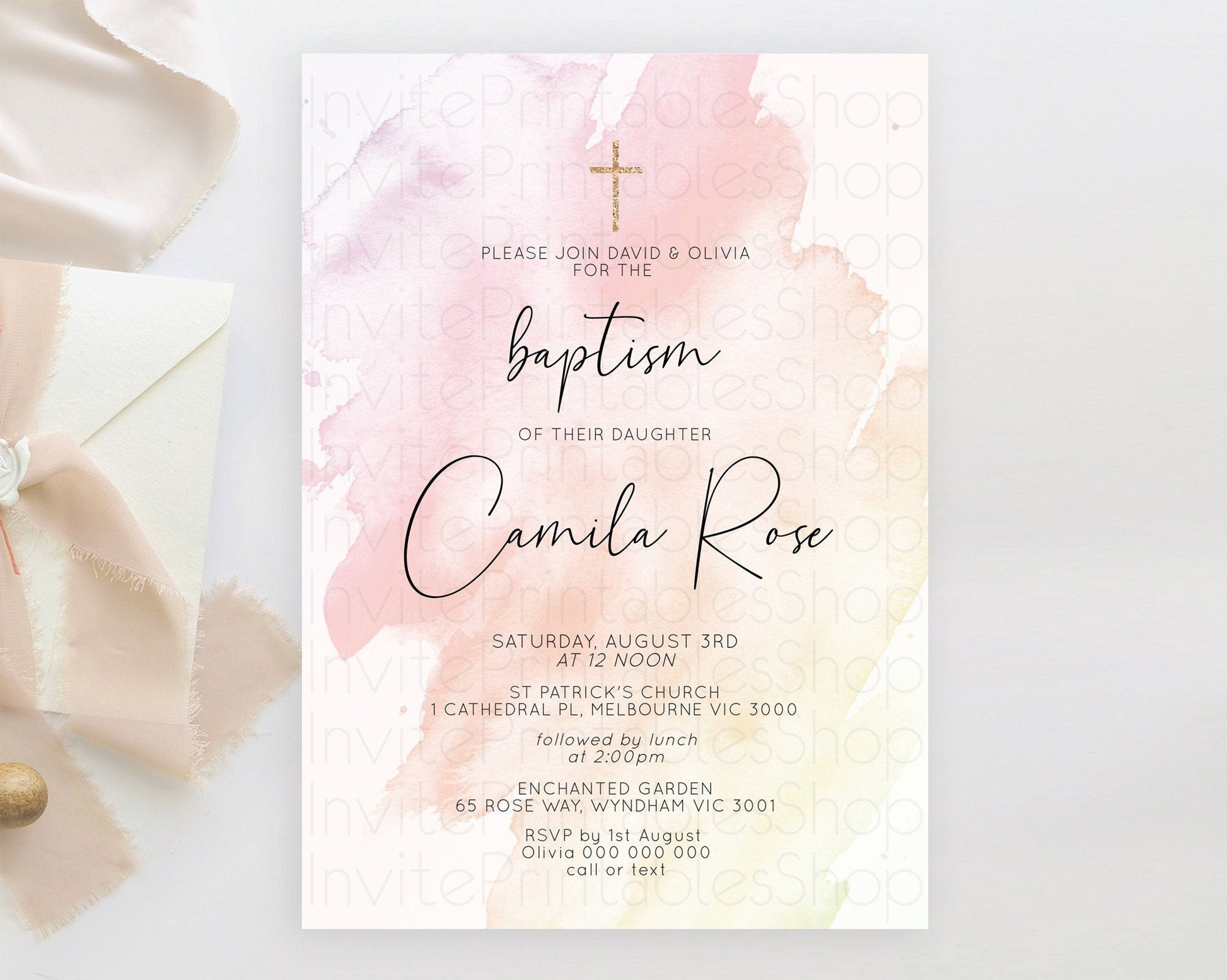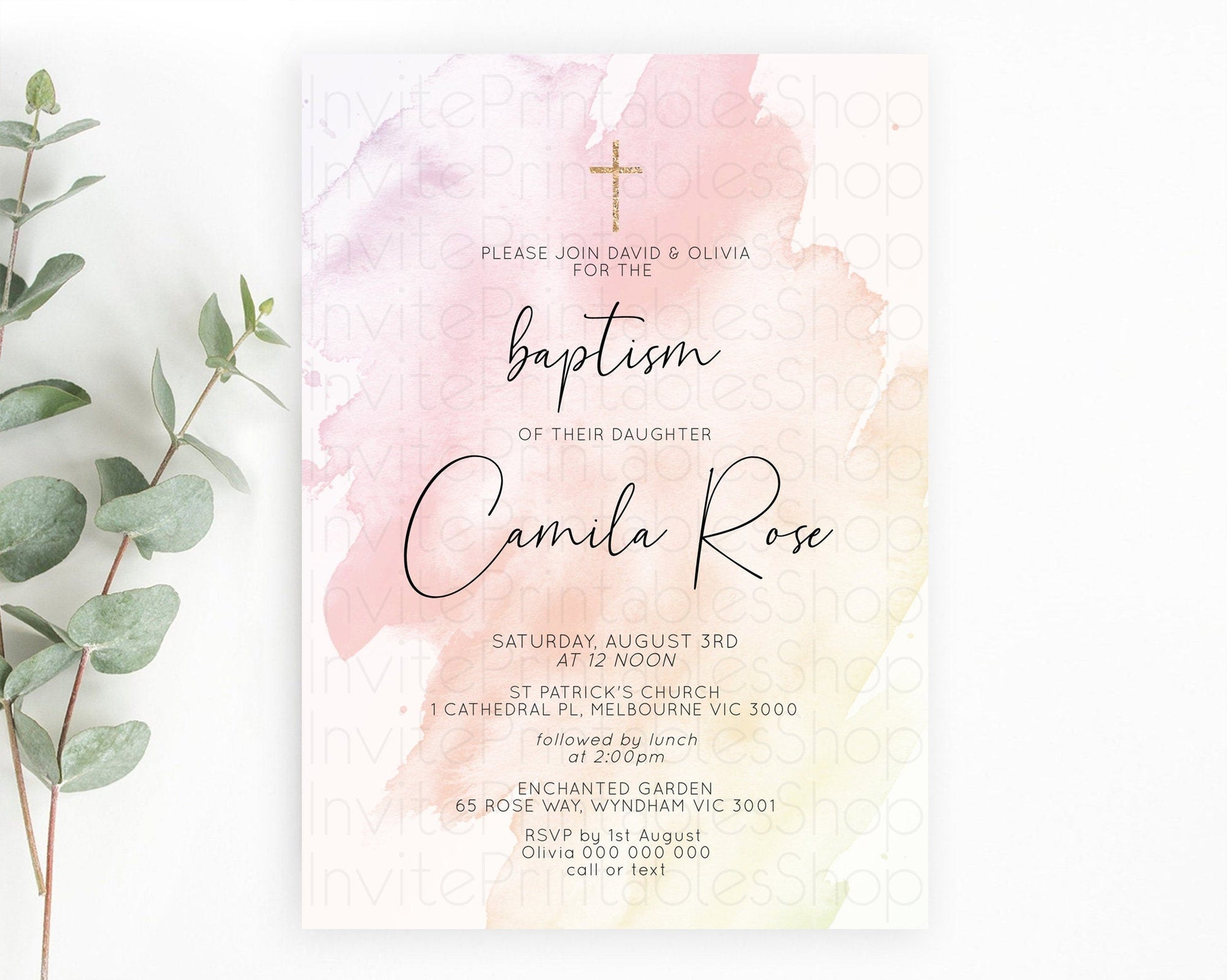 Pink Baptism Invitation Pink Watercolor Baptism 1st Birthday Invitation Pastel Pink Watercolor Christening Invite Pink Splash D10164