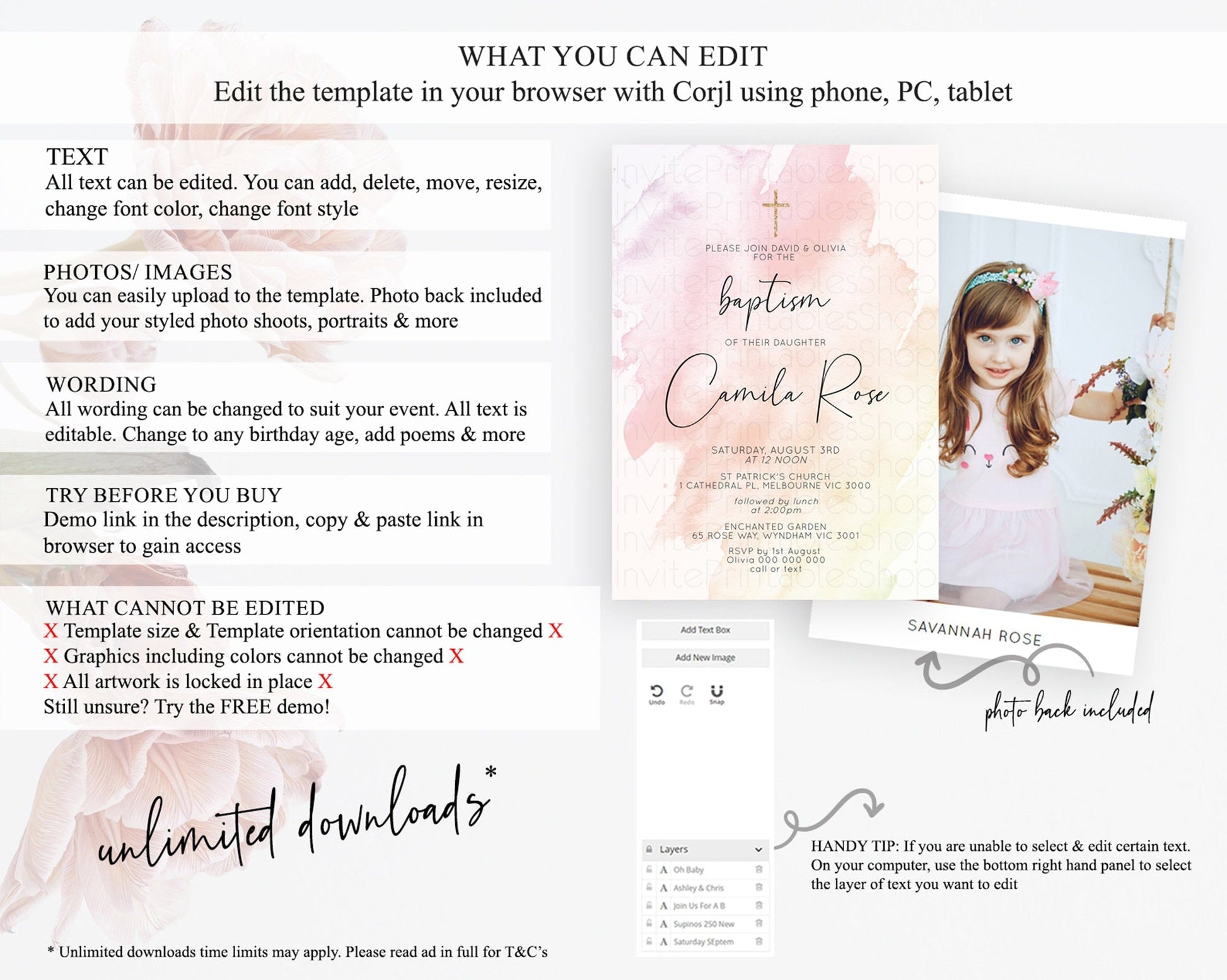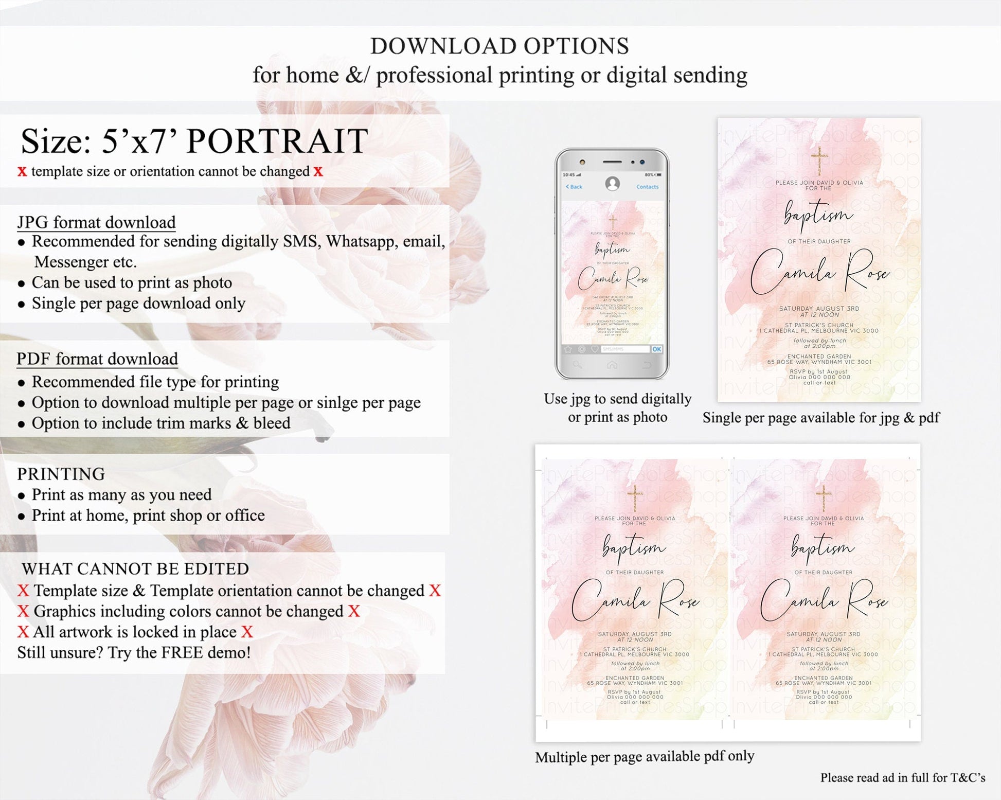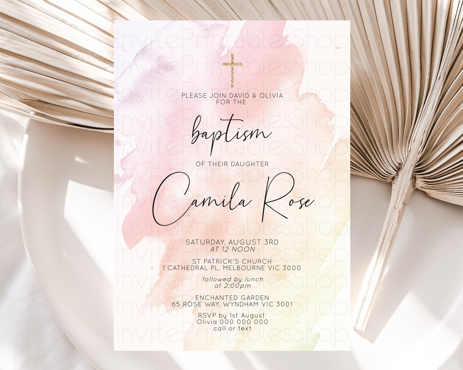 Pink Baptism Invitation Pink Watercolor Baptism 1st Birthday Invitation Pastel Pink Watercolor Christening Invite Pink Splash D10164