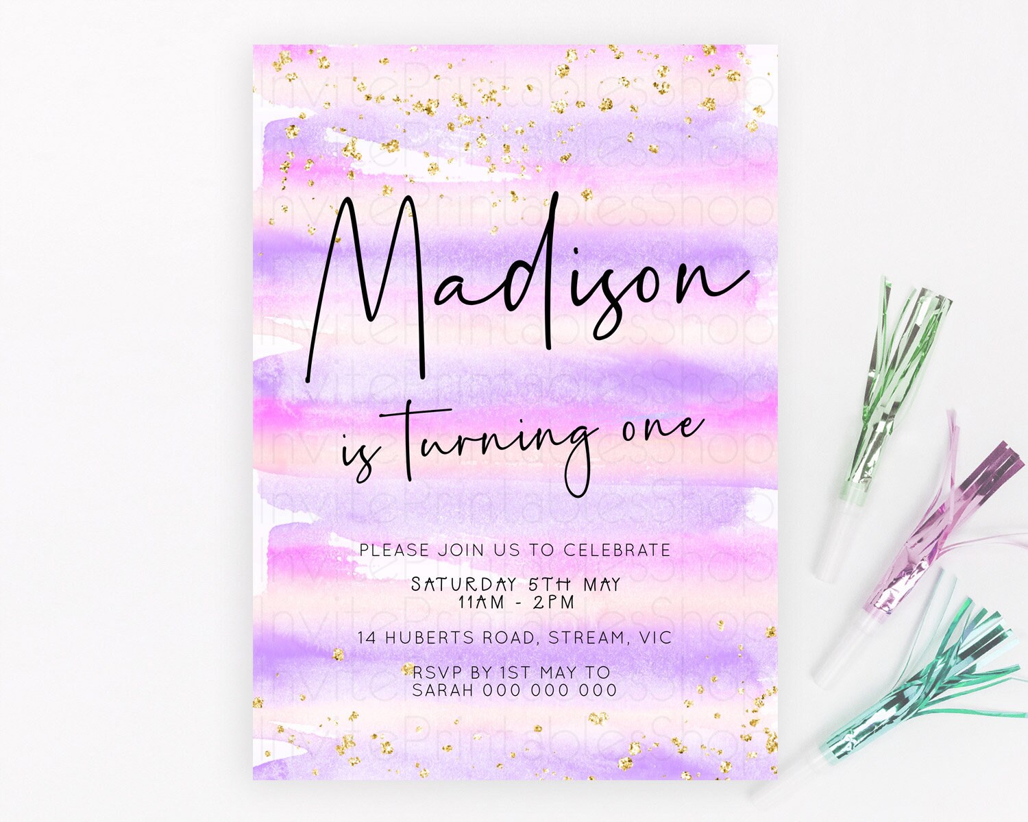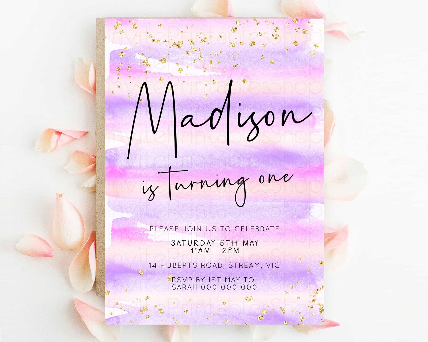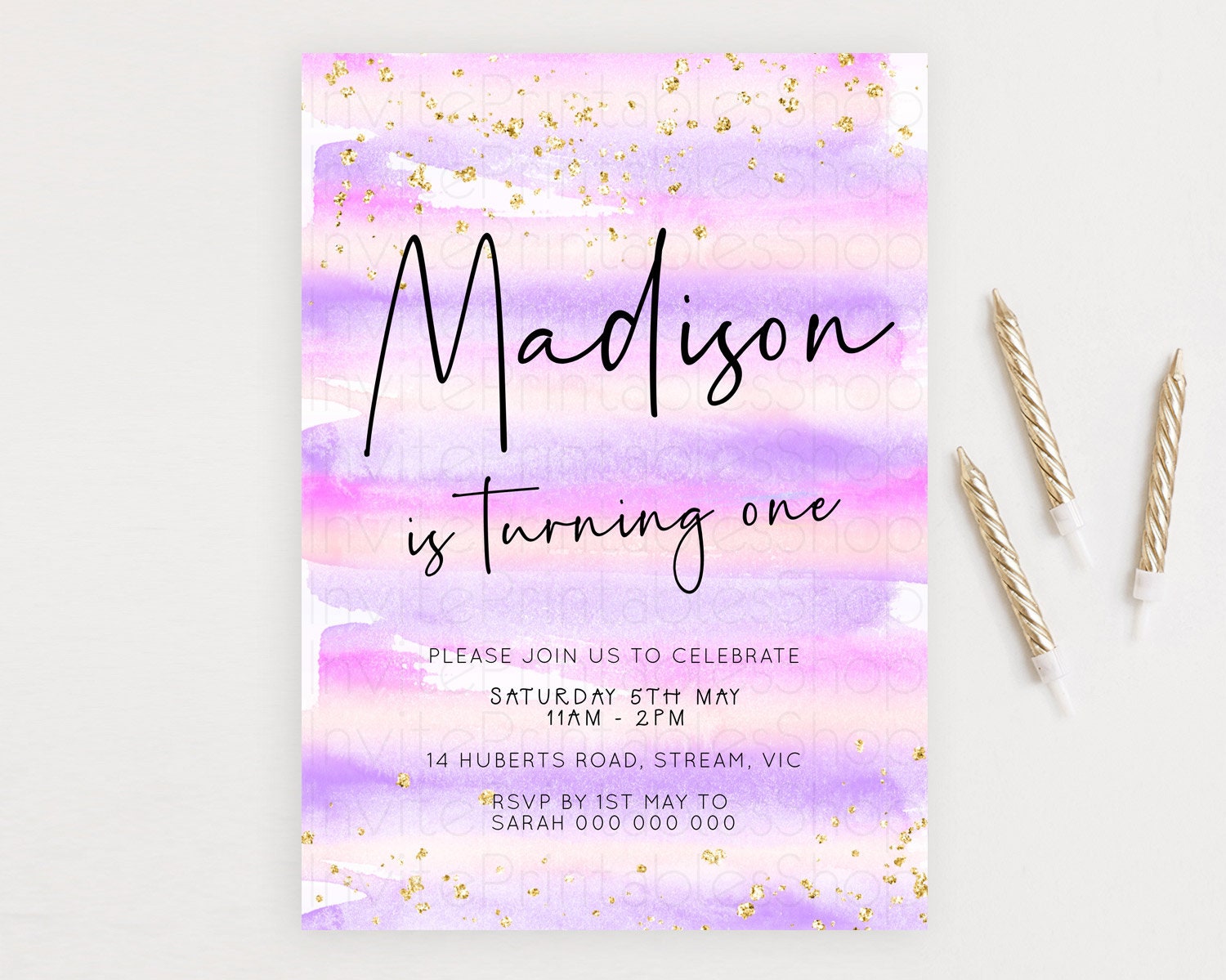 Pink Birthday Invitation pink Watercolor Invitation Pastel pink Watercolor Invitation pink Splash Gold Invitation 1st First Birthday D23035