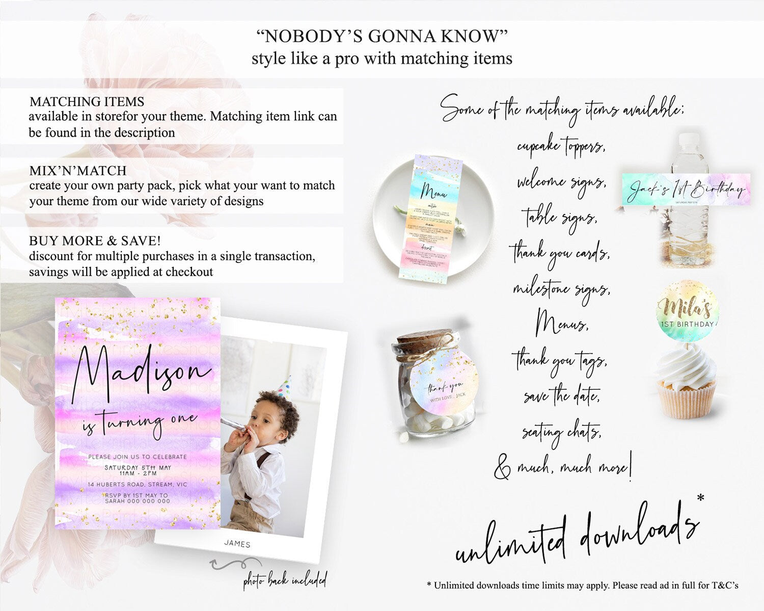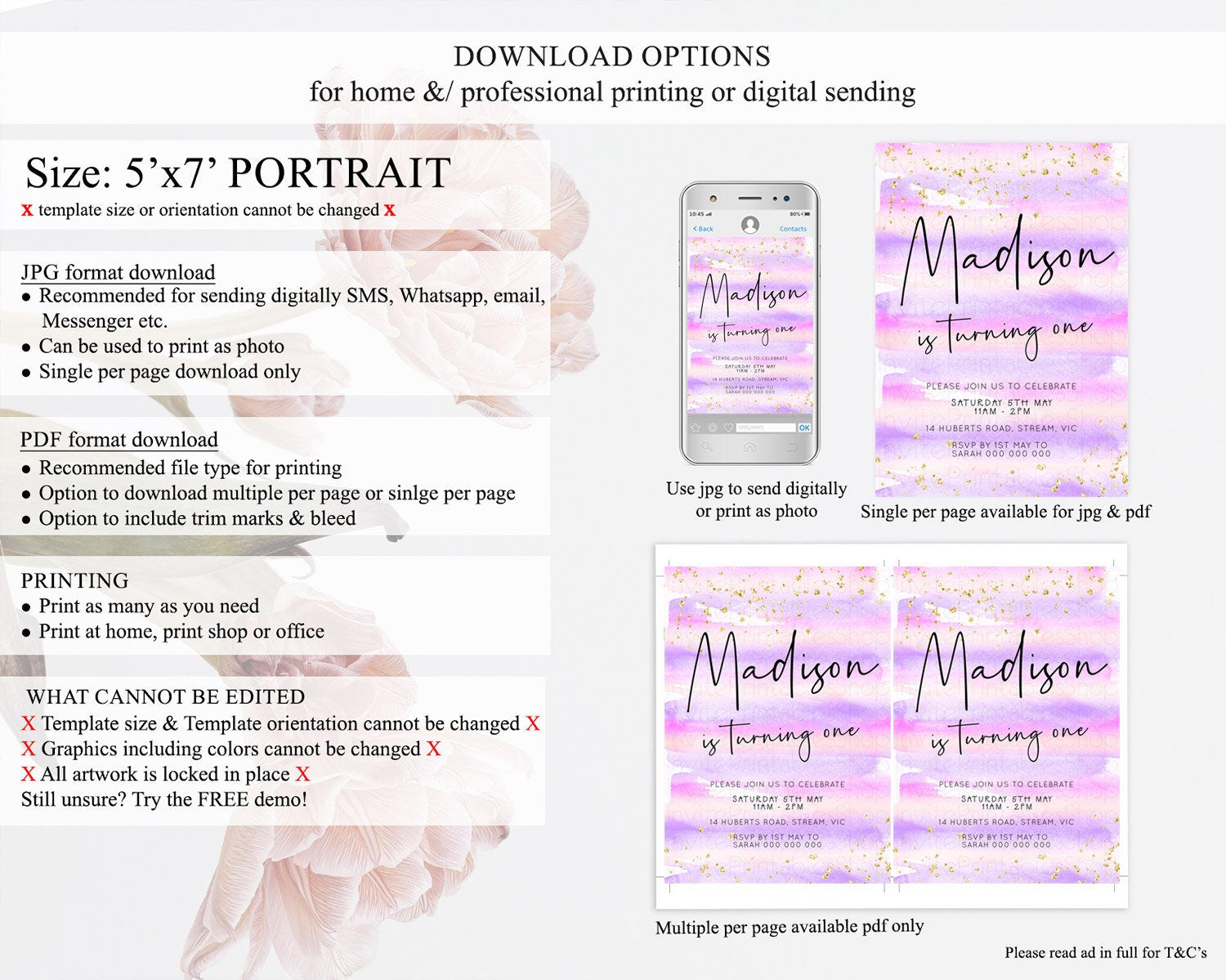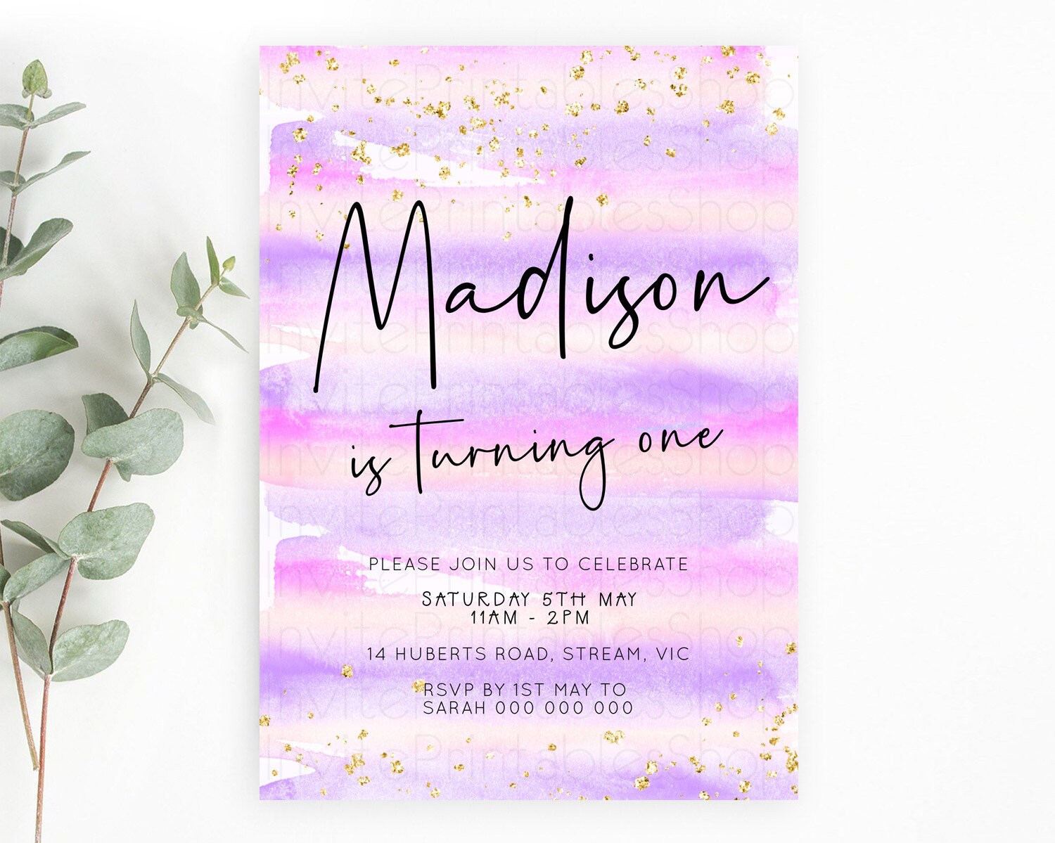 Pink Birthday Invitation pink Watercolor Invitation Pastel pink Watercolor Invitation pink Splash Gold Invitation 1st First Birthday D23035