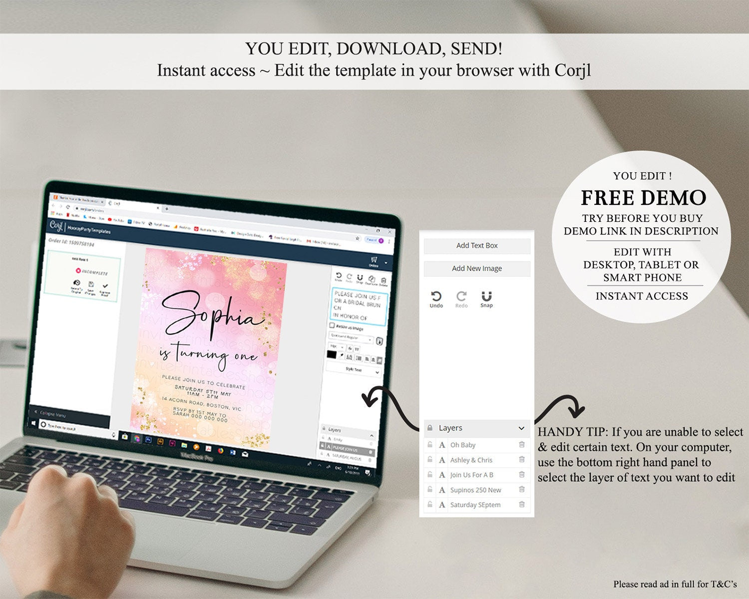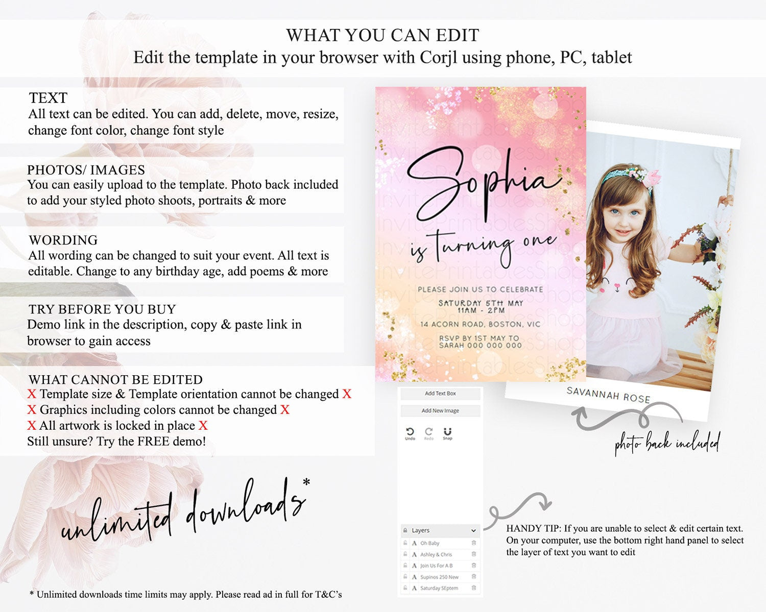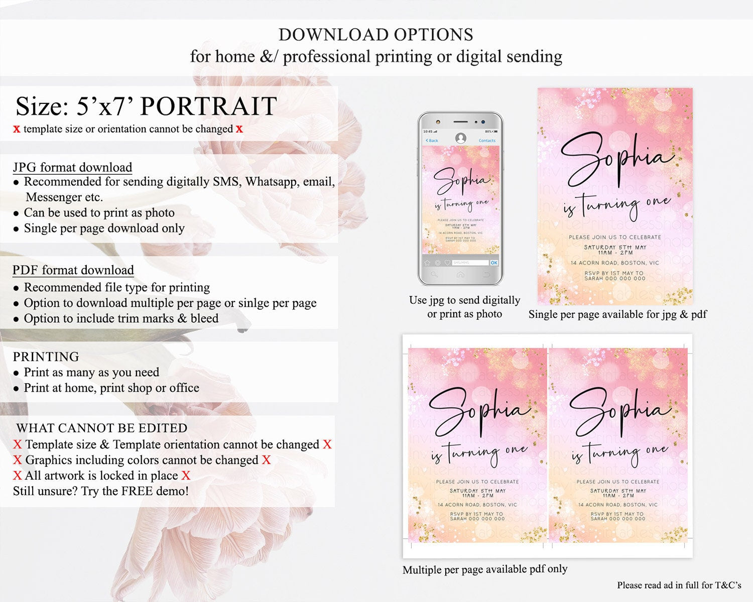 Pink Birthday Invitation pink Watercolor Invitation Pastel pink Watercolor Invitation pink Splash Gold Invitation 1st First Birthday D23095