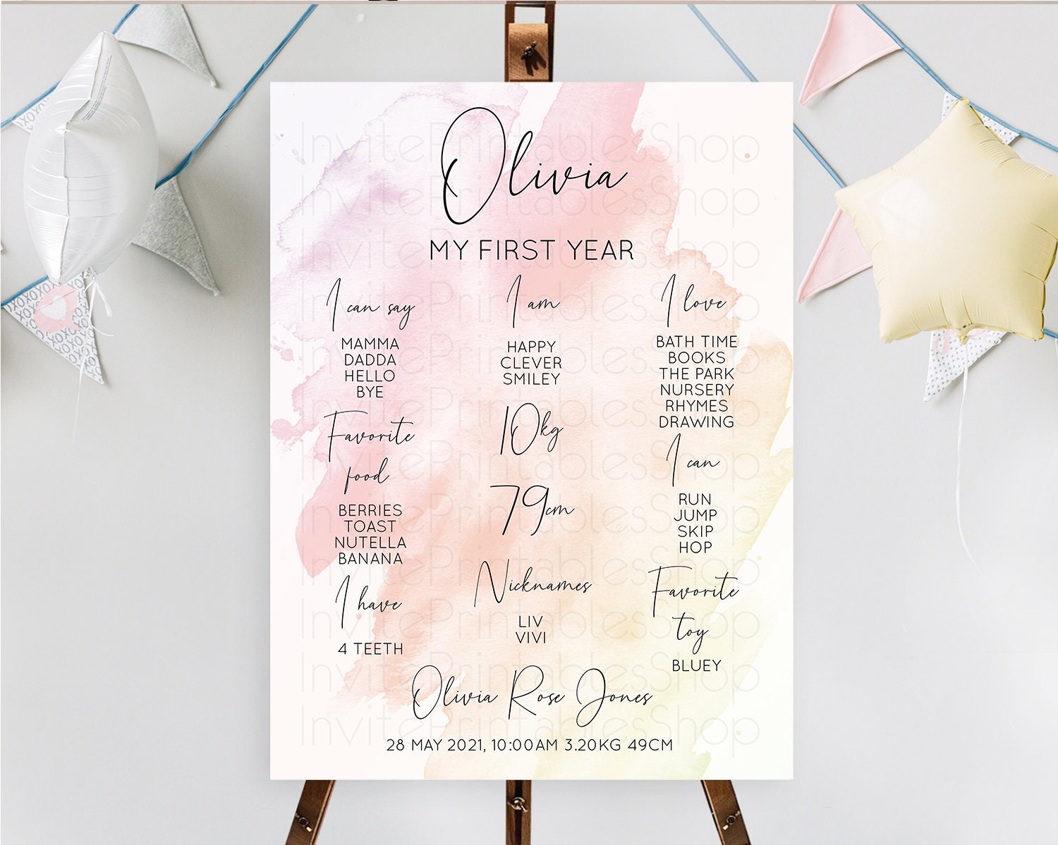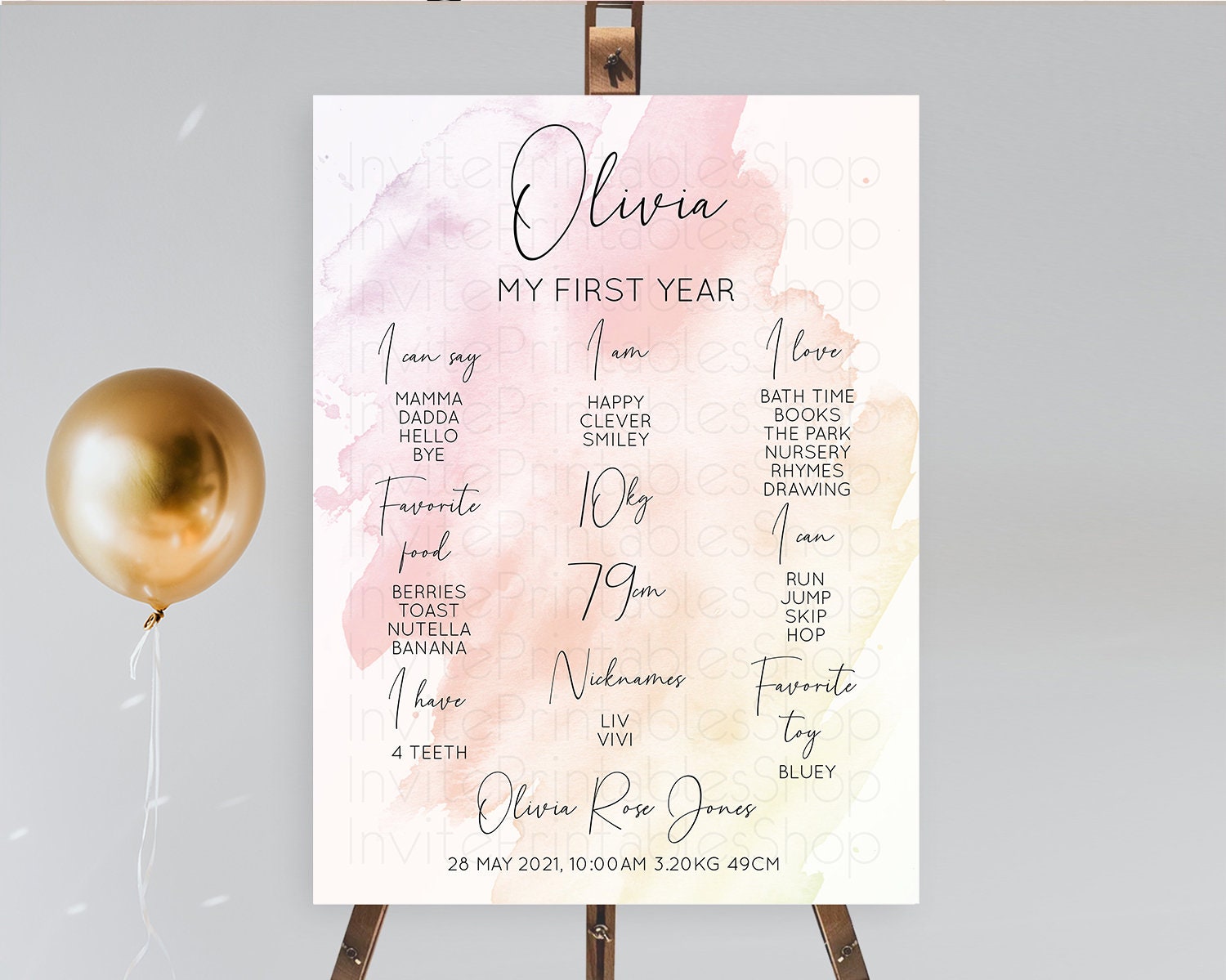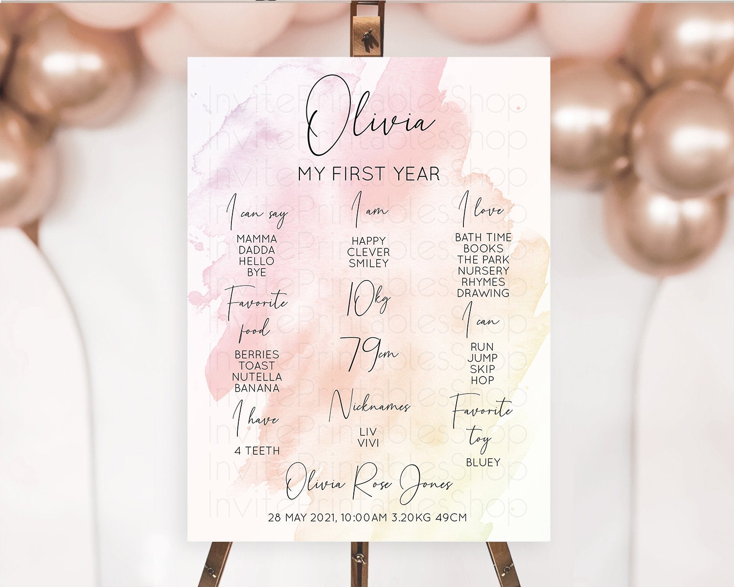 Pink First Birthday Milestone Poster Pink Watercolor Milestone Board Pastel Pink Watercolor Splash Milestone Board 1st Birthday D10164