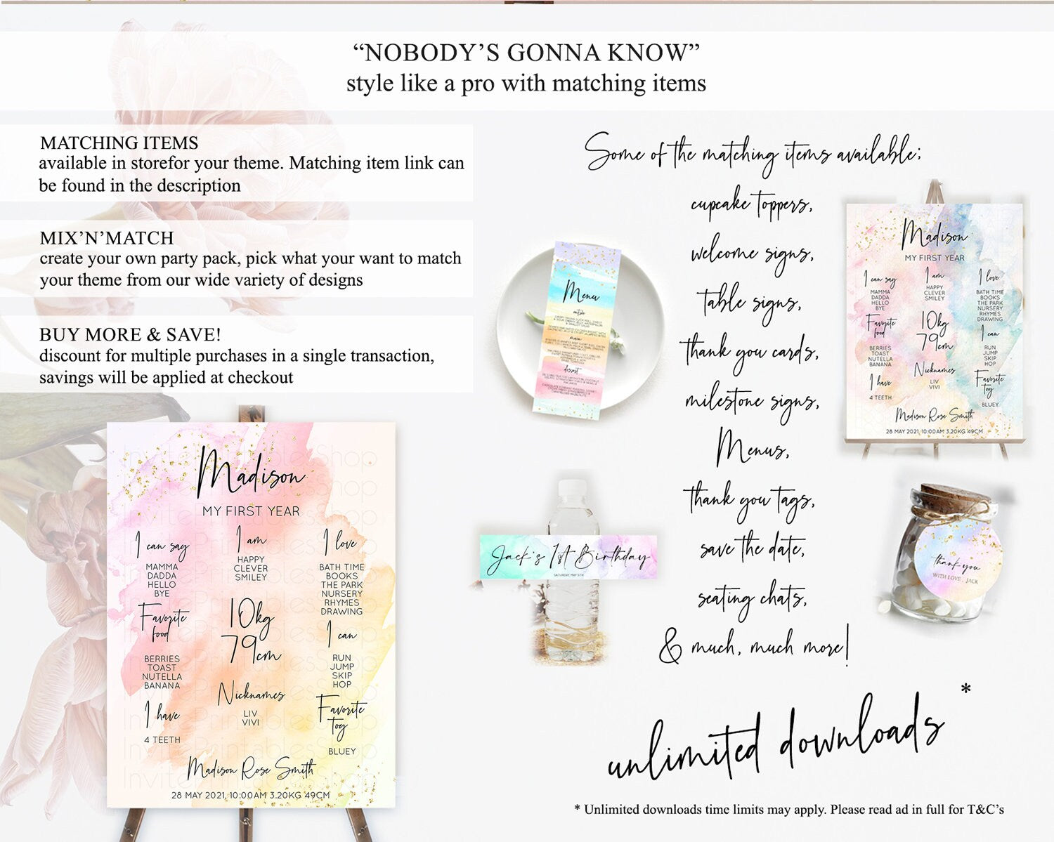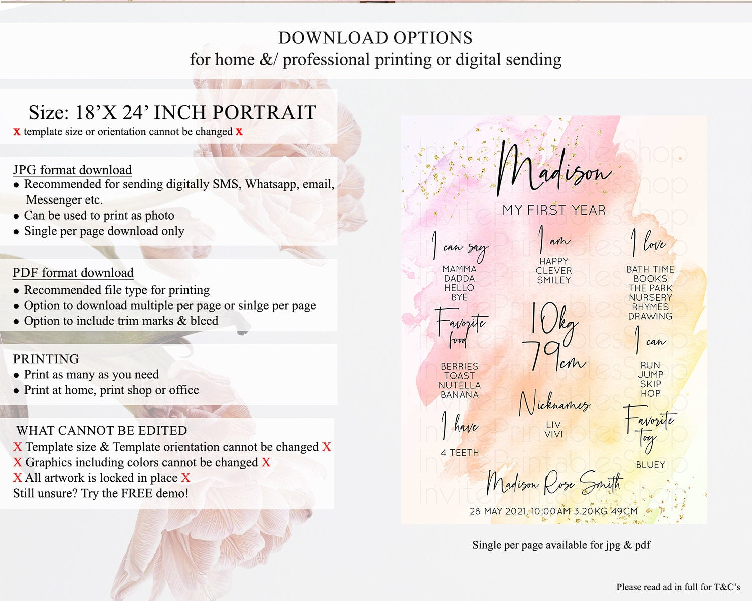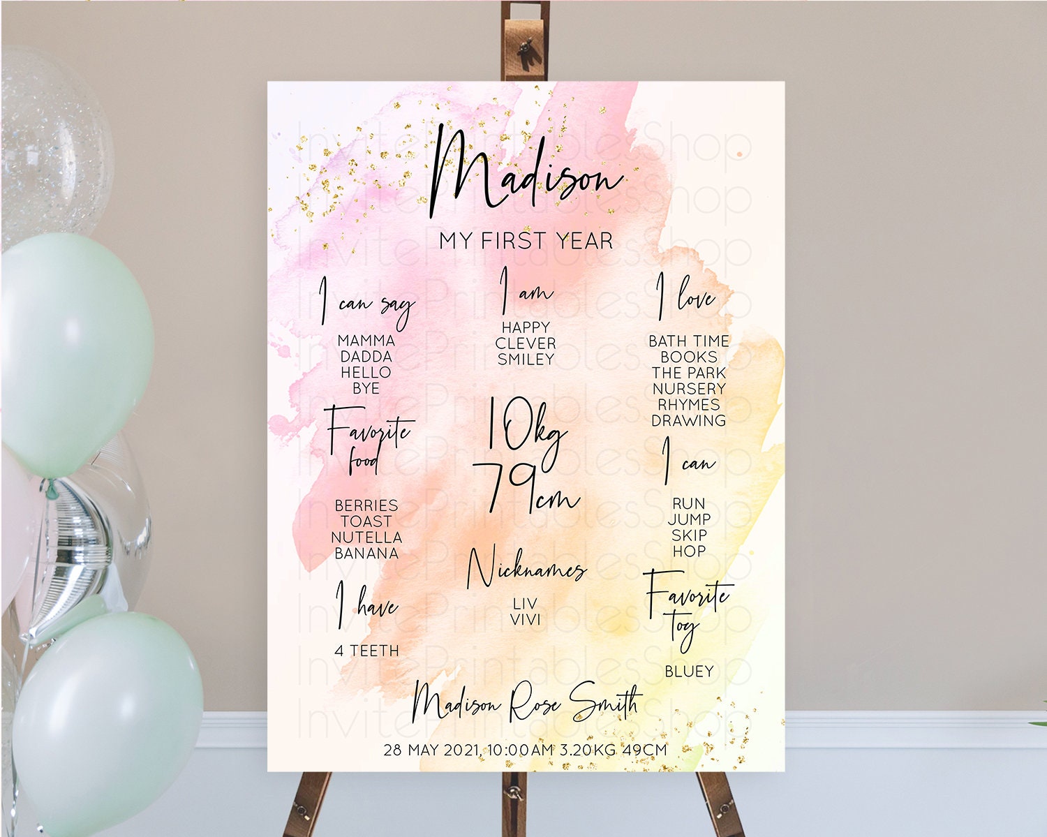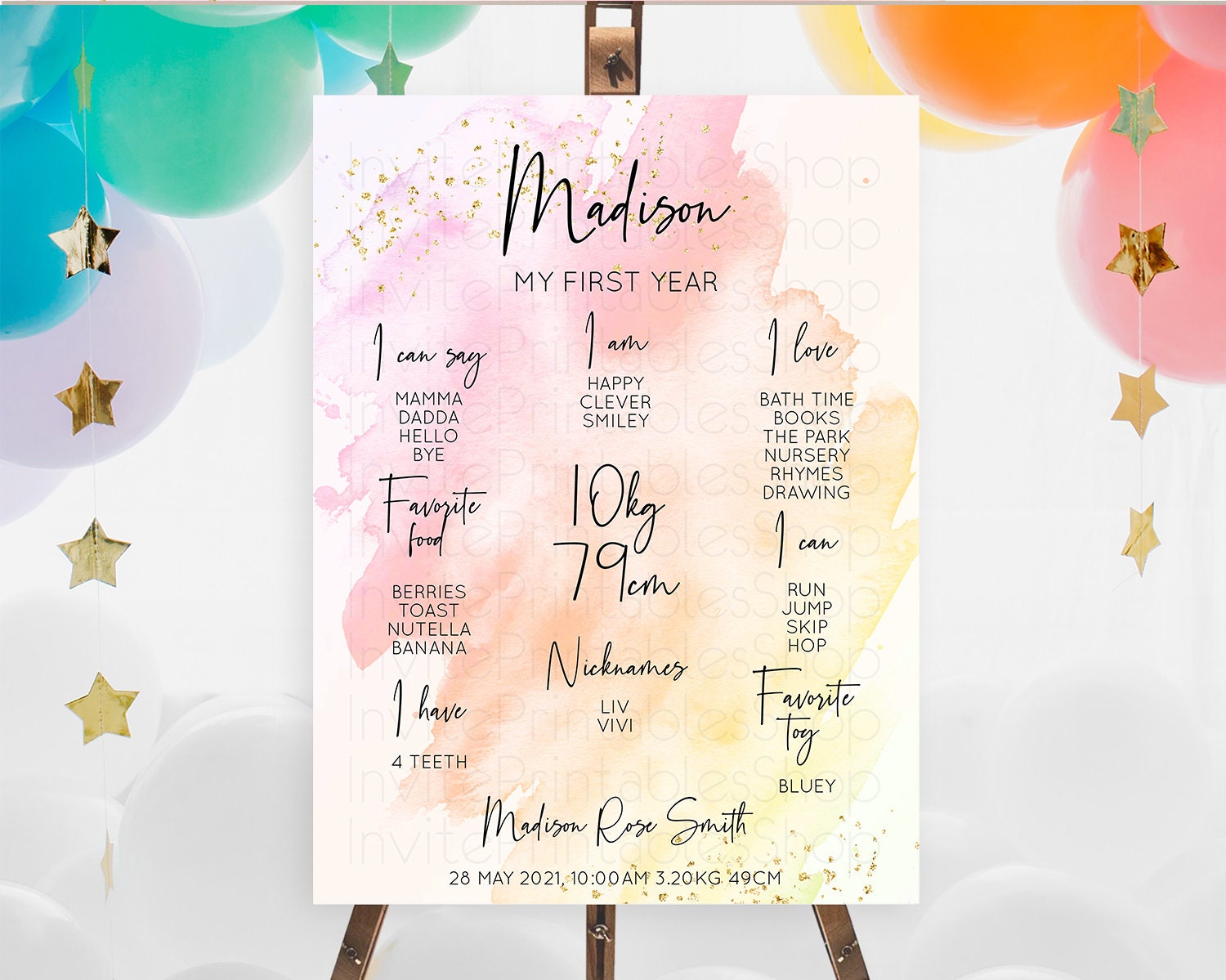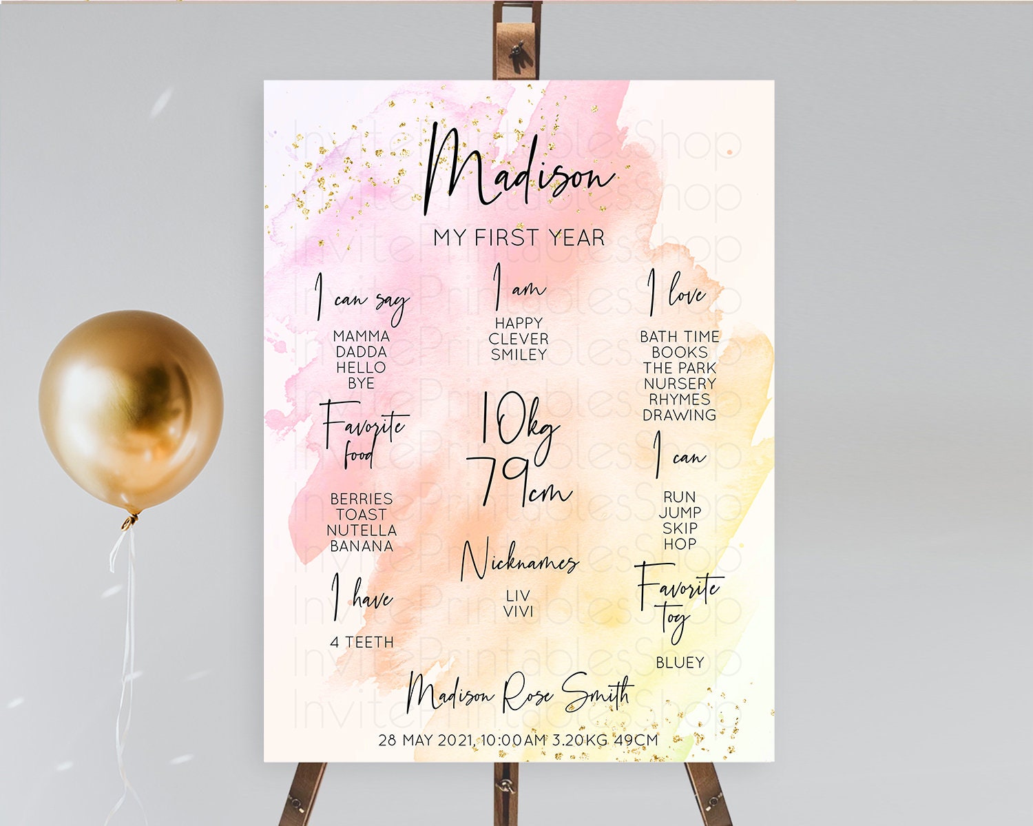 Pink First Birthday Milestone Poster Pink Watercolor Milestone Board Pastel Pink Watercolor Splash Milestone Board 1st Birthday D10167