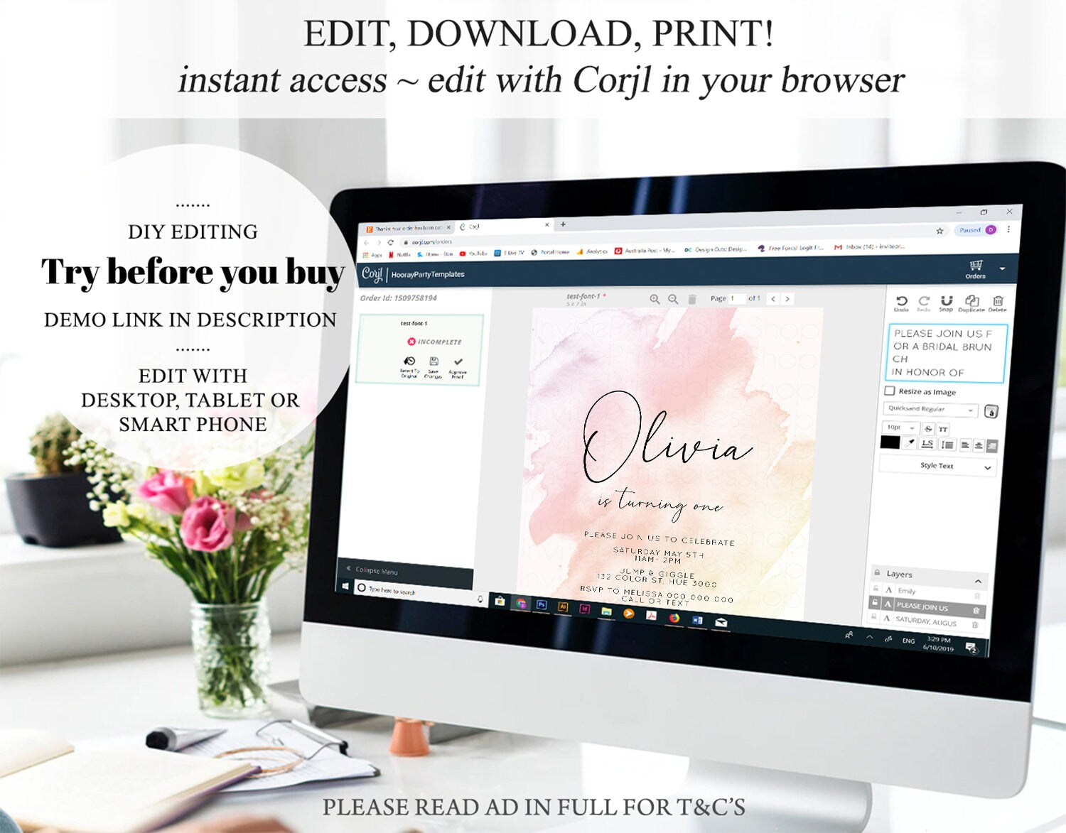 •Try before you buy! • DEMO LINK- https://www.corjl.com/d/61GIGI Matching items: https://etsy.me/3Hy6T4W PLEASE READ AD IN FULL!! •Digital file. No physical item will be shipped •Do it yourself Editing. Edit online with Corjl or Edit with your mobile ITEM DETAILS Invitation size: 5’x7’ File type: PDF, JPEG Resolution: 300DPI PDF FILE OPTIONS: •Recommended for printing •Ability to print multiple per page (if size permits) •Option to include bleed/ trim marks JPG FILE OPTIONS: •Recommended for MMS/ SMS/ Electronic send out •Can be used to print as photo •Option to include bleed/ trim marks EDITING • Do it yourself editing • Mobile editing is available • Google chrome is the recommend browser for Corjl. Please download here for FREE: https://www.google.com/chrome/ • Using other browsers may not show all of Corjl's editing features • Editing on a desktop/ laptop computer is recommended to access all of Corjl features • Mobile editing is available, please use a desktop/ laptop computer to access all of Corjl features DOWNLOADS & EXPIRY •Maximum 3 downloads on the same edit •Link expires 30 days after purchase DOWNLOAD NOTICE •Once you have reached your download limits &/ “approve proof” in Corjl. You will not be able to request further downloads on your design. Further download requests are not permitted WHAT IS EDITABLE •Text - colours, fonts, size, move, delete & rotation. •Please see demo link for what you can and can’t do WHAT YOU CAN’T EDIT •Template size •Template orientation •Graphics CAN NOT BE deleted, moved, or changed in colour •Please see demo link for what you can and can’t do HOW TO 1. Choose design template & checkout on Etsy. 2. Email will be sent from Corjl. Follow link to access template 3. Edit, save & print INSTRUCTIONS •Instructions on how to edit your design have been written by Corjl and will be available with your purchase. PRINTING •Colours can vary depending on the monitor, printer & cardstock •Can be printed at home •Home printing will require you to select the high quality print settings, select appropriate paper thickness & click "Actual size" prior to you printing •This design was test printed on 100 gsm paper •Can be printed at local print shop. Please check printing requirements & any printing restrictions prior to purchase PERSONAL USE ONLY. This item cannot be shared, re-sold, or used commercially for profit. REFUND POLICY •We are unable to provide a refund/ exchange on commenced & completed work, instant downloads or self-editing link templates. Please use the demo link to work out if this product is right for you. Copyright © 2018 by InvitePrintablesShop PTY LTD All rights reserved. This file or any portion thereof may not be reproduced or resold without the express written permission of the publisher (including edits to the design). Our files are provided as high-resolution PDFs – the end result is dependent upon the printer and paper used. If using a professional printing company, InvitePrintablesShop are not responsible for their specific printing requirements, paper or colour quality. Any changes required to the template are not included with your purchase – the files come as described in the listing only and cannot be changed. Thank you for visiting Invite Printables Shop:)