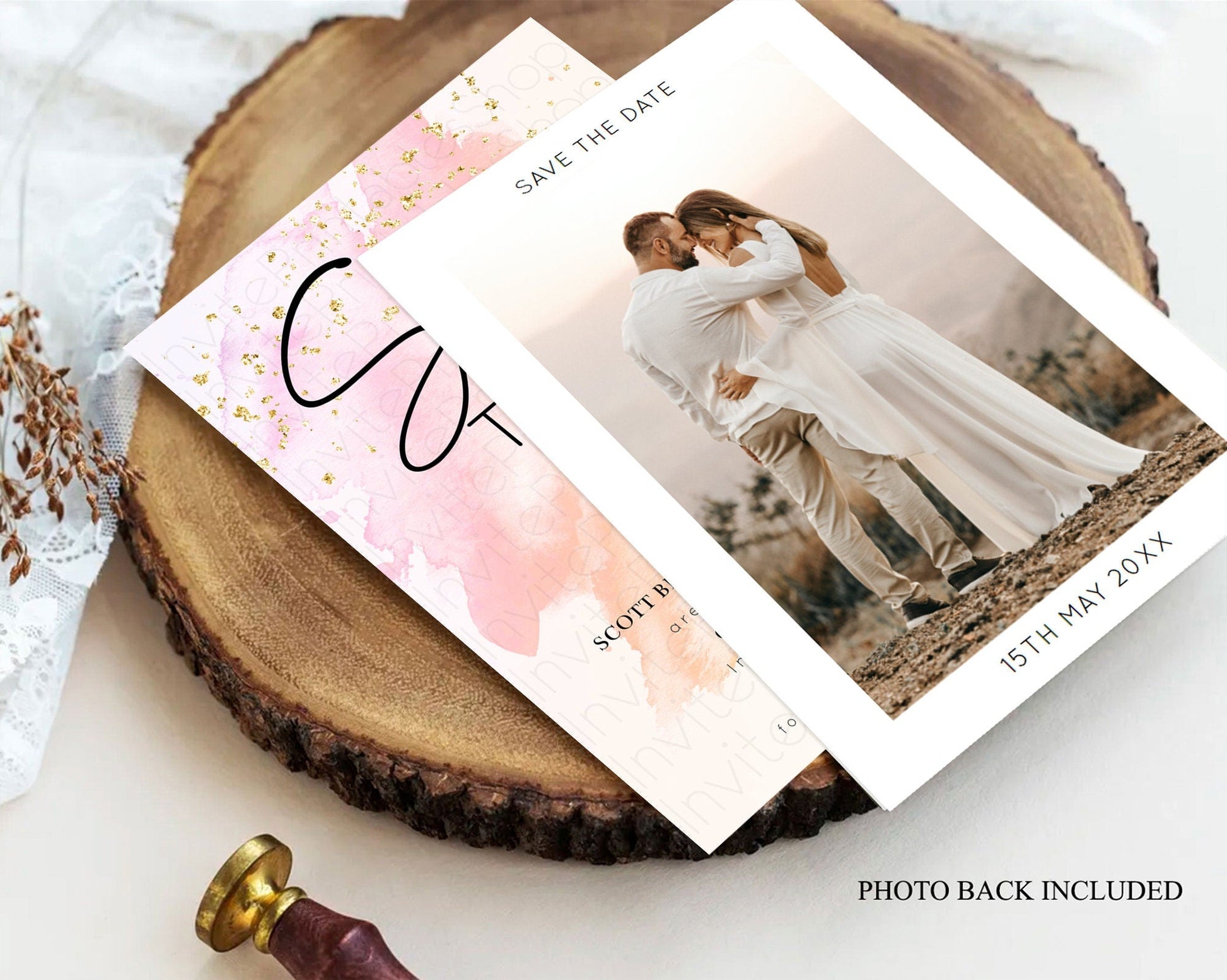 Pink watercolor save the date card