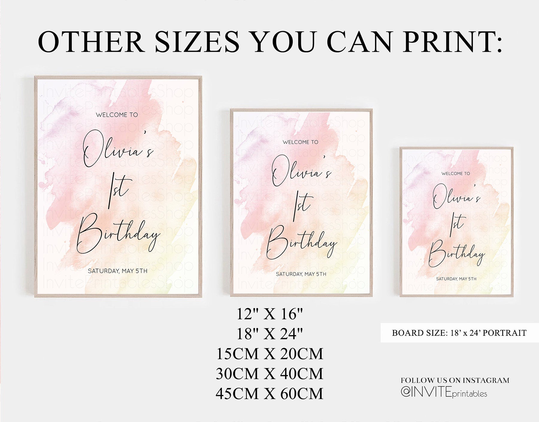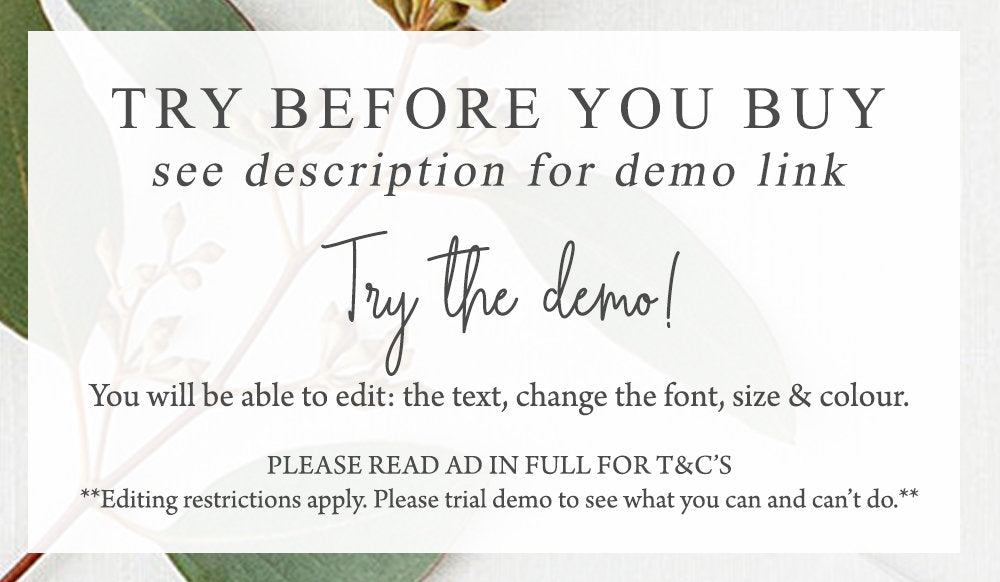 Copyright © 2018 by InvitePrintablesShop PTY LTD All rights reserved. This file or any portion thereof may not be reproduced or resold without the express written permission of the publisher (including edits to the design). Our files are provided as high-resolution PDFs – the end result is dependent upon the printer and paper used. If using a professional printing company, InvitePrintablesShop are not responsible for their specific printing requirements, paper or colour quality. Any changes required to the template are not included with your purchase – the files come as described in the listing only and cannot be changed.